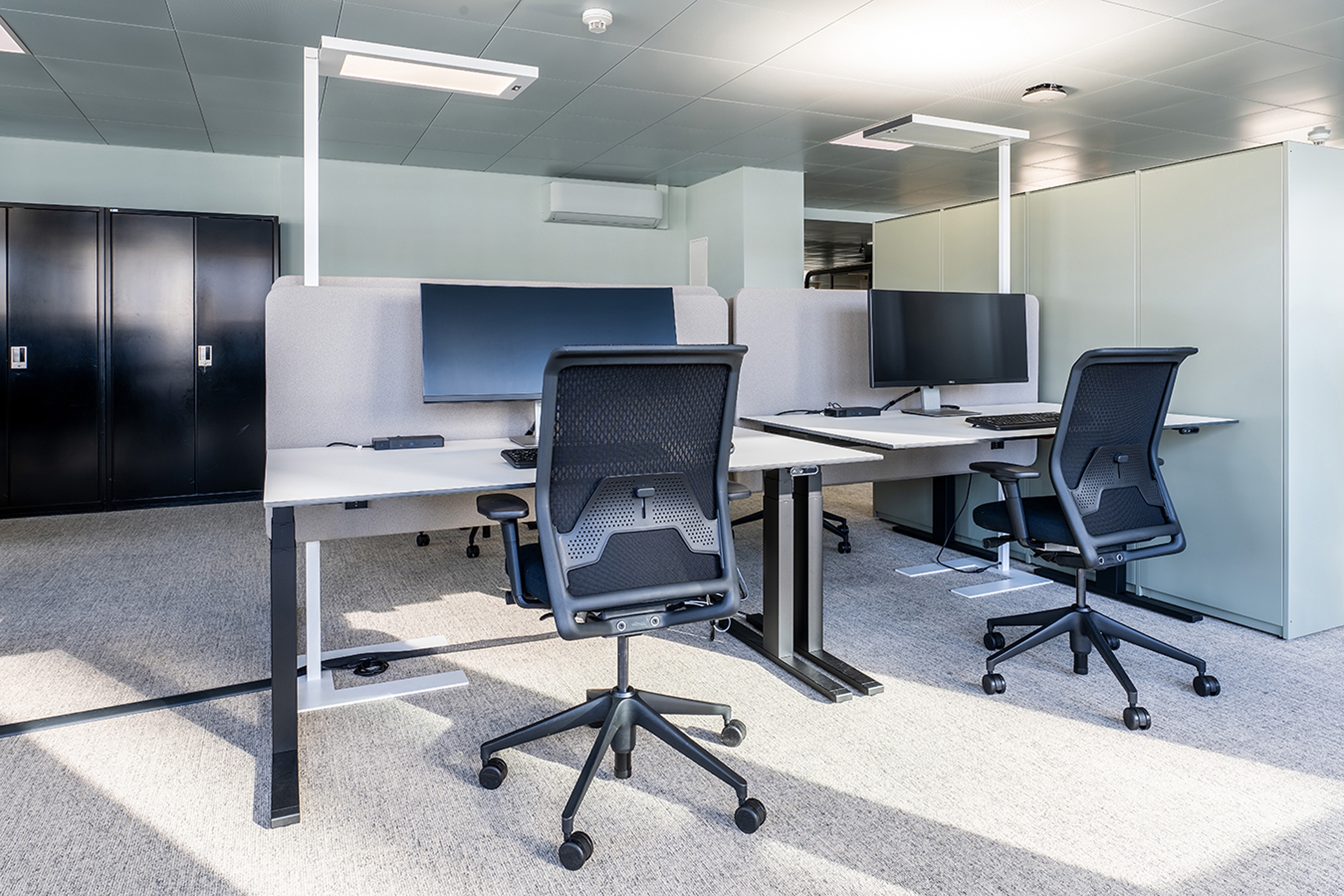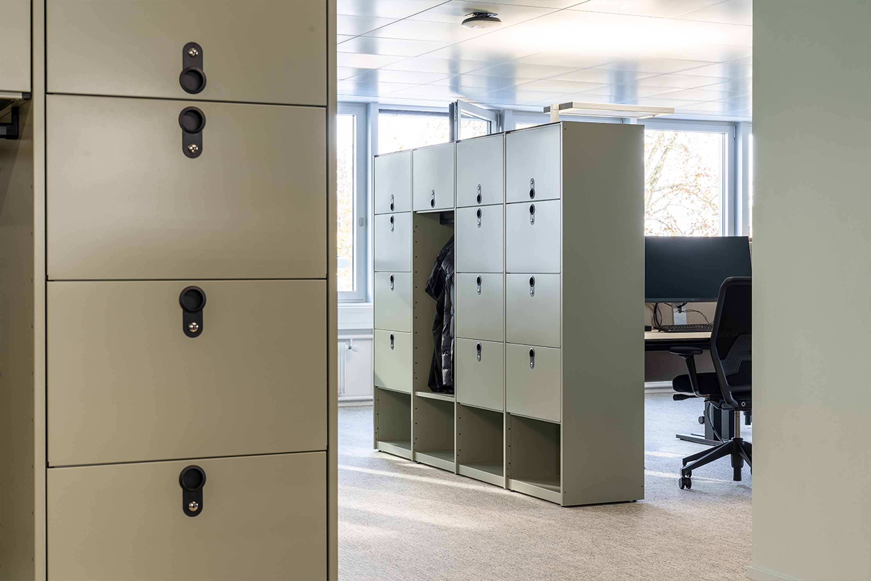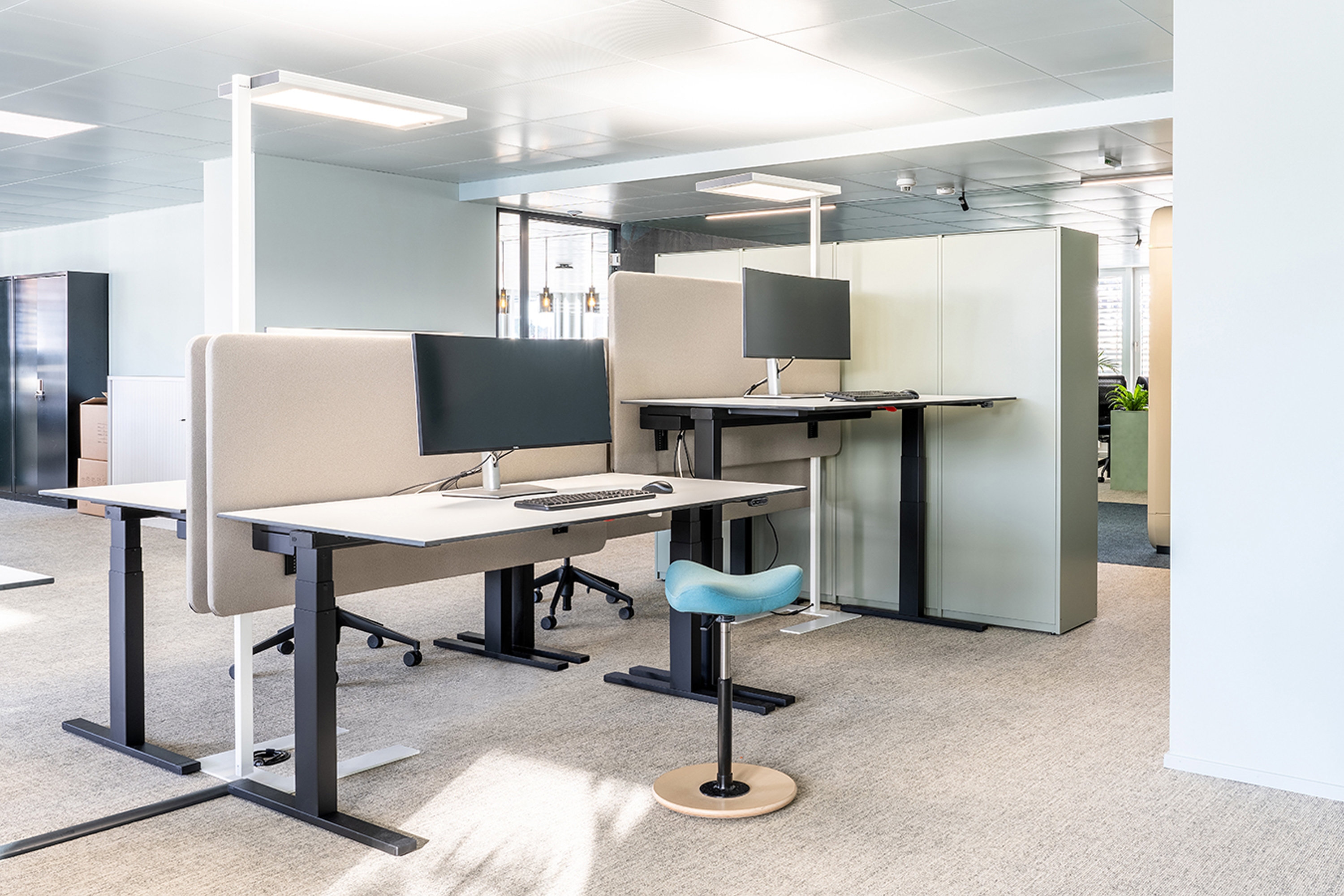 Eine verbesserte Akustik und ein stimmiges, weiches Farbkonzept runden die neue harmonische Arbeitsumgebung ab. Sanfte Grün- und dunkle Türkisblautöne gepaart mit hellen Blautönen schaffen eine angenehm beruhigende Atmosphäre, welche die Kreativität, die Konzentration und somit die Produktivität fördert. Das Farbkonzept wird unterstützt von mintgrünen und olivbraunen Schliessfächern sowie hellbraunen Regalsystemen, die allesamt raffinierten Stauraum bieten.