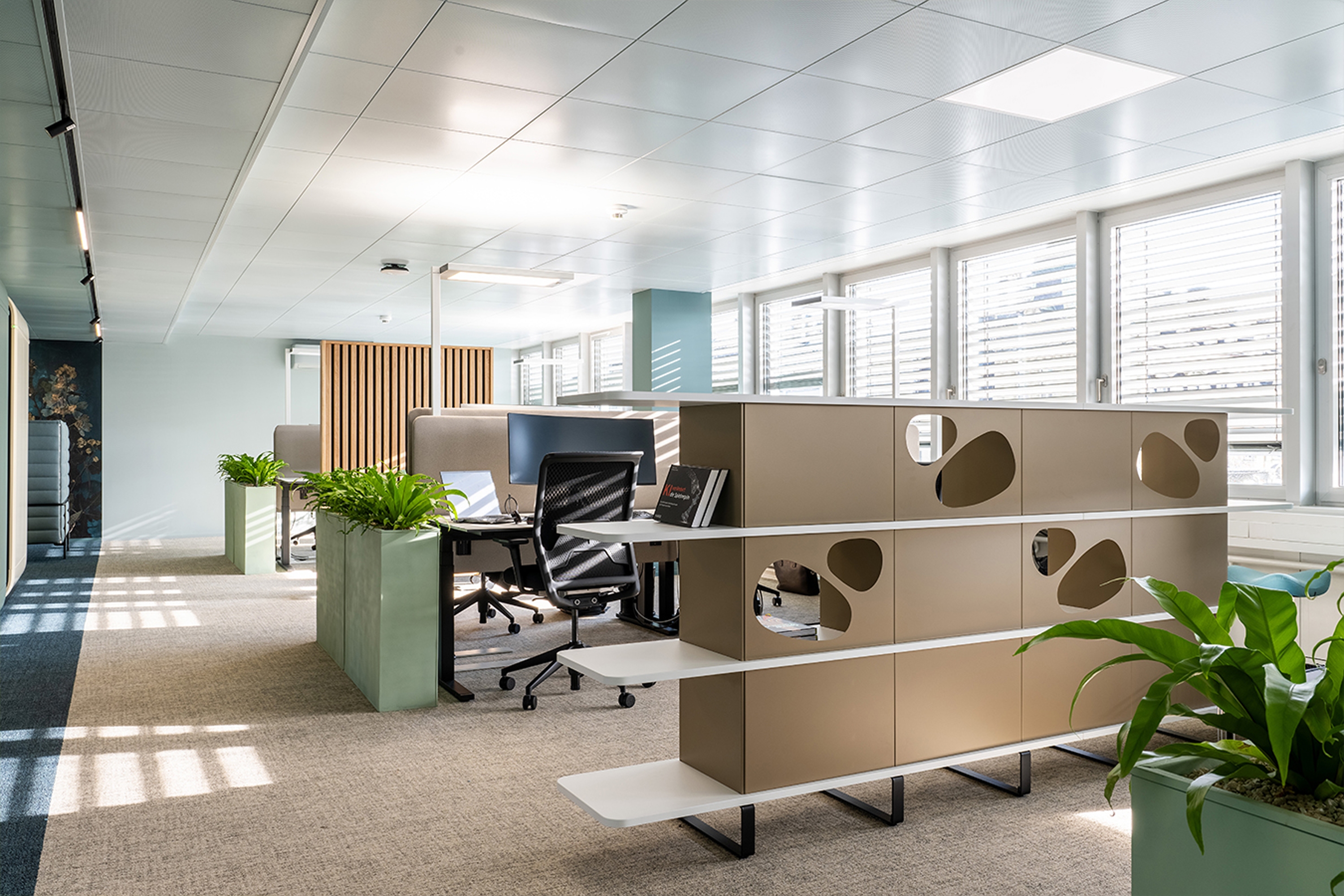 Zusammen mit den Pflanzen steigern die sanften Grün-, Blau- und Erdtöne das Wohlgefühl im Büro