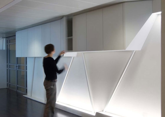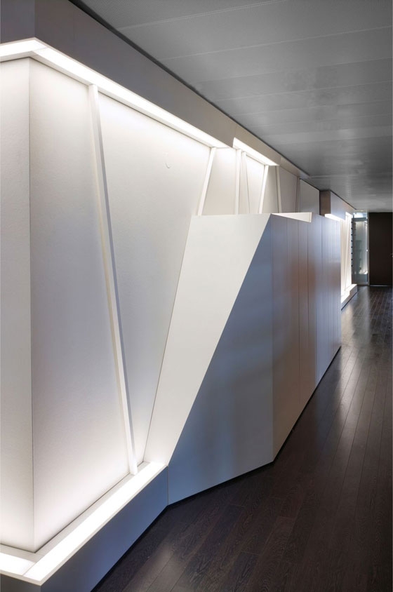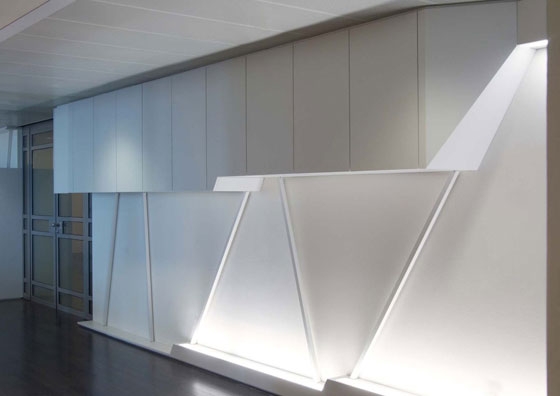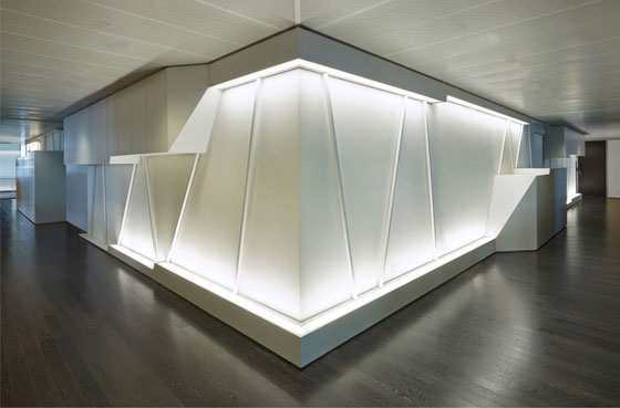 Das skulpturale Kernobjekt hat seinen Ursprung mit einer leuchtenden Logo-Wand im Inneren des Kernes. Die dynamische Formensprache dieser Wand erzeugt die endlose Bewegung, die an den Wänden des Kernes entlanggeführt wird. Die hervortretenden Elemente sind als Schrankelemente ausgeführt, um dem Kernobjekt außer dem visuellen Aspekt noch eine Funktion zu geben. Die Kombination von Erschließungsführung und Funktion schafft dadurch eine intuitive Ablesbarkeit des Objektes, und dadurch unbewusst als Orientierungs- bzw. Bezugspunkt wahrgenommen.