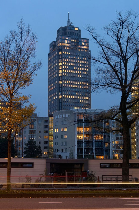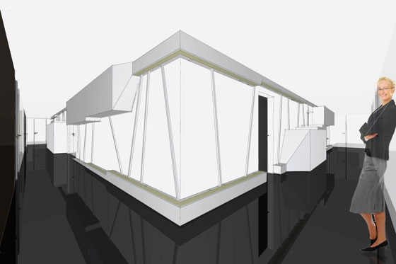 Als Ansatz bei diesem Projekt dient der Erschließungskern, den wir durch Anspielung an seine ursprüngliche Funktion zu einem eigenständigen Objekt werden lassen. Unser Entwurf aktiviert den Raum um den Kern, und lässt durch die zusätzliche Dimension der Zeit, in diesem Fall das Gehen bzw. die Distanz, die zurückgelegt wird, mit jedem Ändern der Perspektive einen neuen Raumeindruck entstehen. Um das Herumlaufen um den Kern zu „provozieren“, haben wir Elemente nach dem Windmühlenprinzip um den Kern angeordnet, wobei die oberen und unteren Elemente gegenläufige Drehrichtungen erhalten. Durch das an allen vier Wänden wiederholte Prinzip und die relativ kurze Wiederholungsfrequenz beim Begehen entsteht beim Besucher intuitiv die Begierde, der Skulptur zu folgen.