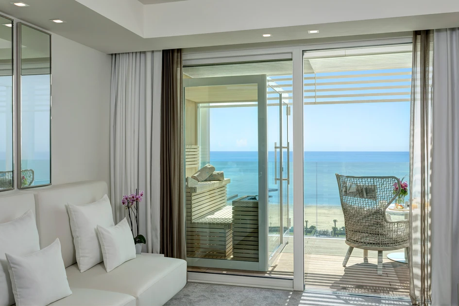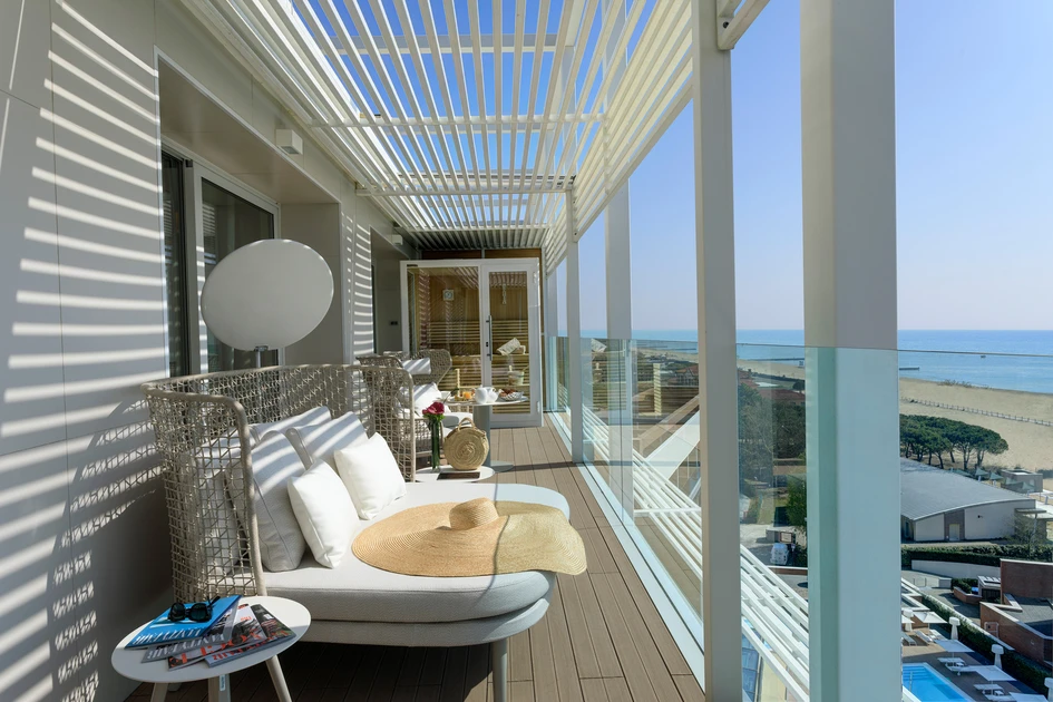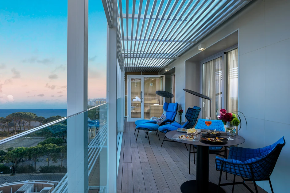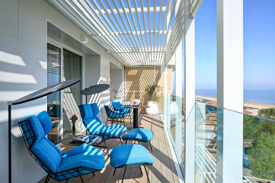 Varaschin-Produkte statten die Terrassen der Suiten mit bequemen Stühlen, Sesseln und Liegen aus, um nach einem Tag am Strand zu entspannen. Der Poolbereich ist von Sonnenliegen aus der Victor-Kollektion umgeben, die ein wesentliches und funktionales Design aufweisen. Für den Barbereich mit Blick auf den Pool wurden Tische und Sessel aus verschiedenen Varaschin-Kollektionen ausgewählt: insbesonders Smart mit seiner schlichten Eleganz und den sanften Farben und Maat mit seinem unverwechselbarem Stil und den leuchtenden Farben.