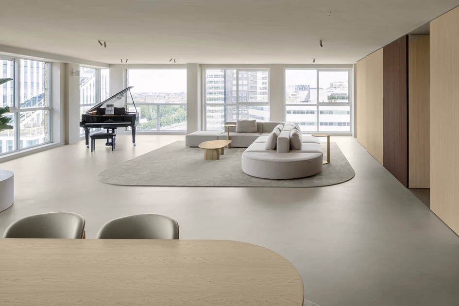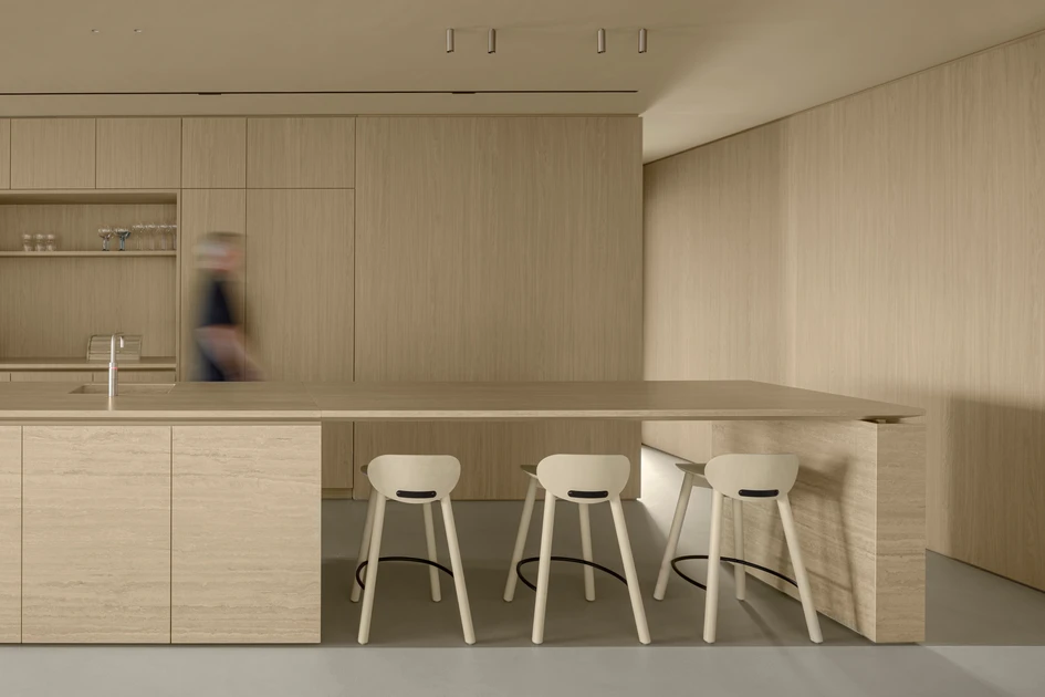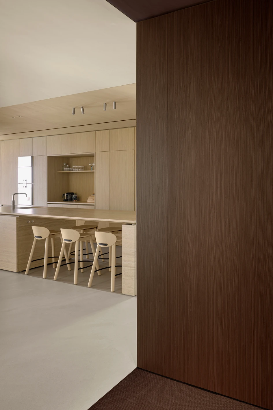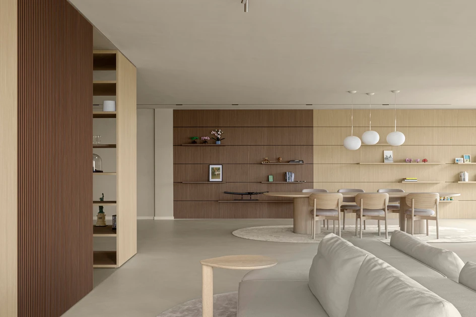The open-plan layout is thoughtfully curated, with custom-designed elements defining distinct living areas while maintaining an airy, cohesive flow. Spanning 300m², the apartment features expansive wooden surfaces and rich textures that exude a luxurious, contemporary feel. Upon entering, a hallway marked by dark, elegant tones provides a striking contrast to the light, open atmosphere of the kitchen and living spaces beyond. The interior reveals the i29 signature approach, with a graphical play that highlights distinct areas and adds a unique, refined touch.