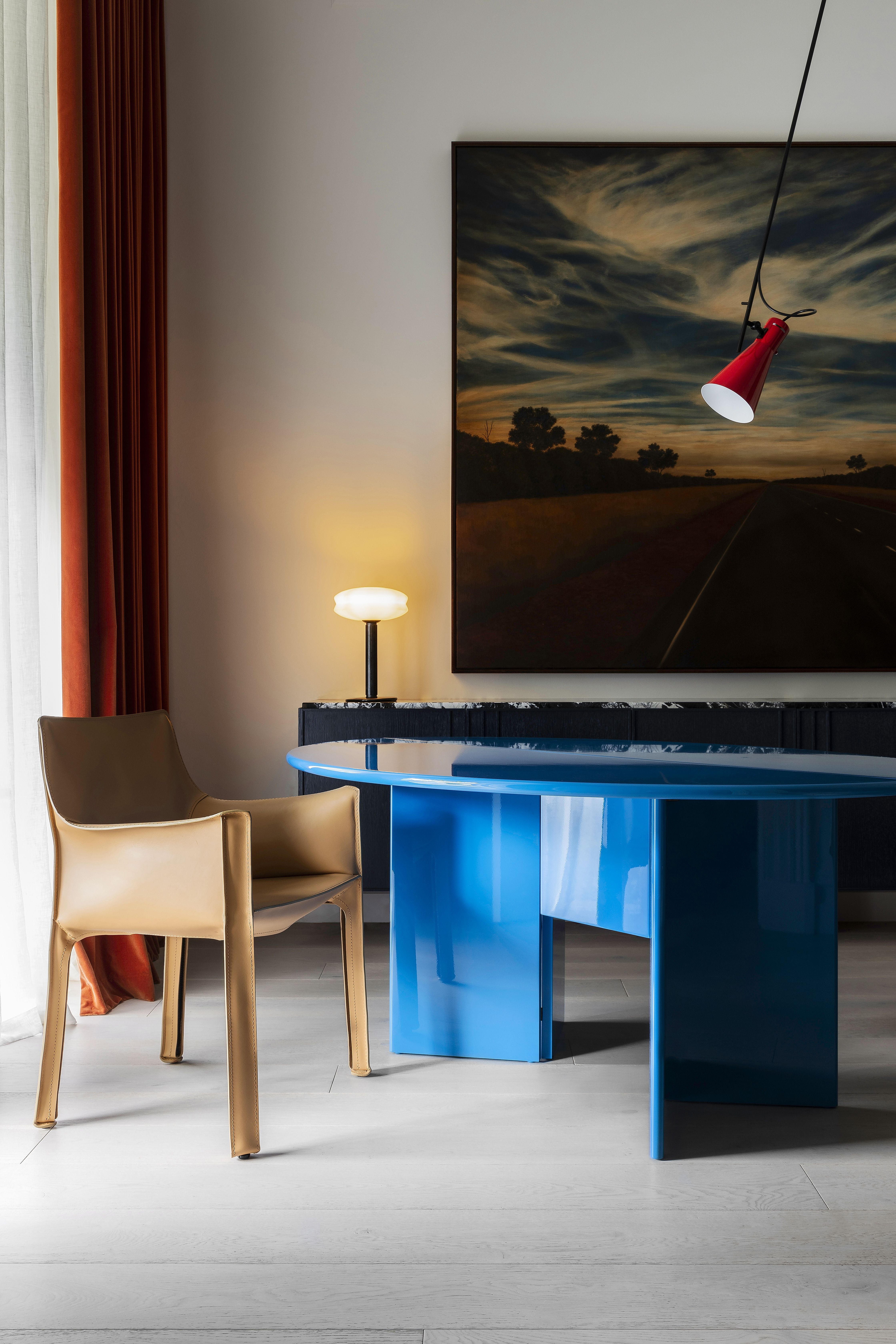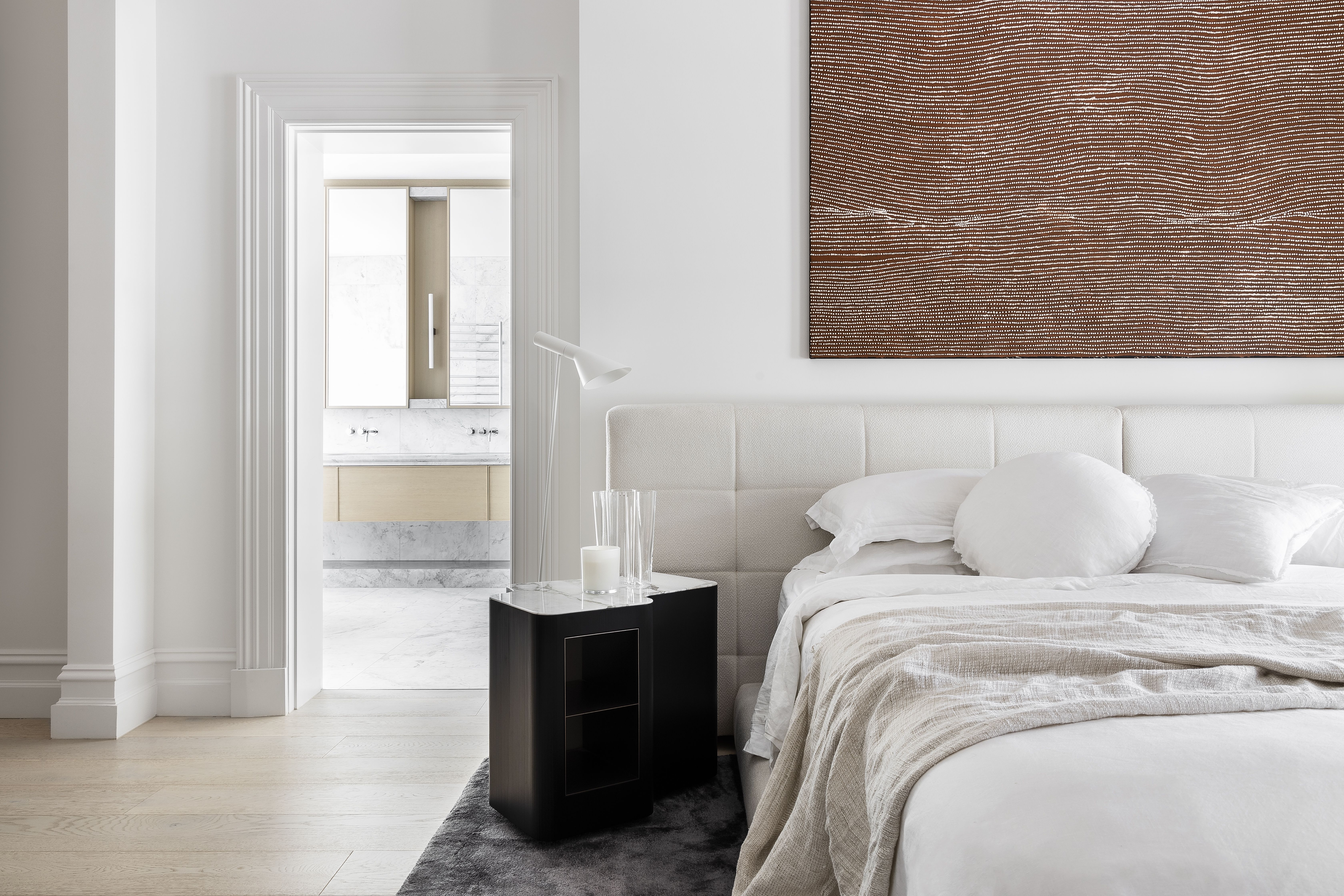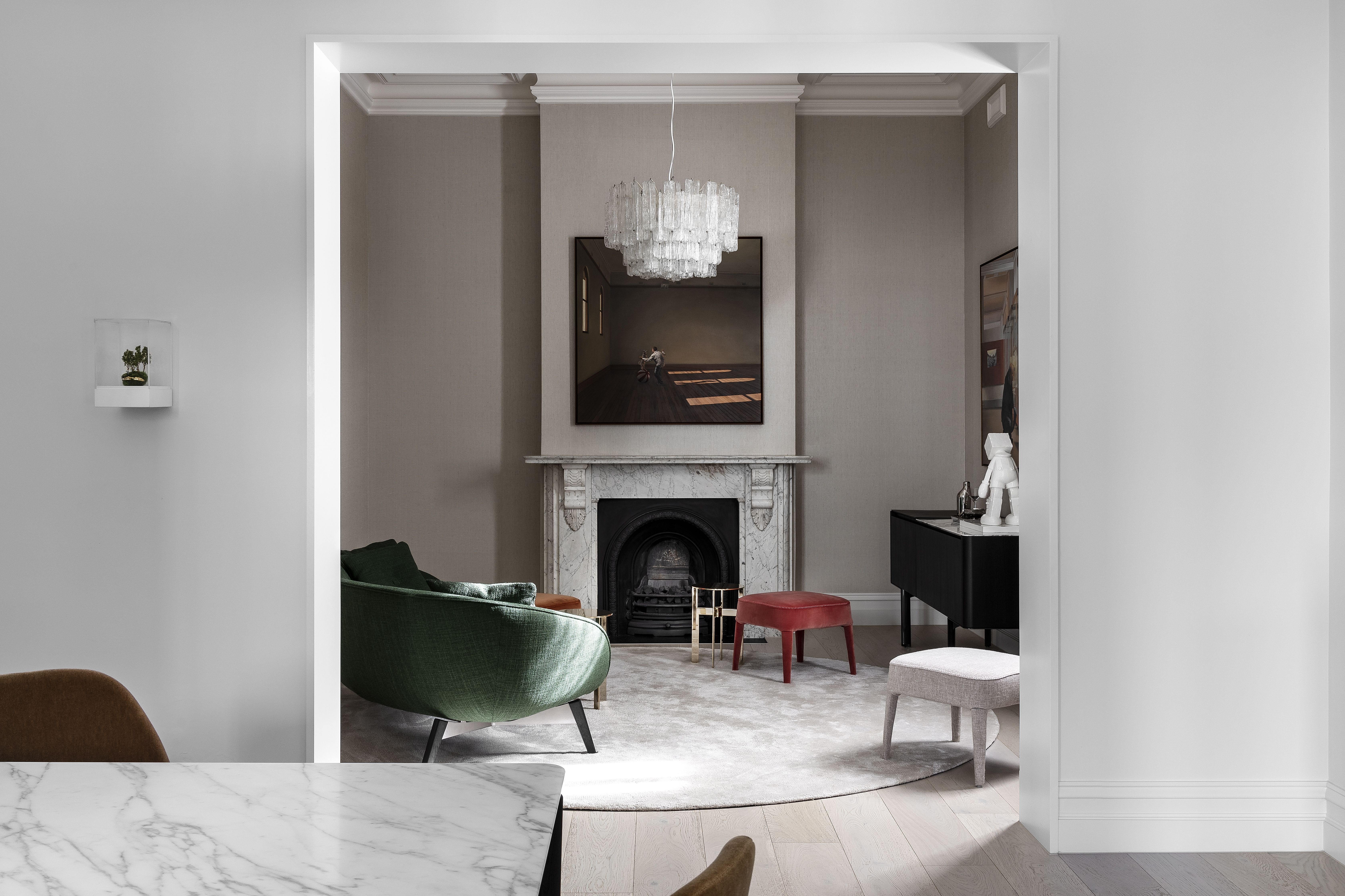 The joinery insertions create the top notes with moments of unexpected colour, some highly figured stone and intricate detailing, all balanced against the background palette. Furniture selections also range from neutral to exuberant, again in balance with the overall palette and artwork.