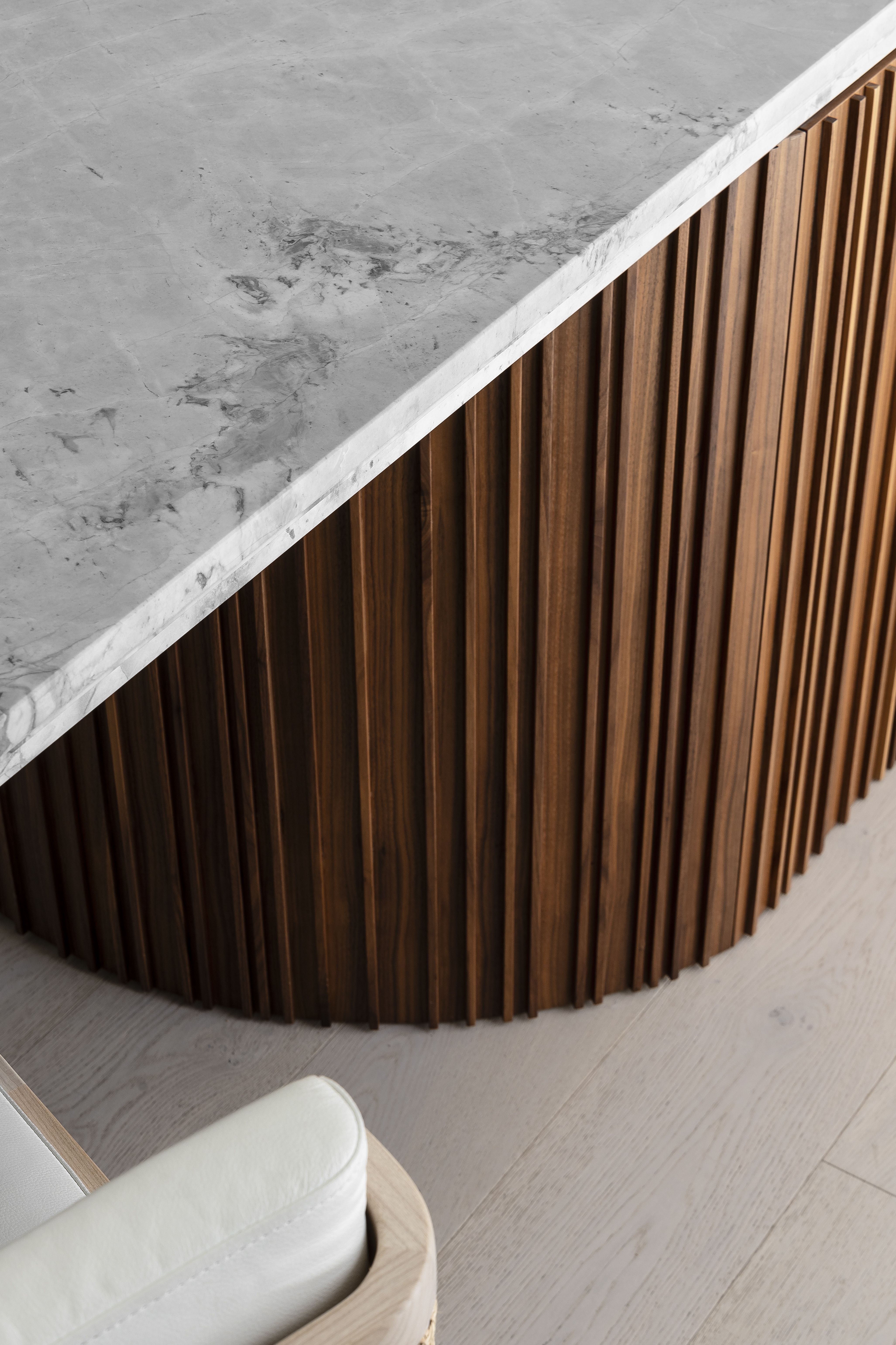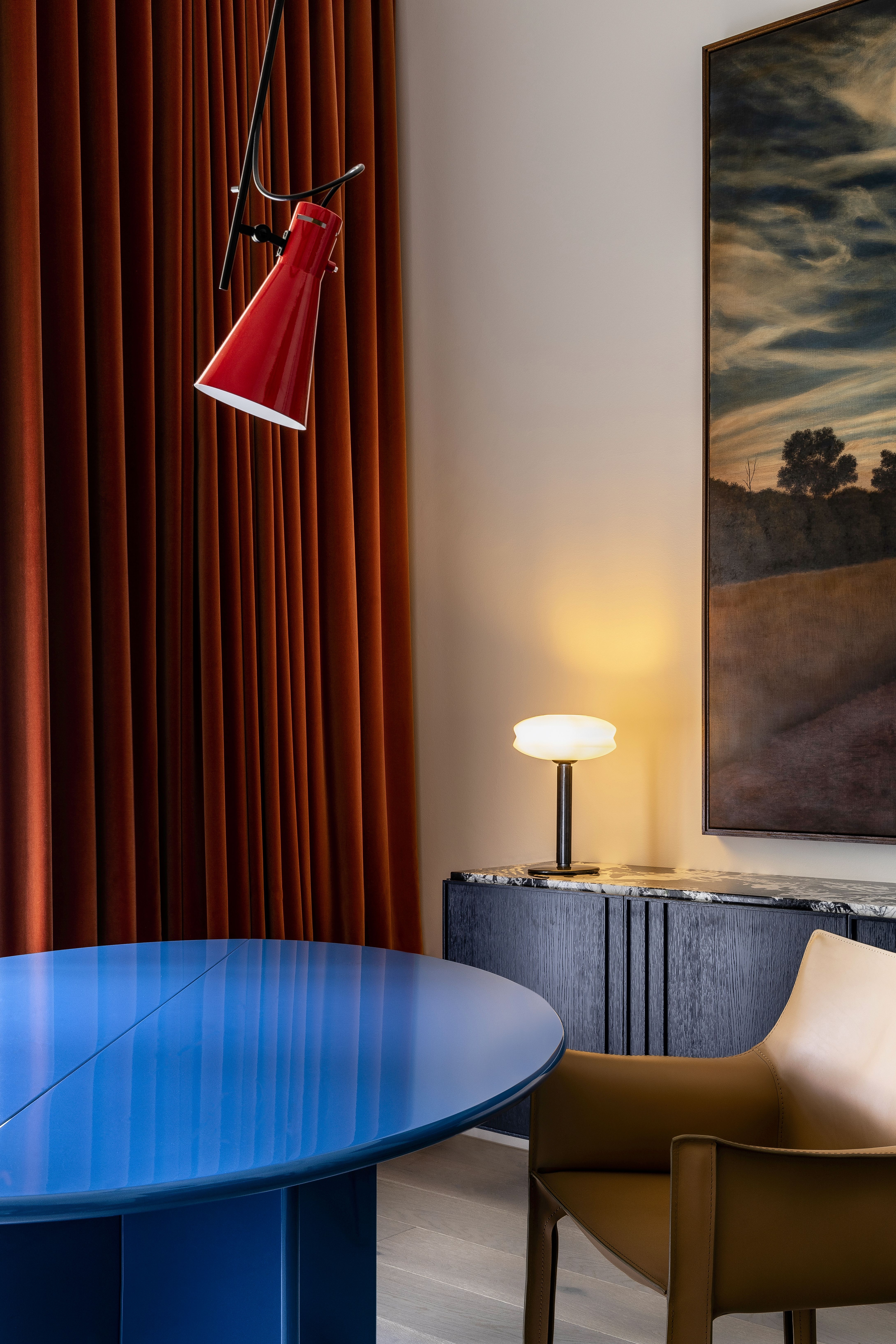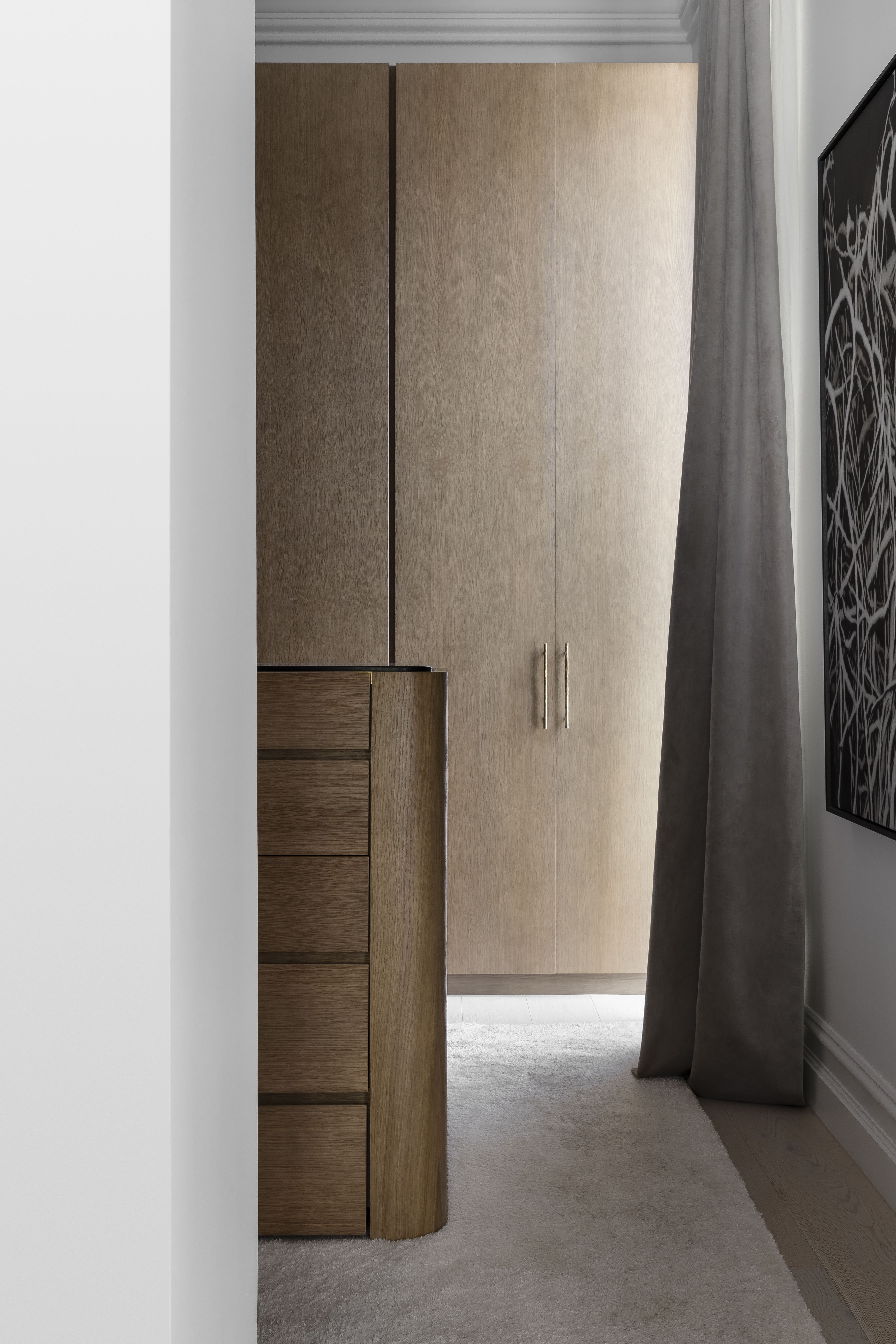 The joinery insertions create the top notes with moments of unexpected colour, some highly figured stone and intricate detailing, all balanced against the background palette. Furniture selections also range from neutral to exuberant, again in balance with the overall palette and artwork.