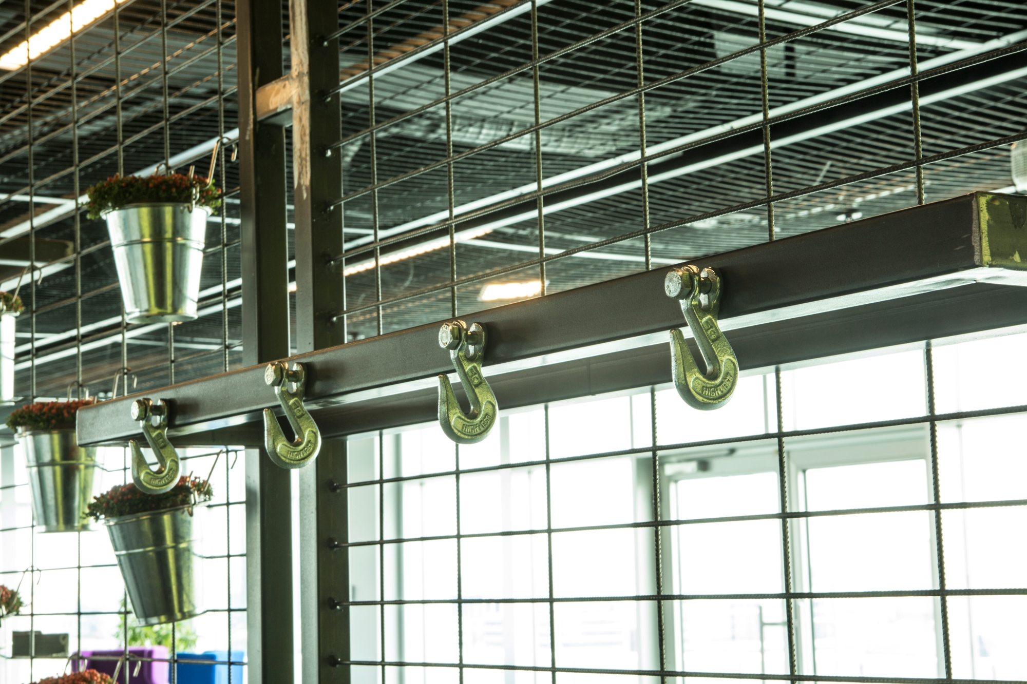 The indoor sections separated from one another by removable components have been equipped with functions enabling meetings, presentations, and internal dialogues to be made without disturbing the other employees. Decorative flowerpots and multi-purpose hooks have been hung on the wire meshes used as separators between the sections.