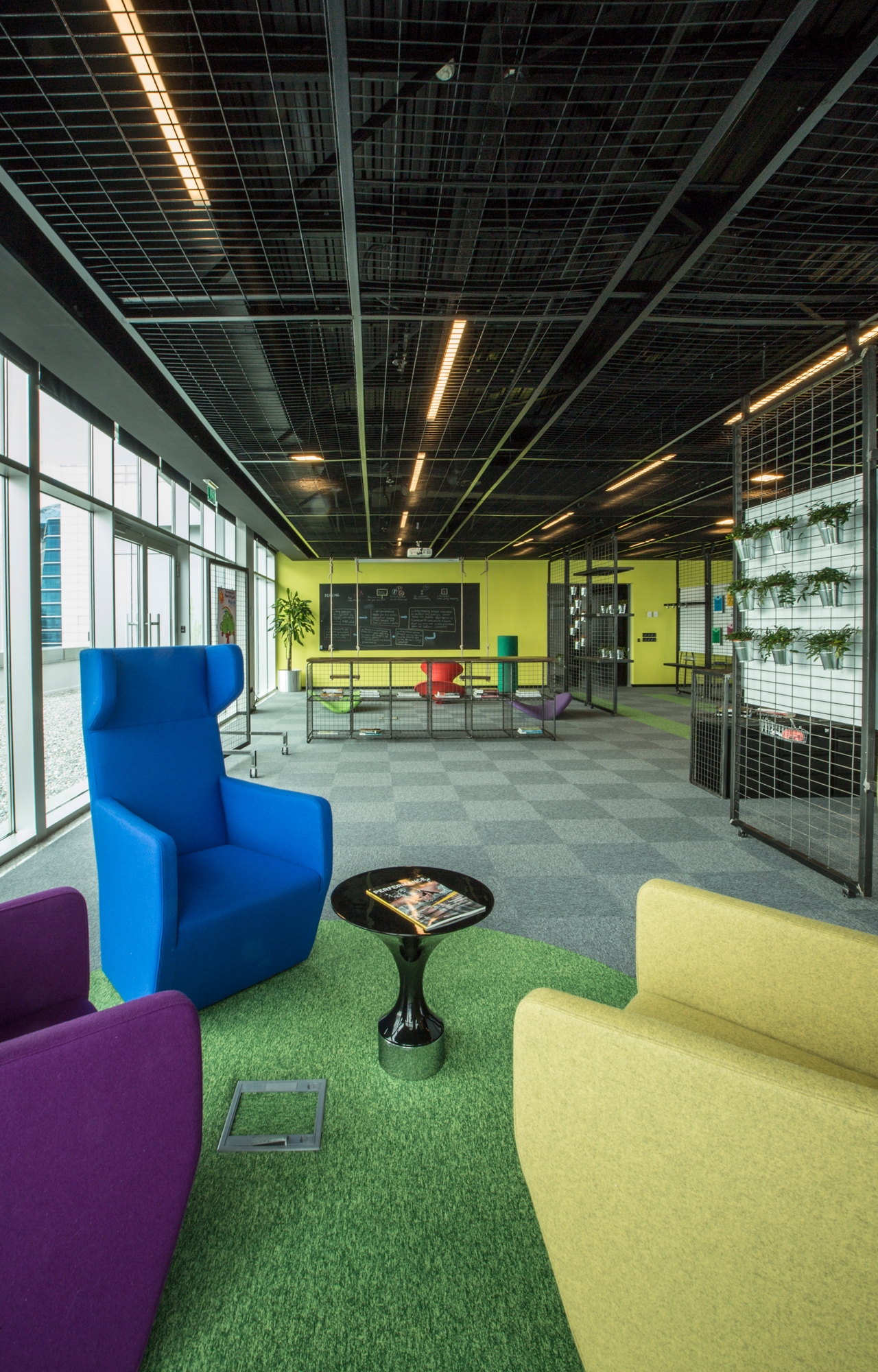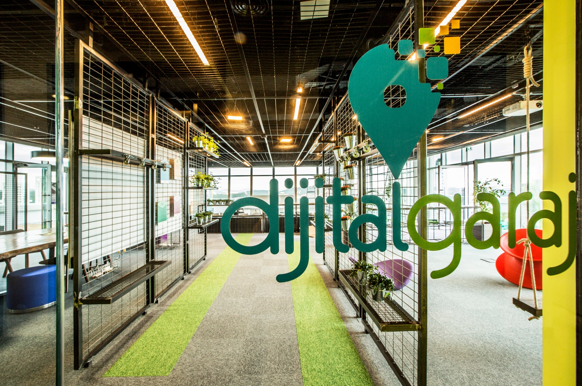 The AvivaSA Digital Garage office where institutional colors such as blue, green and yellow have been used evenly has developed a dynamic identity with linear ceiling lightings. Everything that needs to exist in an office, from file cabinets to a cloakroom, from caissons to desks, have been placed in an industrial style at the AvivaSA Digital Garage office, and also enjoyable meeting corners have been created for working comfortably and productively.