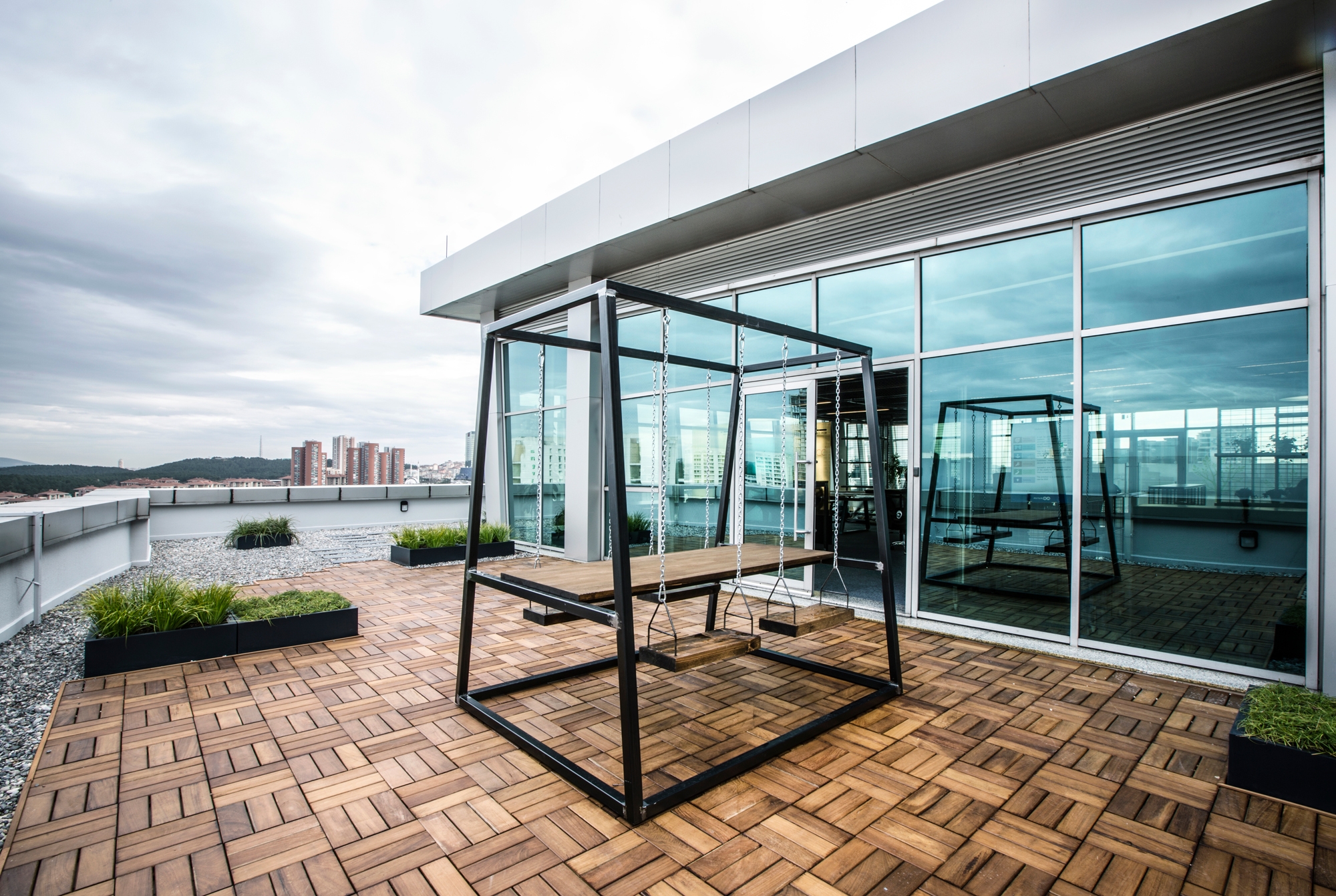 This area, which has been furnished with a swing and specially designed moving chairs, has been planned as an area where the employees can sit, taking only their laptops for presentations and intimate meetings. The sitting unit, made up of swings placed around a fixed table on the terrace on the other hand allows the users to have colorful and creative experiences.