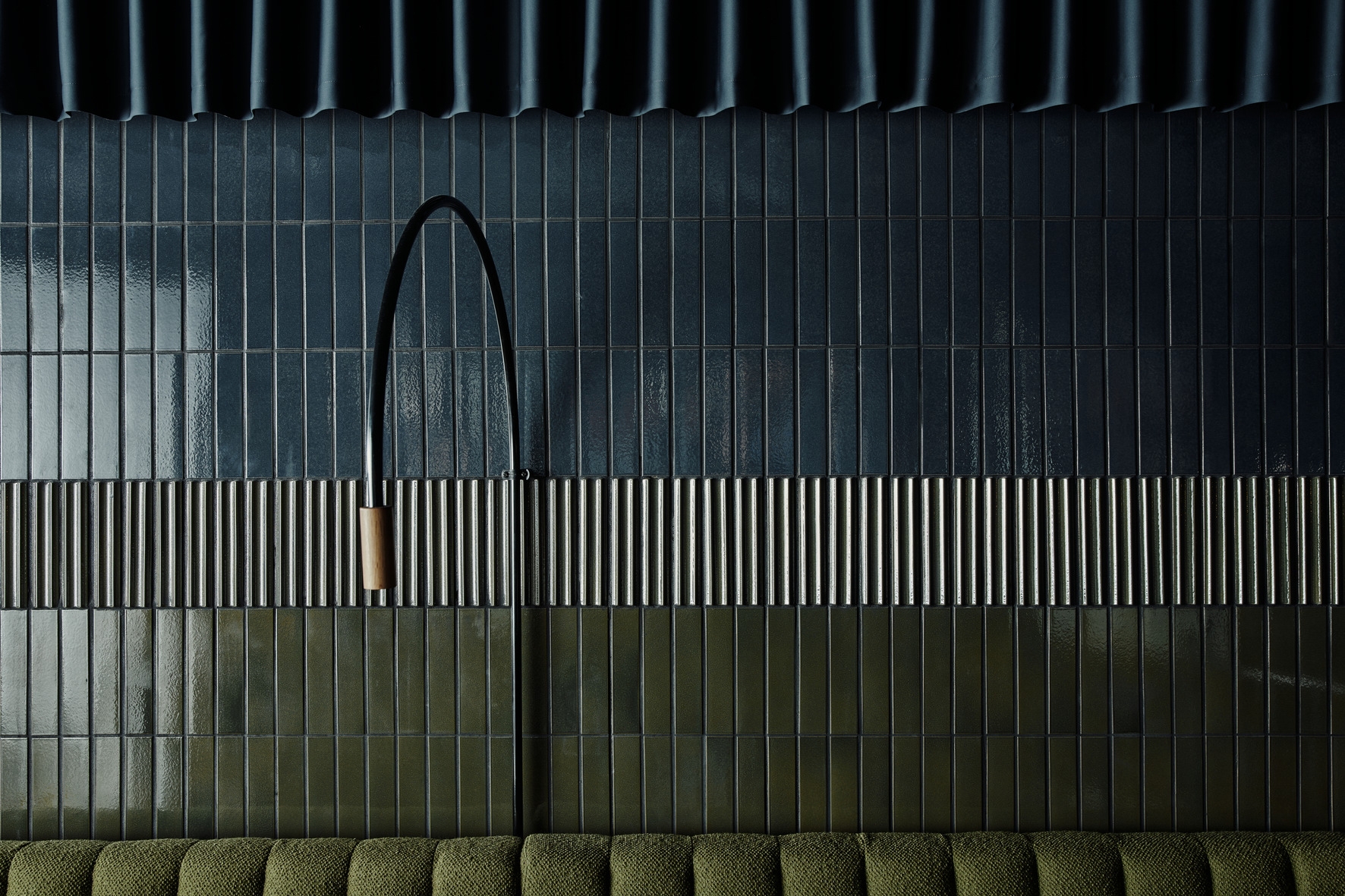 Craft ist in verschiedenen Varianten und Farben erhältlich. Fyra entschied sich für die Variationen Mittelgrau, Olivgrün geflammt und Benitblau. Die auf mittiger Höhe eingesetzten Riemchen mit Wellenprofil (ebenfalls olivgrün) geben der Wand eine rhythmisch-dreidimensionale Gliederung und erzeugen je nach Lichteinfall unterschiedliche optische Effekte. Wohl austariert adaptieren sowohl die Polsterung der Sitzbank, die Wandleuchten als auch die Falten des darüber hängenden mehrschichtigen Vorhangs die Textur des Riemchenformats. In der Summe entstand so eine stylishe und dennoch zwanglos-intime Cocktailbar sowie ein einzigartiges, in sich stimmiges Gesamt-Kunstwerk.