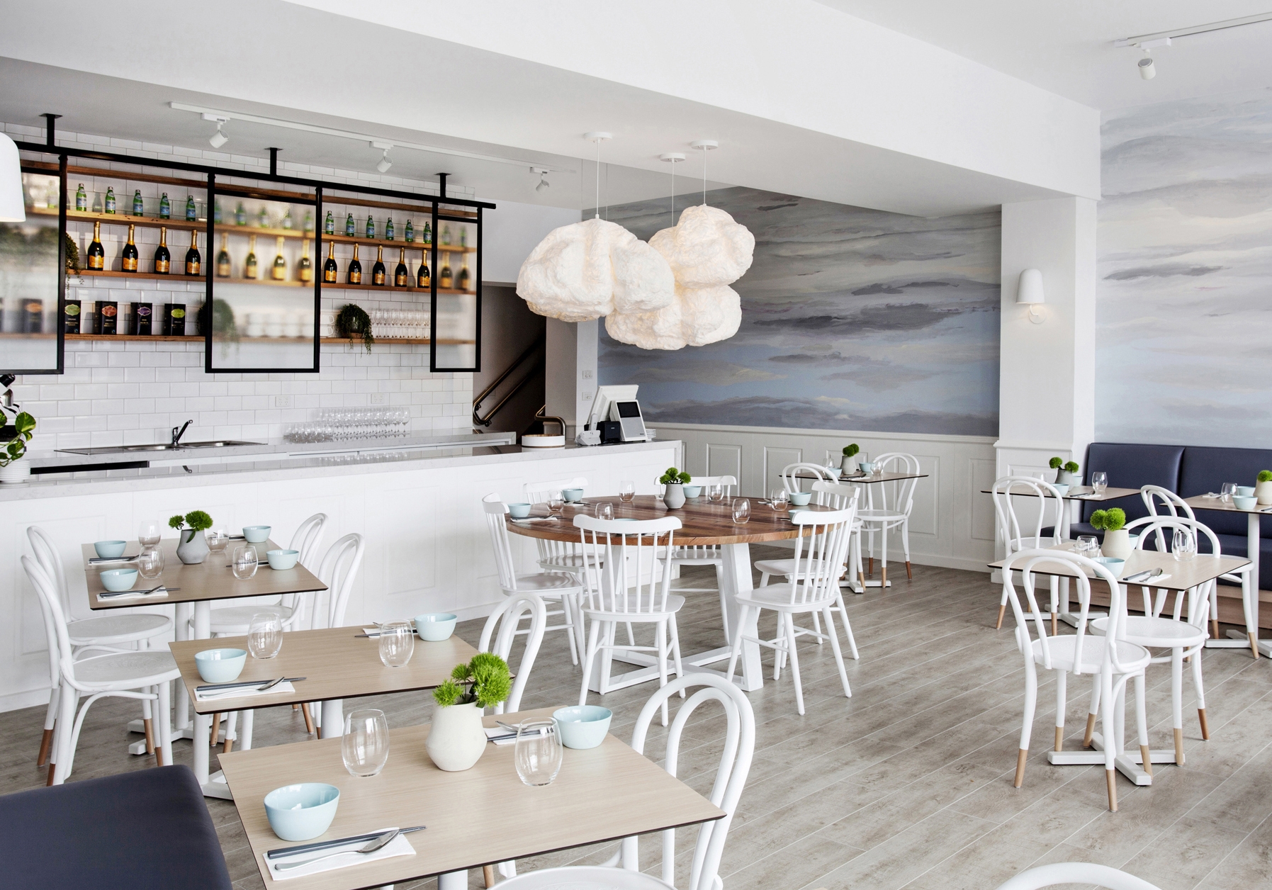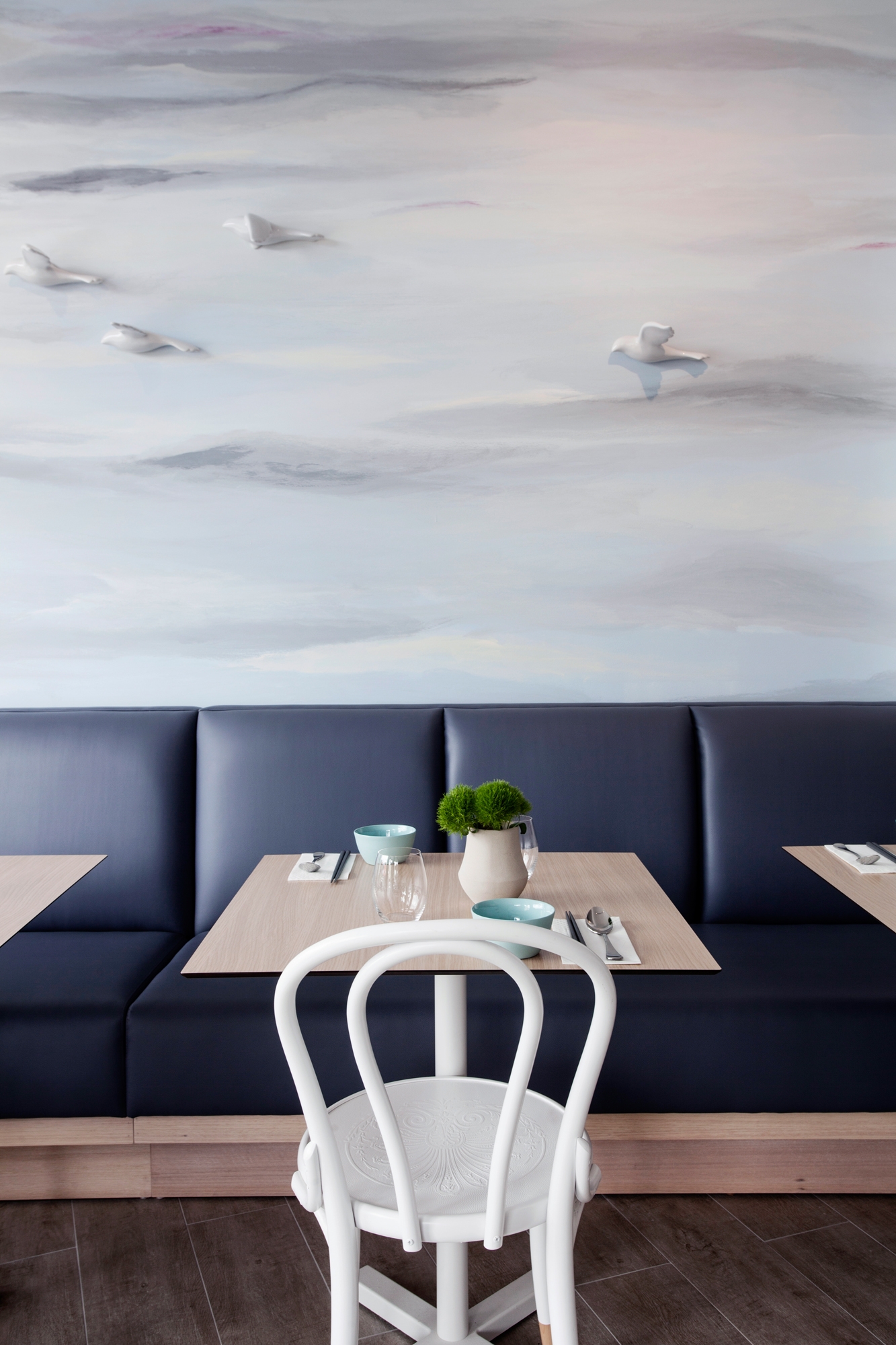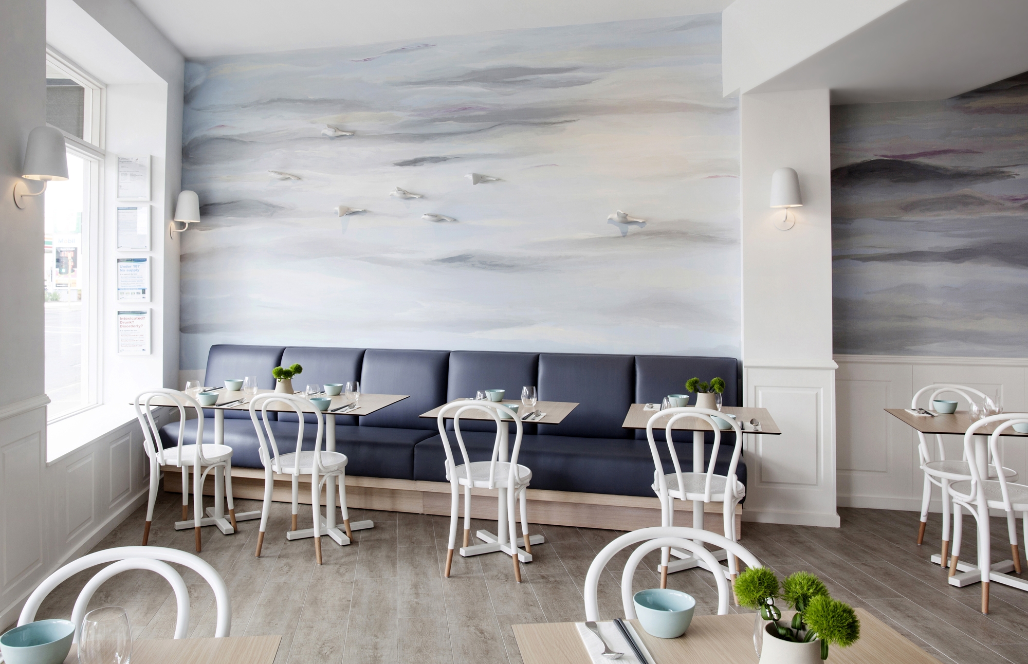 Das Ergebnis ist ein Raum voller Pastellfarben und dezenter Dekorationen, inspiriert durch den Roman „Der alte Mann und das Meer“ von Ernest Hemingway. Die Inspiration ist vor allem an den Wänden erkennbar, wo die Künstlerin Chloe Planinsek eine Malerei erschuf, die sich als Brandung in der Abenddämmerung oder als Wolkendecke interpretieren lässt. Oberhalb der Streifen in hellblauer Farbe sind mehrere Porzellanvögel im Flug abgebildet. Die traumhafte Atmosphäre wird zudem von Leuchten in Form von Wolken verstärkt, die über dem großen, runden Tisch und dem Barpult hängen.