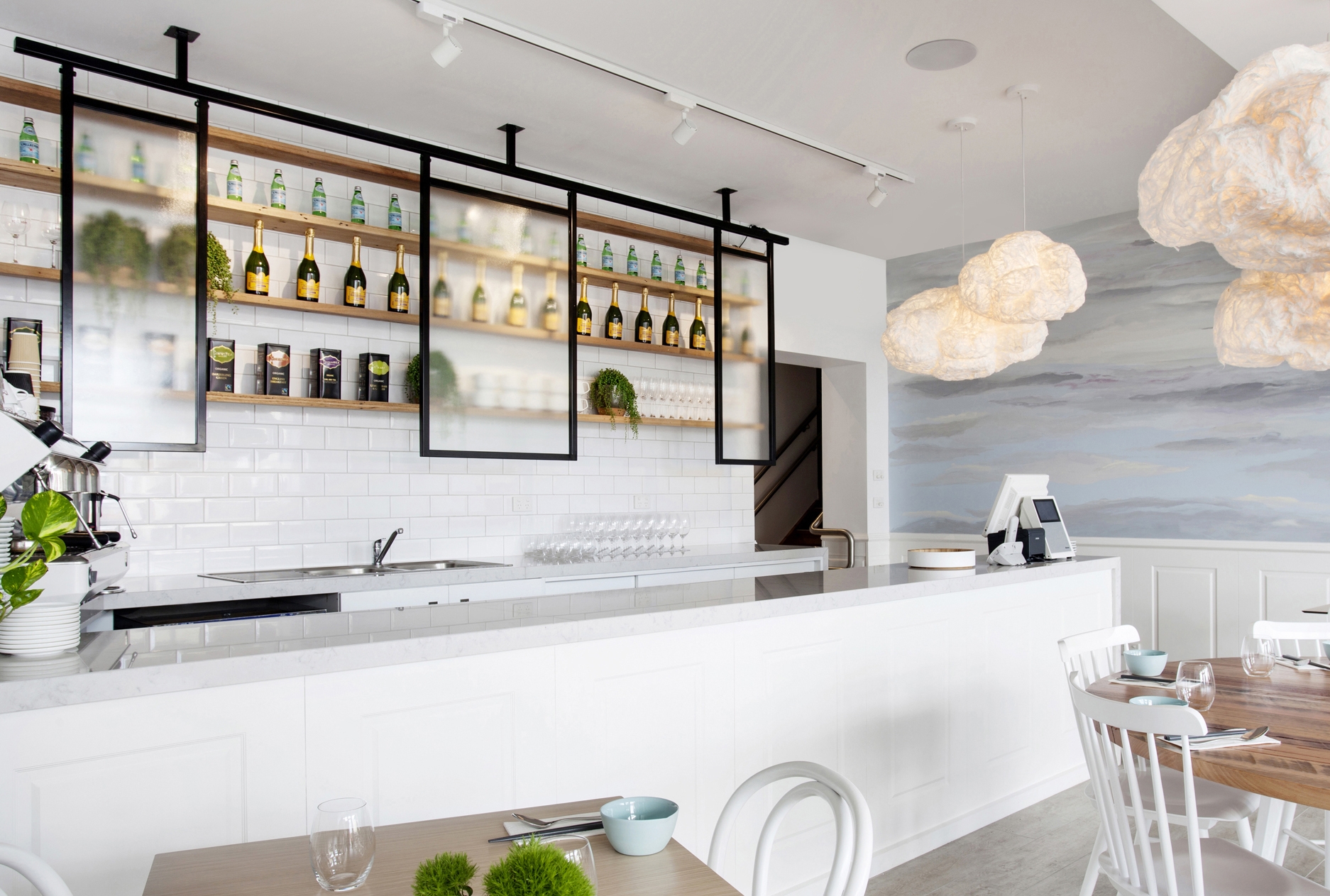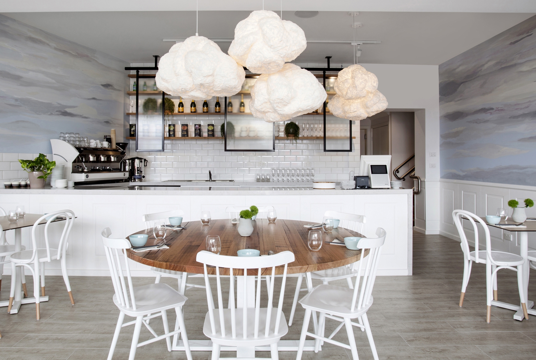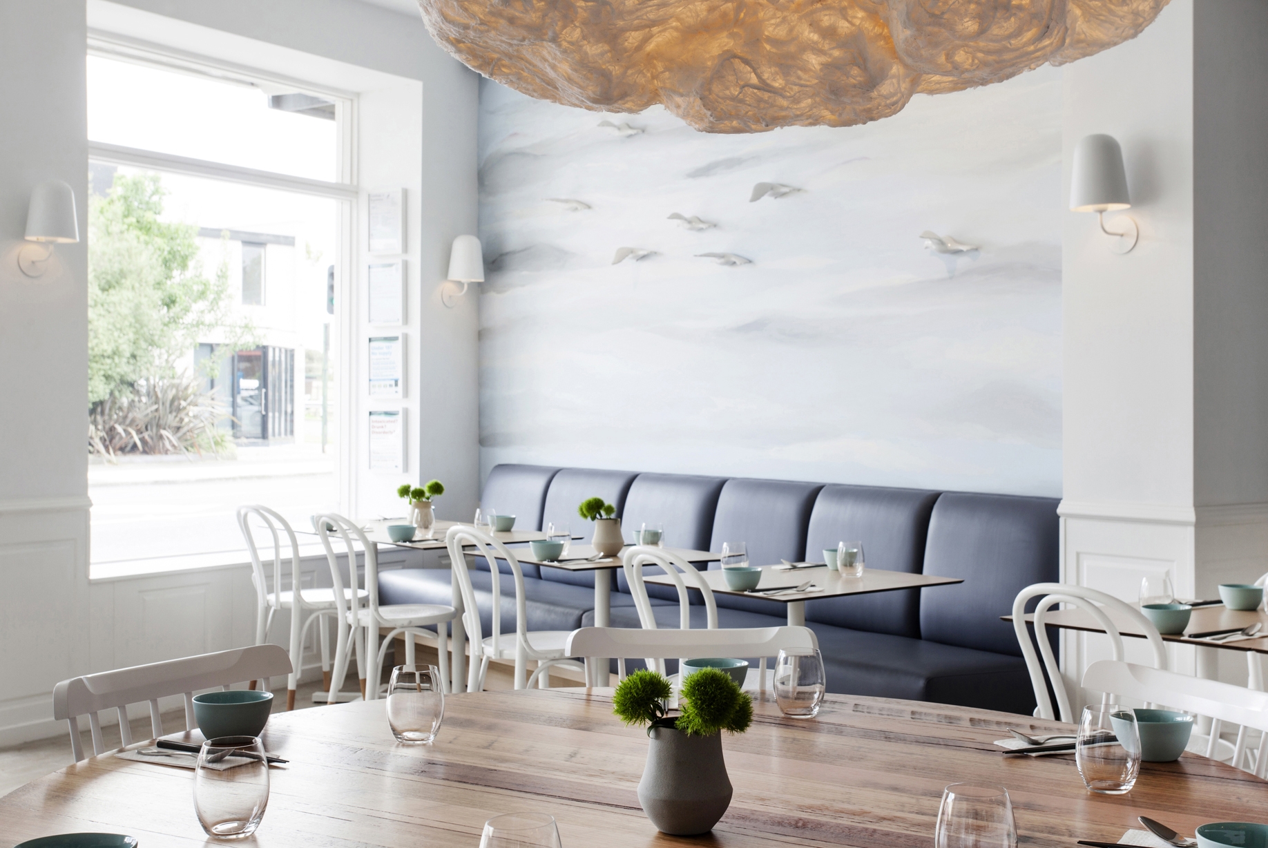 Das Ergebnis ist ein Raum voller Pastellfarben und dezenter Dekorationen, inspiriert durch den Roman „Der alte Mann und das Meer“ von Ernest Hemingway. Die Inspiration ist vor allem an den Wänden erkennbar, wo die Künstlerin Chloe Planinsek eine Malerei erschuf, die sich als Brandung in der Abenddämmerung oder als Wolkendecke interpretieren lässt. Oberhalb der Streifen in hellblauer Farbe sind mehrere Porzellanvögel im Flug abgebildet. Die traumhafte Atmosphäre wird zudem von Leuchten in Form von Wolken verstärkt, die über dem großen, runden Tisch und dem Barpult hängen.