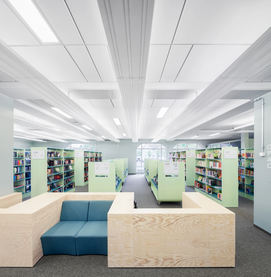 Beim Umbau zur Bücherei sollte die Konstruktion des ursprünglich in den Räumen ansässigen Supermarktes bewusst erkennbar bleiben. Das neue Deckensystem verdeckt deshalb nicht die Unterzüge, sondern setzt mit seinen kreativ gemischten Plattenformaten einen eigenständigen gestalterischen Akzent innerhalb des Stahlbeton-Tragwerks. Ohne Verlust bei der Raumhöhe konnte so eine bibliotheksgerechte Raumakustik und Lichtreflexion erreicht werden.