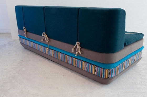 The cord comes from the same inspiration source - the Bedouin tent. It expresses the flexibility and mobility of the design. The seating height of the furniture can be adjusted by adding/removing mattresses and the appearance can be changed by flipping the mattresses, bringing a dirffrent fabric to the top.