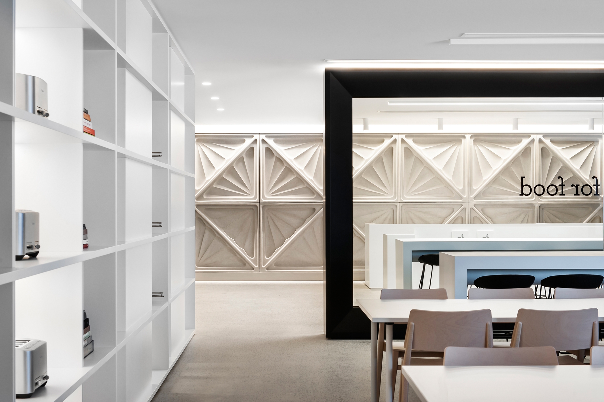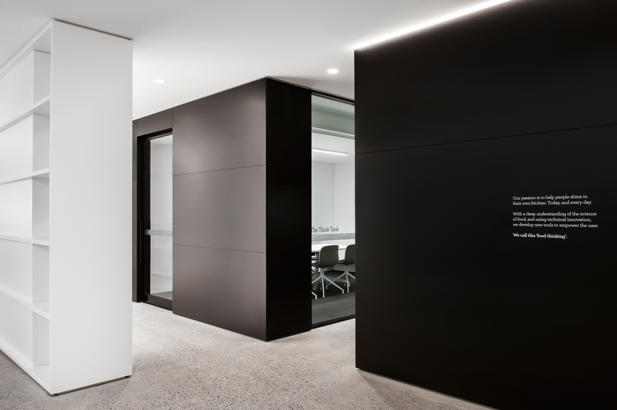 To encourage and promote the ‘food thinking’ ethos, open and communal food preparation areas are placed throughout the work place, often adjacent key client and staff areas including reception. In reception a large frame reading ‘food for thought’ is the only physical separation. The intention is for visitors to be immersed with food thinkers: staff making coffee with the Oracle, fresh juice with the Fruji fountain and toasted sandwiches with the famous Breville sandwich press.