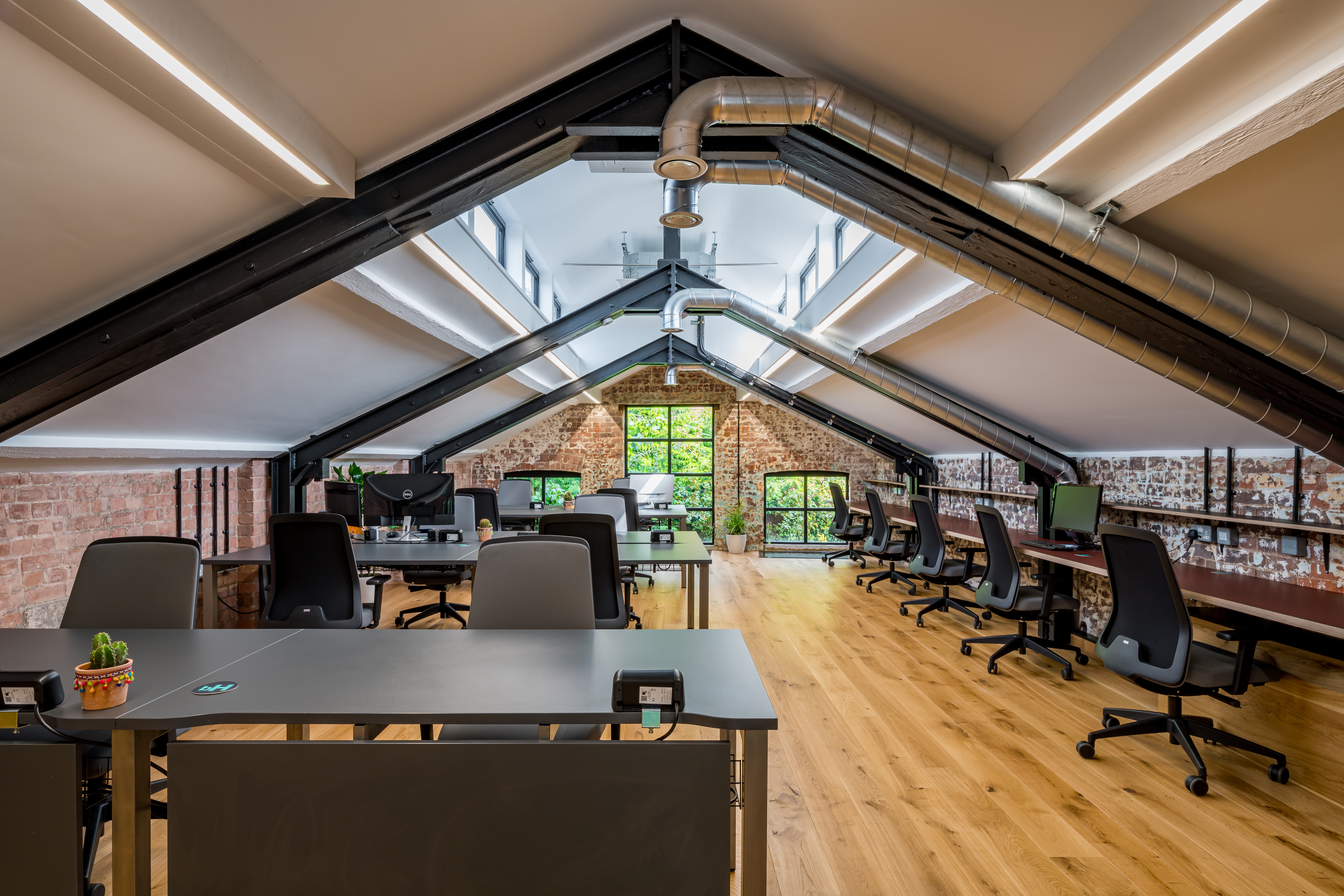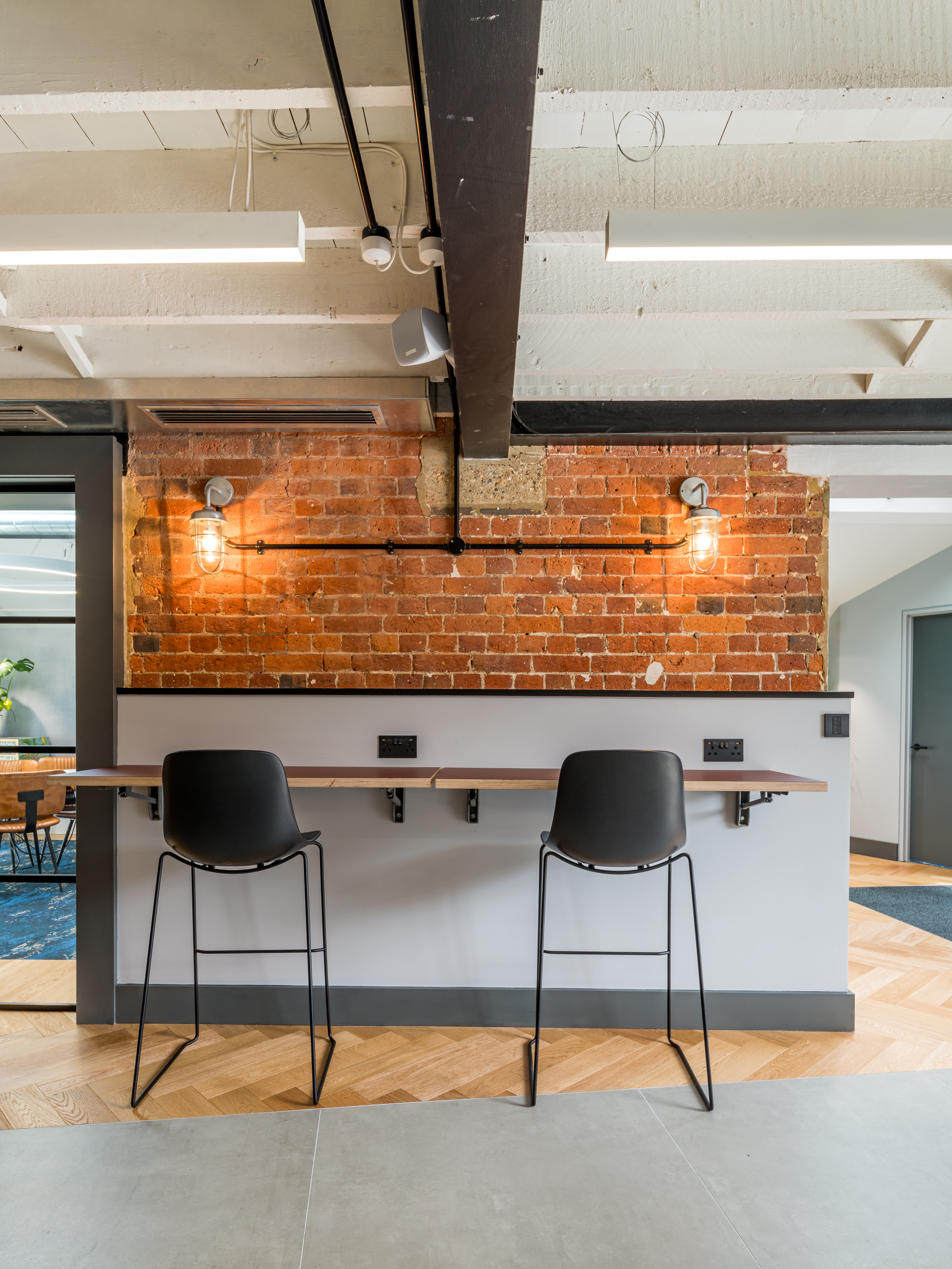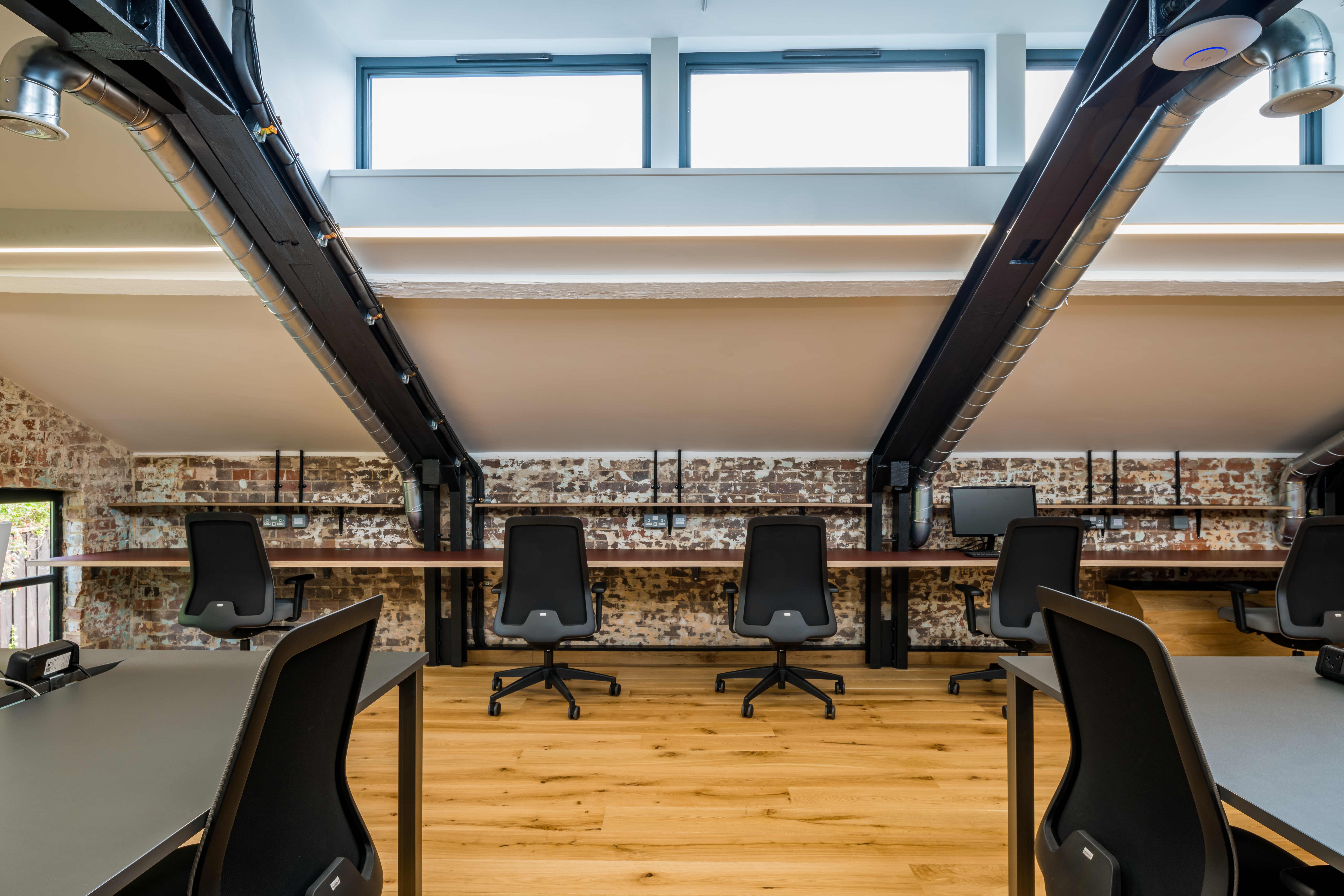 The new, bespoke staircase leading up to the first floor leads off from the bar area and is made in timber as far as the landing. Then, at the stair turn, it transitions into a metal-framed stair. The first storey space, set beneath an original sloped roof, has been designed as a quieter space with fixed and allocated desking and contains 17 workstations in a traditional desking format, plus additional individual workstations to the right. Flooring is in timber and the rear windows are black-framed and crittal-style to match the window and dividing wall treatments on the ground floor. Both side walls and most of the front and back walls are in sandblasted brick, once more celebrating the original building structure.