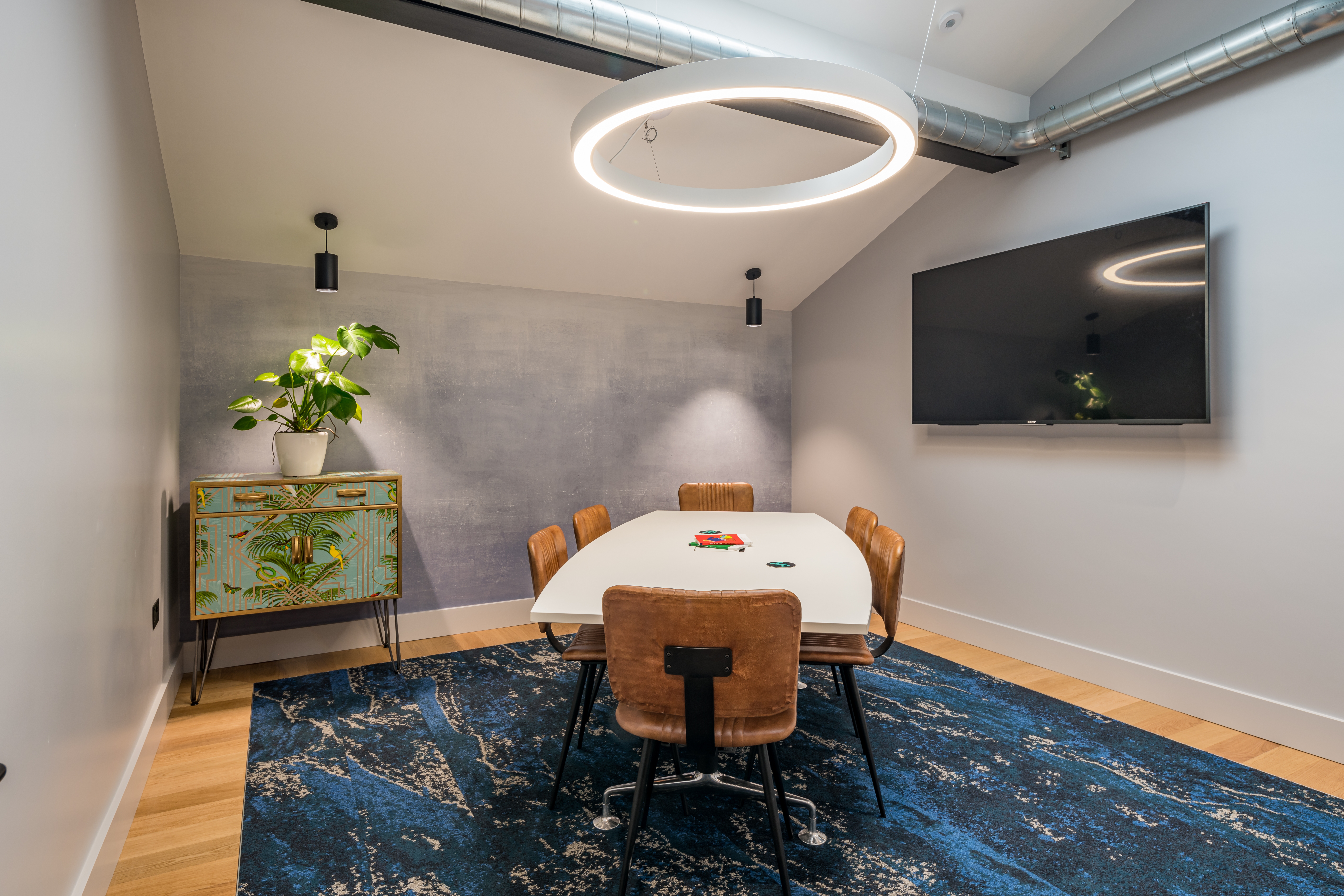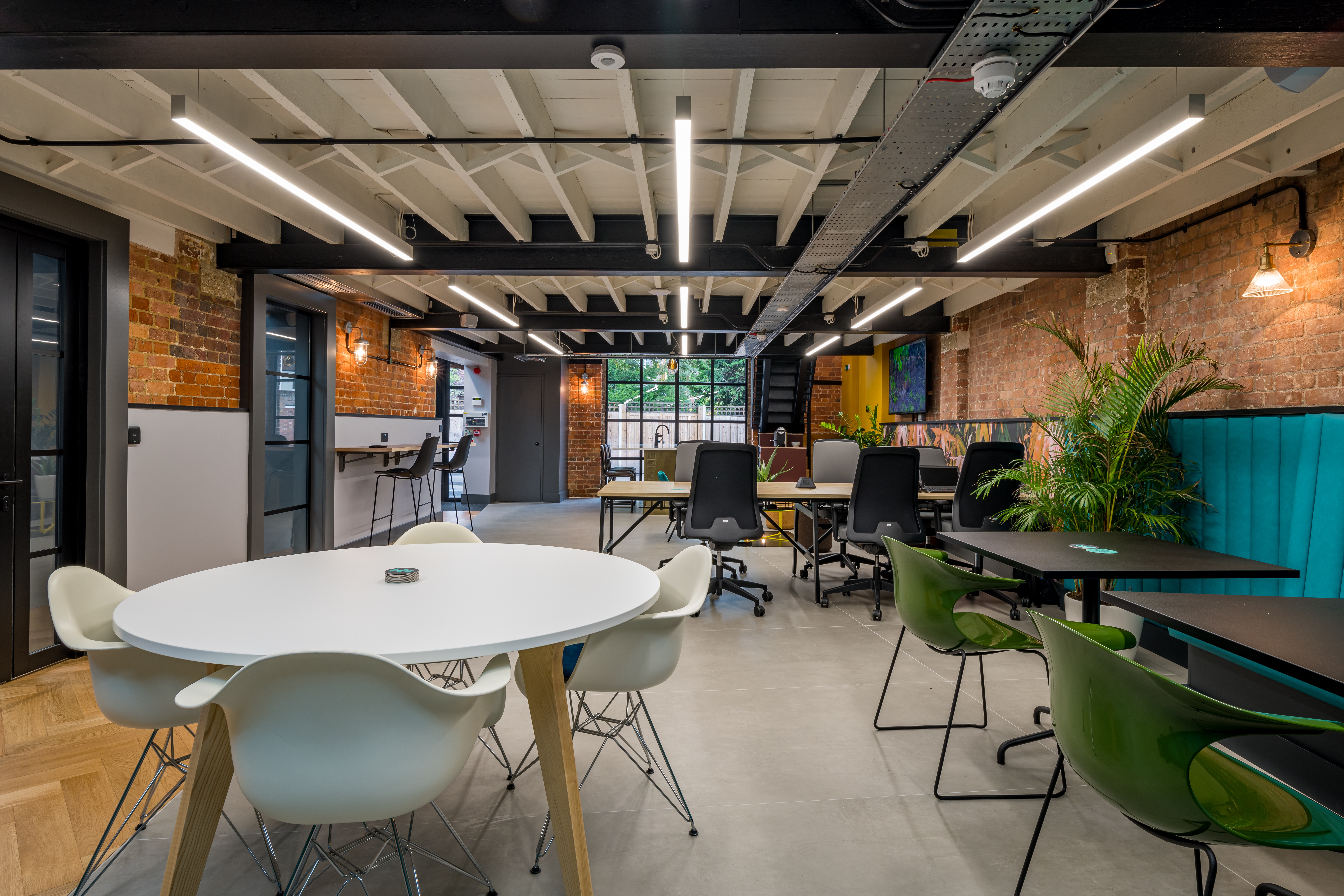 The external windows and door are by Monk Metal, whilst the internal meeting room partition is by id Fusion. More informal meetings can also be held at the large central table or at the smaller, freestanding tables. A presentation screen also enables the space to be used for events, with a bookable meeting room that holds 6-8 people. The meeting table is the Pars table from Orangebox, whilst the meeting chairs are a design classic – the Eames DAW from Vitra. A characterful credenza in the room is an upcycled mid-century G Plan Teak Drinks Cabinet.