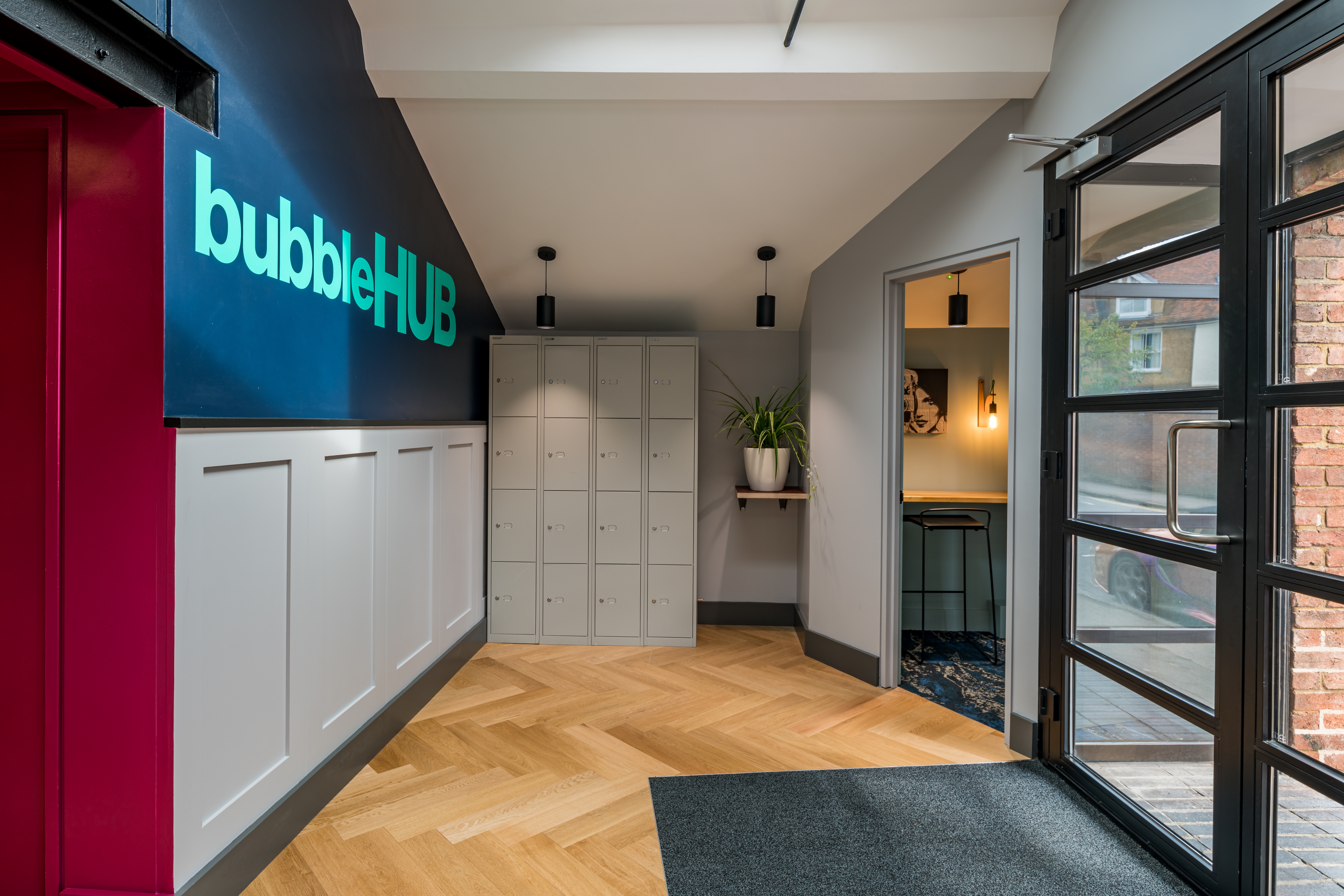 Arrival at bubbleHUB St Albans is via a small set of stairs from street level up to the building’s ground floor main entrance, where guests and users are met by a panelled and painted wall, featuring the new bubbleHUB branding created by SEA Design, as well as a bank of personal lockers to the right and an immediate full view to the left across the ground floor ‘hub’ community space. This floor is predominantly to be used for meetings, touchdown, relaxation and social use and features a deliberately-eclectic mix of furniture styles and a non-uniform, non-allocated layout, as well as integrated planting for improved air quality and natural presence.