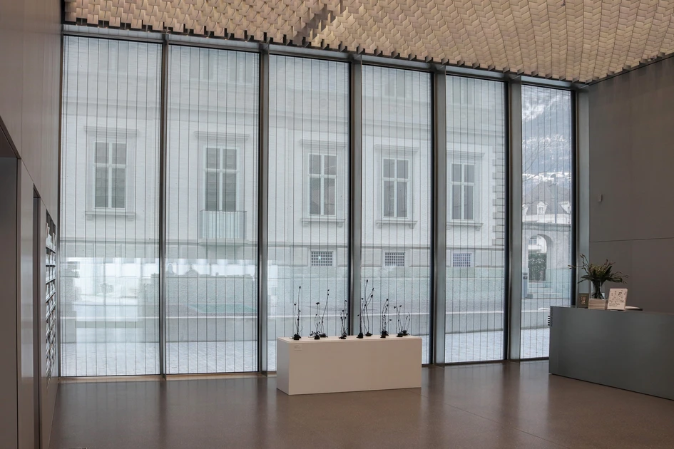 Als Beschattungssystem wurden im Eingangsbereich sechs Edelstahlrolladen s_enn® mit einer Höhe von 5,60 m verbaut, Das Kernstück des Metallbehanges s_enn® – das Behangprofil – wurde gemeinsam mit dem Fraunhofer Institut für Solare Energiesysteme ISE, Freiburg entwickelt. Durch dieses reduziert s_enn® den Energieverbrauch des Gebäudes optimal. Dank einer hohen Transparenz des Behangs bleibt der Sichtkontakt zur Aussenwelt auch bei komplett ausgefahrenem Behang erhalten. Kleine Wickeldurchmesser ermöglichen zudem geringe Einbaumasse. Hohe Windstabilität und zeitlose Optik zeichnen ihn aus.