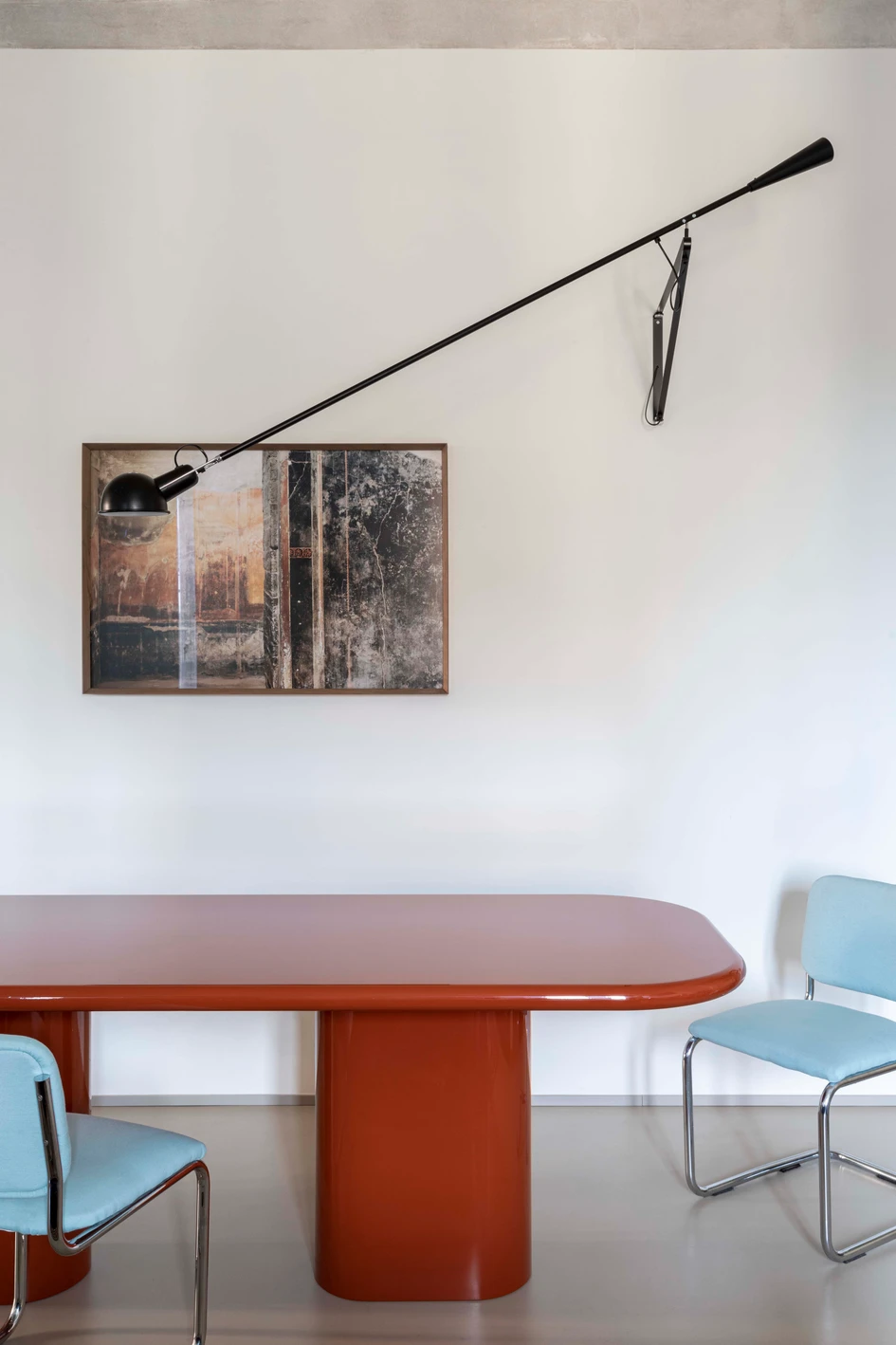 The resin floors, for example, act as a connective to the various original grit carpets, often disassembled and reassembled with respect to renewed needs. The same resin, but with a more material and shaded grain, highlights the new volumetric interventions of the house, enveloping all the walls and movable walls. In the kitchen, a satin steel island is combined with wall units in semi-gloss blood orange micro-perforated sheet metal designed by Punto Zero.