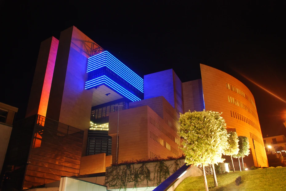 The big structure becomes transparent and at the same time visible from afar thanks to suggestive lights that enhance the front side disposed at 180° towards the lake. For the realization of the lighting project Filippo Cannata preferred to work on areas, surfaces and volumes, using the colours always in contrast between the outside and the inside and creating dynamism in the succession of lighting scenes. Even the large windows at the entrance were interpreted as they were empties and the white light coming out from them merges with the external colours, leaving unchanged their importance.
