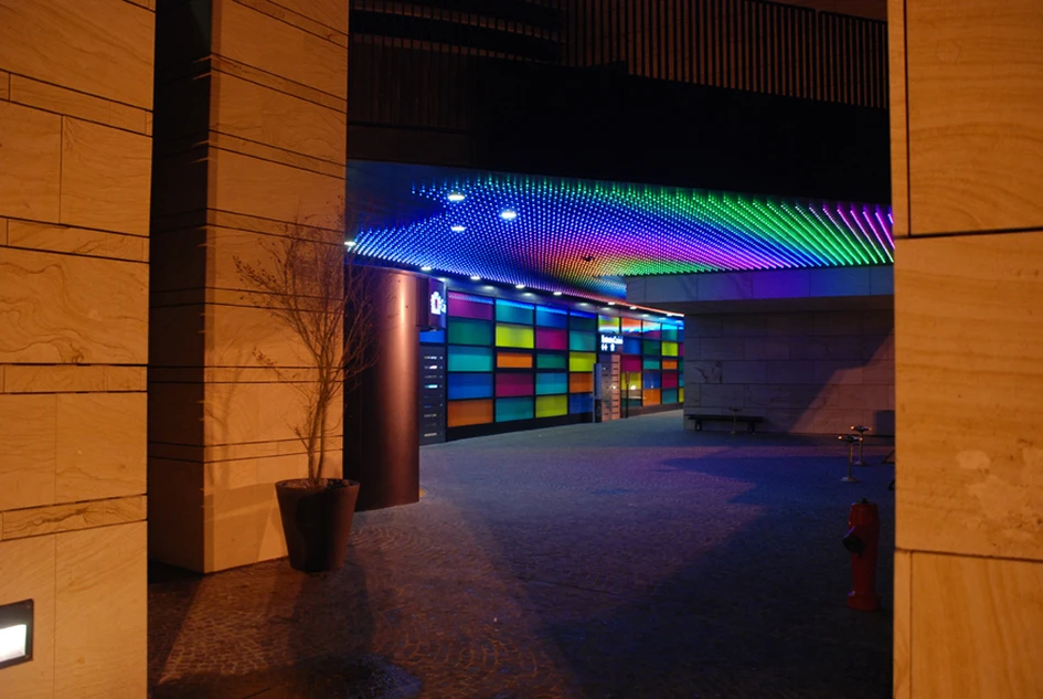 A very great importance was given to the lighting of the entrance of the Casino at the first floor. Here a ceiling totally covered with Led Rgb works like a real interactive display able to change colours uniformly or partially, to regulate their speed, to mix them in order to get new shades and create movement or stroboscopic effects. This masterwork of technology was conceived to welcome the visitors in an exclusive manner and put them in the right dimension and mood.