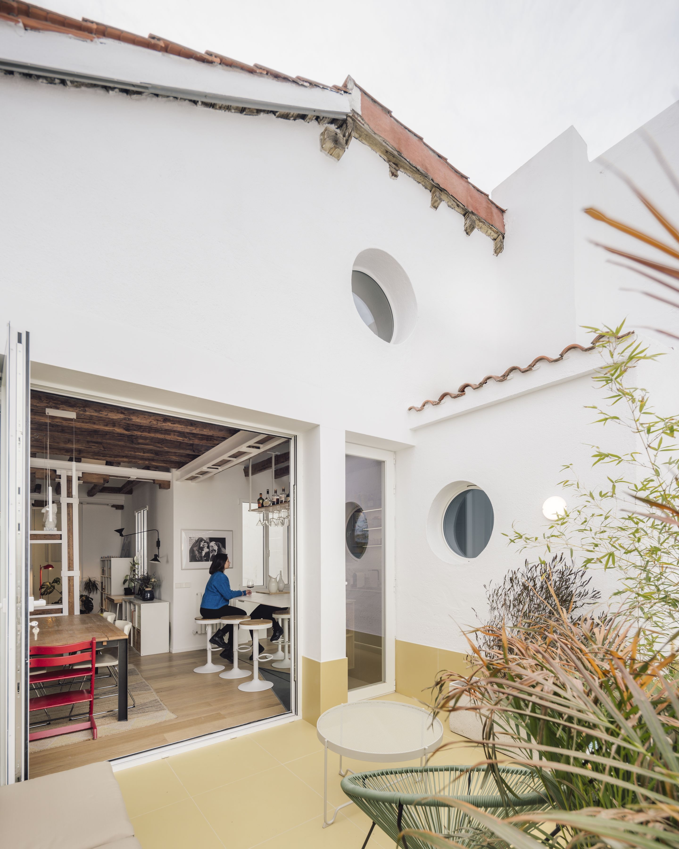 The terrace, 15 m2 and located at the end of the 21 linear meters of the house, is, together with the skylights, the most direct source that floods the entire interior with light, and that, in addition to being a meeting space, also contains a jacuzzi for winter, and summer days. The scale of the furniture that occupies the house is an echo of the different lives in the different places where Marion and Paul Franck have lived; a system of objects acquired here and there in which some as old as some chairs of the nineteenth century are intermingled with classic designs of the twentieth century or with others from IKEA. CIEL is a renovation that responds to a singular and common urban situation, where the house does not interact in a decisive way with the city, but with its skies; a house that is a large technologically designed roof; a shadow after all, capable of hosting, under a climate-controlled environment, a domestic program organized in a flexible way where a family can live a stretch, a few years or a lifetime, enjoying the passage of time and its fluctuations under the hypnotic cobalt blue ranges of the unique skies of Madrid.