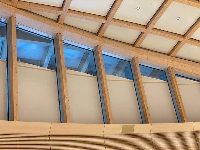 38 Fensterelemente wurden mit MHZ-Beschattungsanlagen des Typs K_oax 90 versehen. Es handelt sich hierbei um Gegenzuganlagen mit Laufrichtung von unten nach oben. Insgesamt 21 rechteckige und 17 trapezförmige Anlagen in individuellen Abmessungen mit Elektromotor sorgen auf Knopfdruck für Sicht-, Licht- und Sonnenschutz.