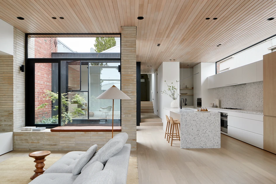 Despite courtyards taking up space within the center of a floor plan, the clients embraced the concept, knowing the benefits would outweigh the loss of backyard space. Not only does the courtyard bring northern sunlight into the plan, but it also creates relief at the end of a long and narrow hallway. A deciduous tree that changes color with the seasons creates a focal point for the eye, as does the texture of the neighboring brick wall. The courtyard insertion also creates a more zoned open plan arrangement, with the living room enjoying a dual aspect to two different landscaped spaces. With twin toddlers needing a lot of supervision, as well as a teenager wanting more privacy and separation, the planning needed to carefully consider these spatial relationships. A multi-purpose space that fronts onto the opposite side of the courtyard allows visual connections to the rest of the house, but with the flexibility to become a guest bedroom if needed. The garden studio with its own ensuite and mezzanine is intended to accommodate a range of functions including storage, gym, home office, teenage retreat, and bike store.