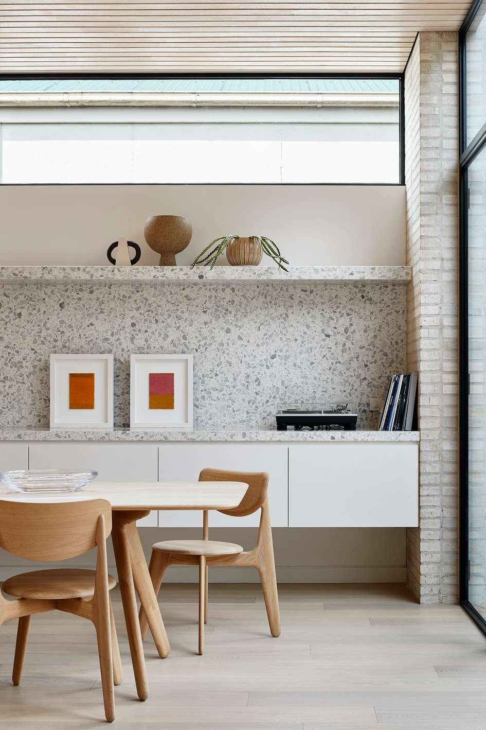 This brick and glass extension fits snugly onto the back of a double-fronted weatherboard worker’s cottage in Clifton Hill. Designed to capture light from the north, as well as views of an existing bottle brush tree to the south, the layout responds to both the site and the family’s desire for future flexibility. With laneway access at the rear, a double-storey garden studio nestles into the back of the site, providing a green backdrop to views from the calm spaces within.
