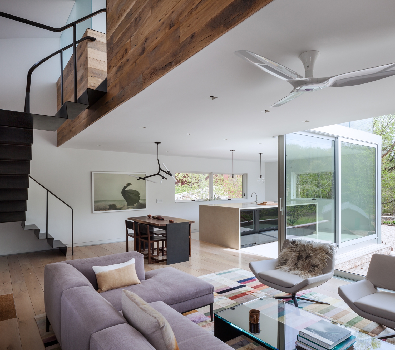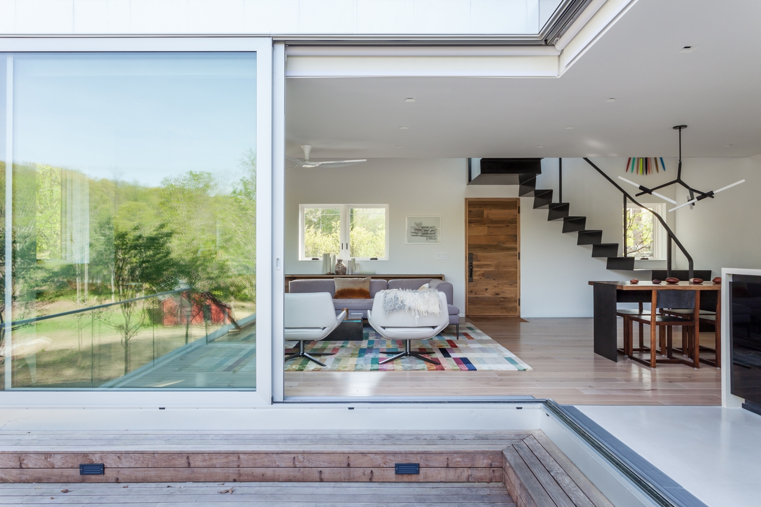 The existing house on the site became the starting point for the design because of its elegant size. The new house was created using the original house’s footprint, but engages the surrounding environment in numerous ways. The façade that faces the Old Albany Post Road defers to its historic nature, but in the rear, the façade is sliced in half, through the use of fully retractable windows on the ground and second floors, which reveals the interior and invites the outside in. This provides a connection to the outdoors, which makes the 900‐square‐foot house feel larger and more integrated with its surroundings. A quadrant pushes out from the ground floor, connecting to a series of patios and steps, which cascade out into the landscape and tie the new house to the existing adjacent barn.