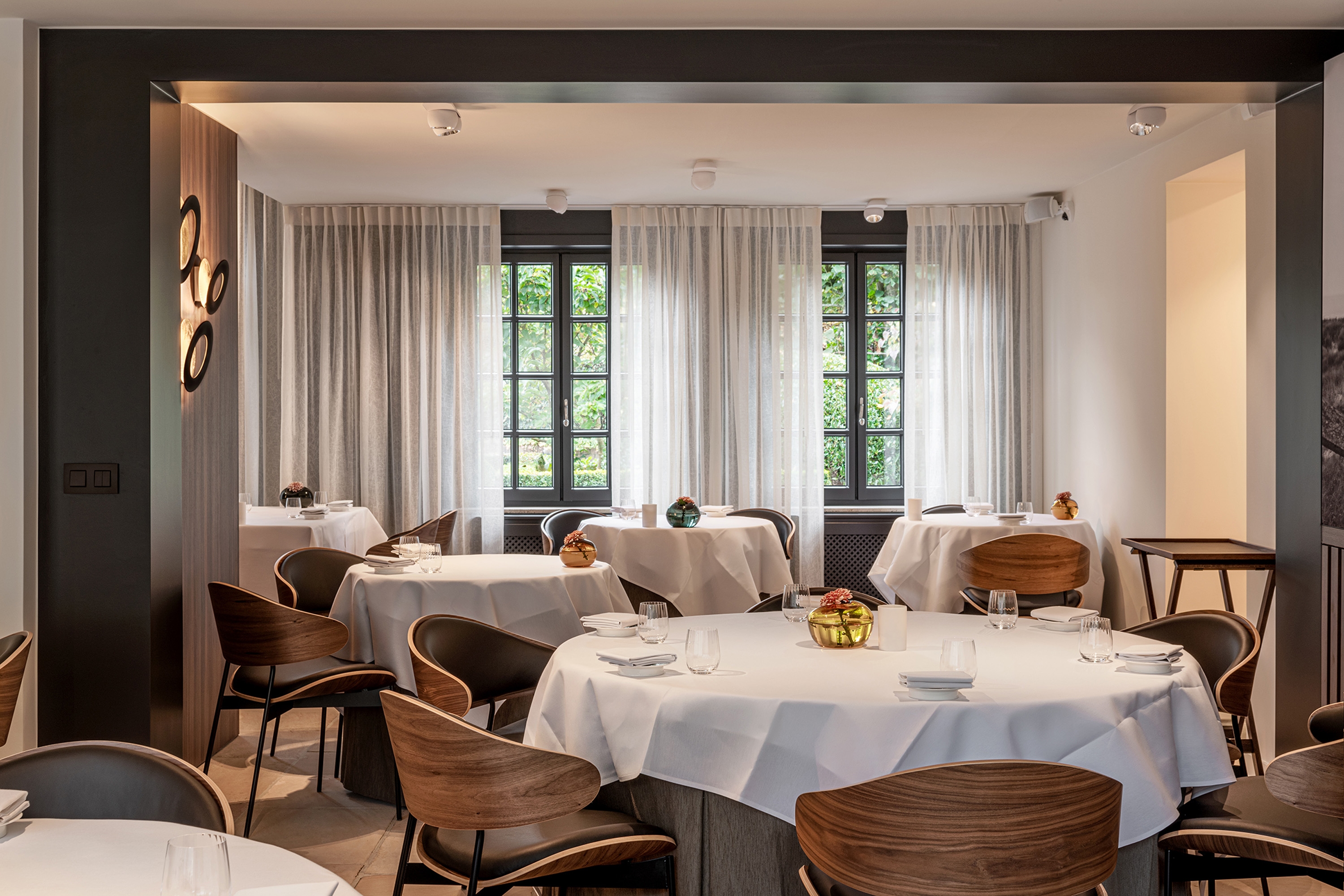 Identität ist der Signature Dish. Herkunft, hohe Qualität und Kreativität sind die Haupt-Zutaten, die sich auch in das Raumkonzept übersetzten: Die Geschichte des ehemaligen Jagdhauses buchstabiert sich in der natürlichen Solidität des steinernen Bodens genauso wie im warmen Knistern des Kamins. Zugleich wirkt alles auch leicht und transparent. Die gesamte, vom Atelier Verilin konzipierte und in Belgien produzierte, Textilausstattung verwebt Handwerk, Haptik und Hochwertigkeit und sorgt nebenbei für eine angenehm gedämpfte Geräuschkulisse. Transluzente Vorhangstoffe erlauben die Kommunikation von innen und außen.