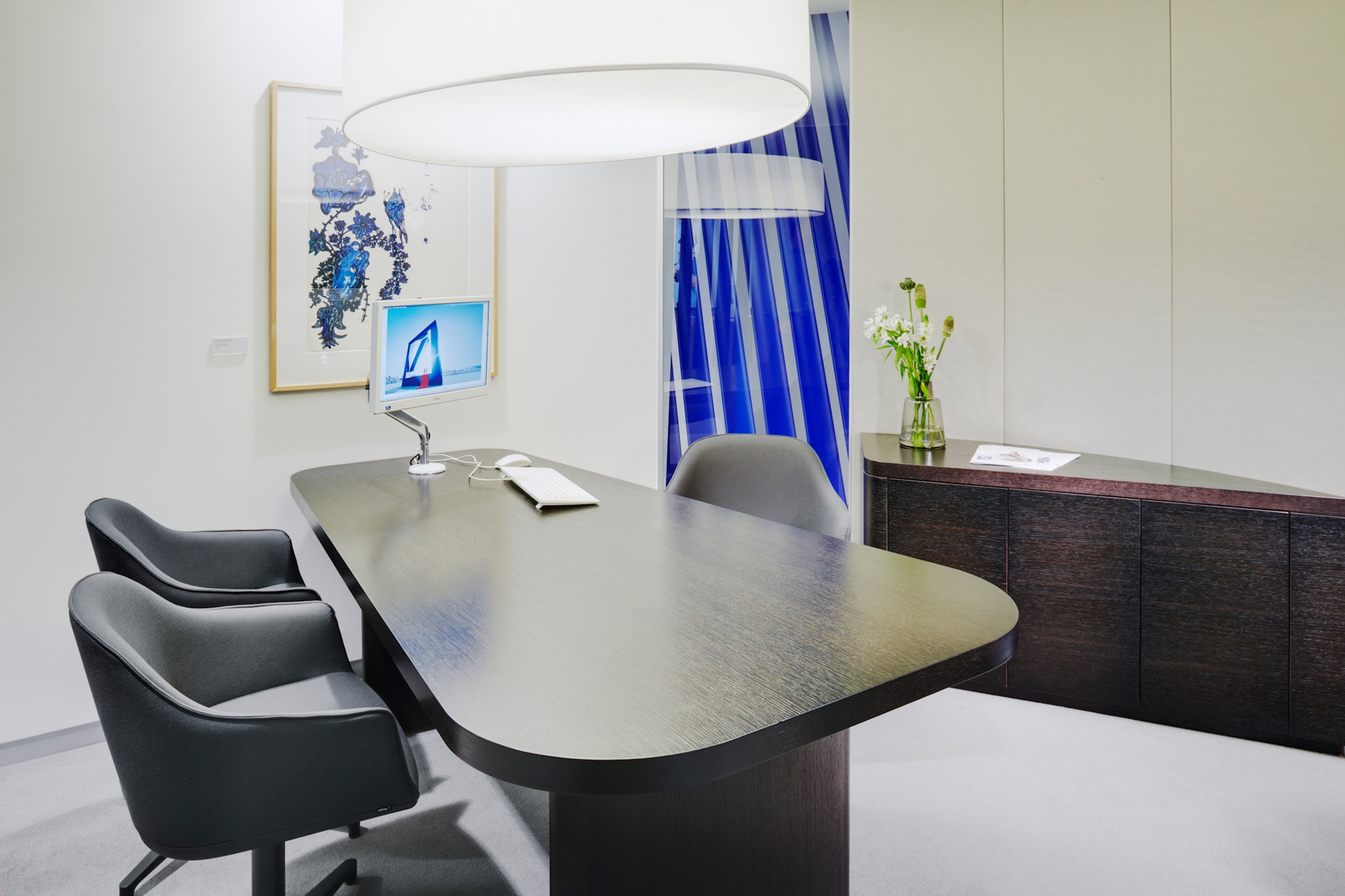 Die runde Form der Besprechungsräume wird dabei als bewusster Kontrast zum quadratischen Logo eingesetzt. Dieses Gestaltungsprinzip wird bei weiteren Elementen aufgegriffen, um wechselnde Atmosphären entstehen zu lassen. Warme Holzoberflächen kontrastieren mit weiß lackierten Flächen, runde Formen mit rechtwinkligen und eine warme Grundbeleuchtung mit kühlen Akzentlichten.