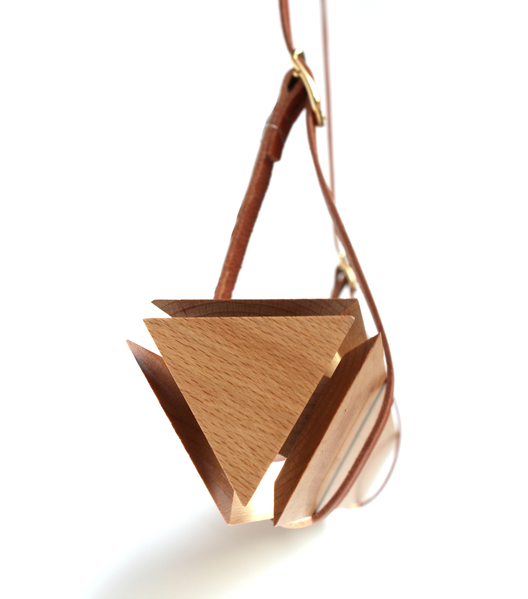 Its covered by a sophisticated wooden shell which is almost like a fitted garment that turns it into an absolutlely beautiful object. A triangular prism wraps the source of light letting the glow out through its edges, making it smooth and cozy. The leather straps from which the lamp safely hangs make the perfect combination for a classic contemporary design.