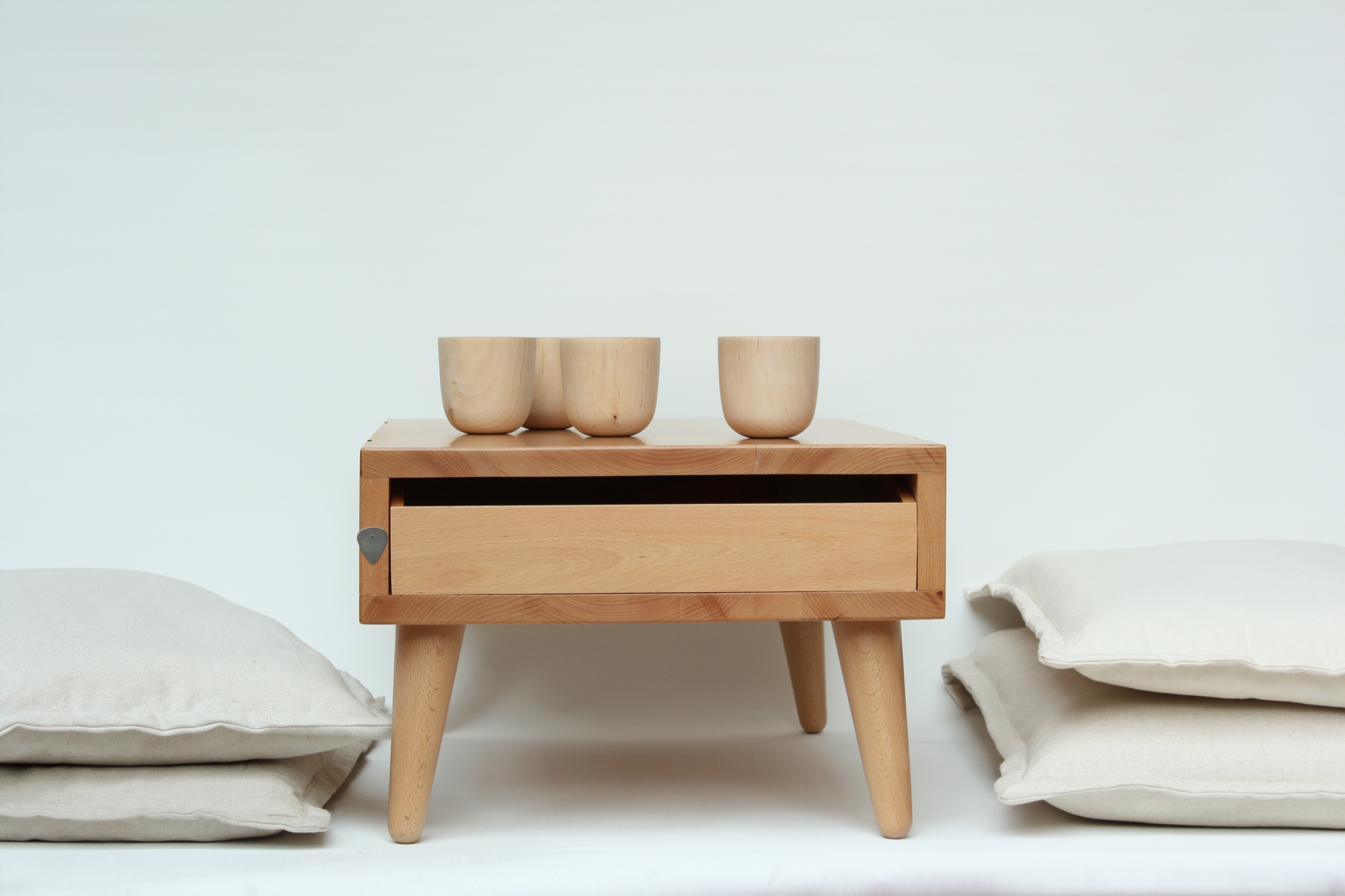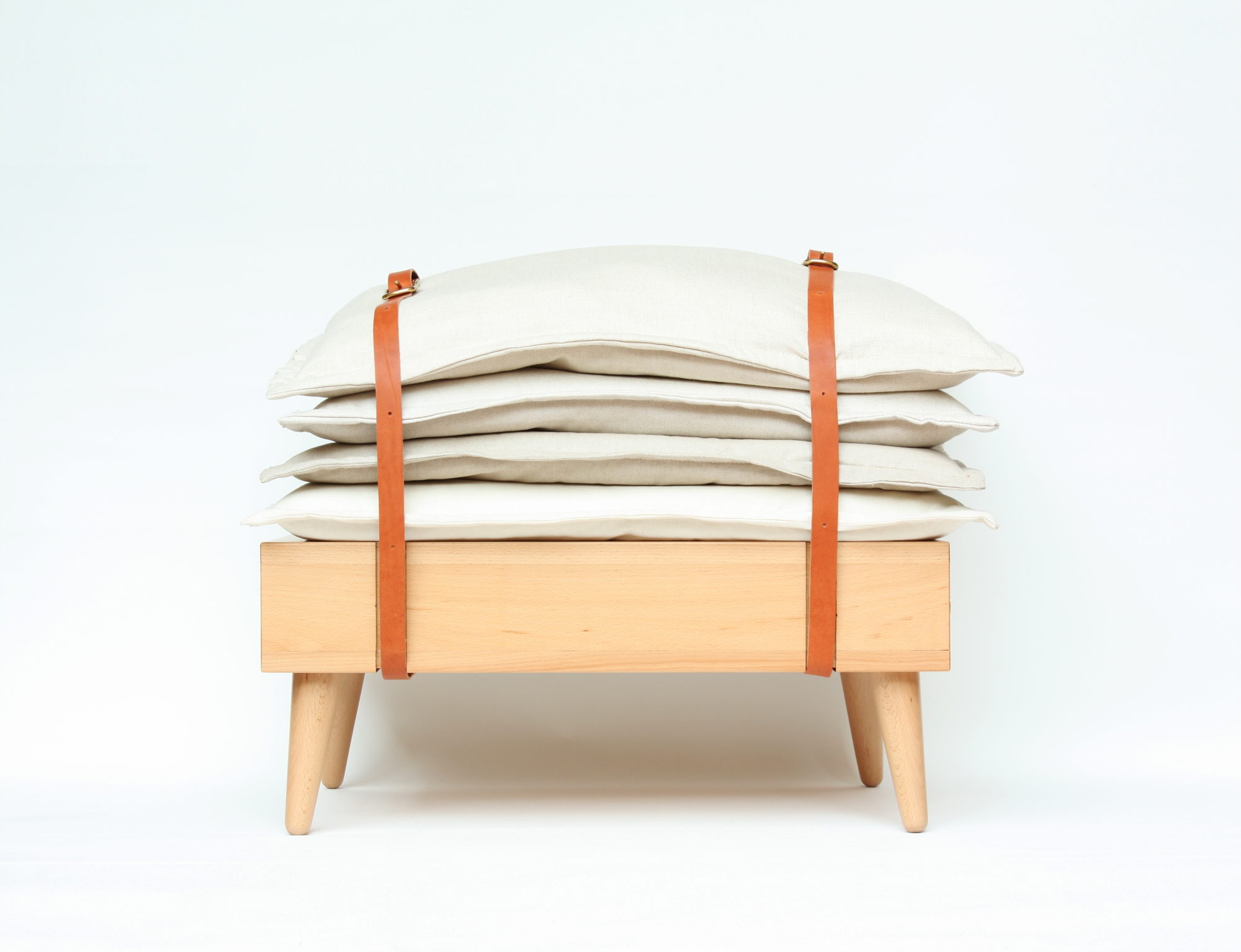 It works in a very simple way: it is formed by a wooden base with short legs and two drawes and a pile of cushions of different thicknesses and colours. The whole lot is tied by two adjustable and removable leather straps that also allow to reset the height of the seat by increasing or decreasing the number of cushions.