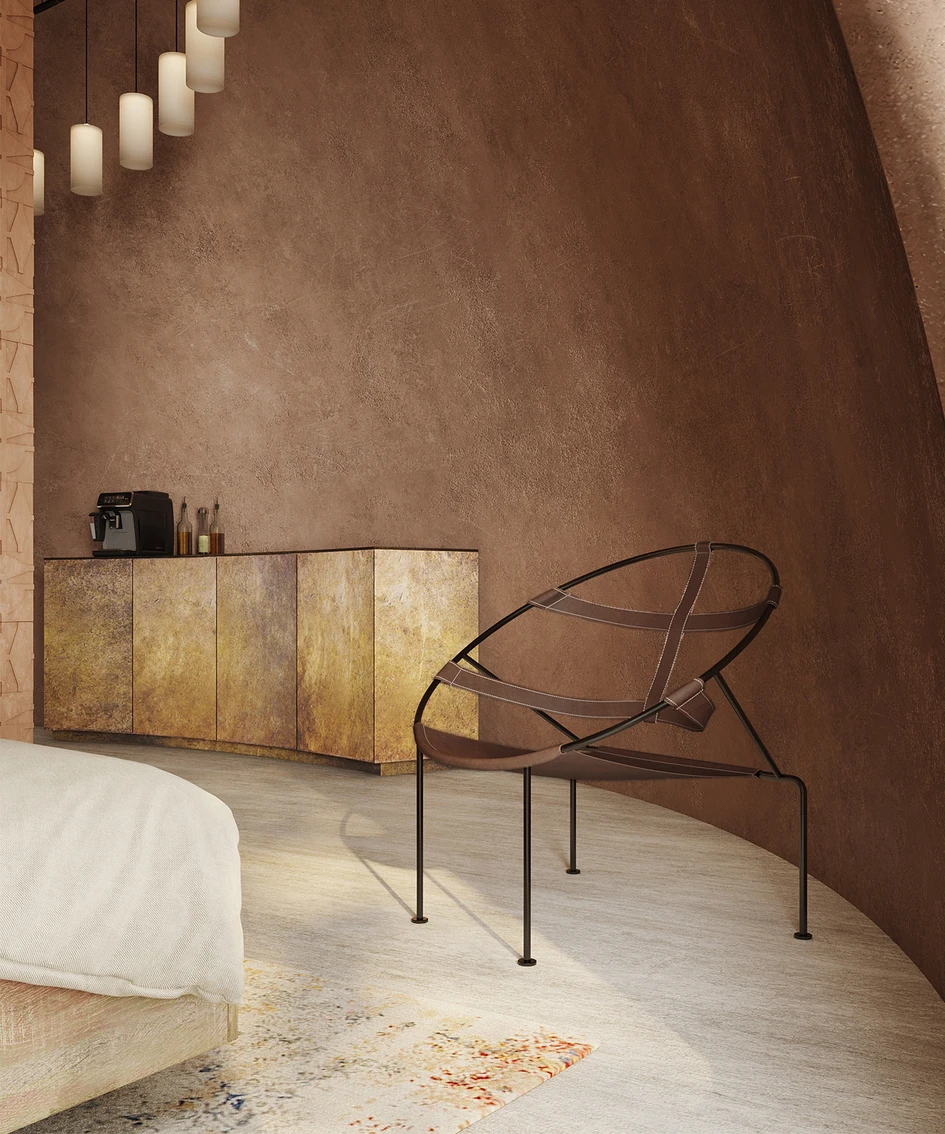 The lush garden wraps around the cabin and acts as a natural barrier from the surrounding paths while protecting its guests. Interwoven into the interior space, the vegetation allows you to enjoy a private moment during your experience. The doors and windows are oriented towards all the cardinal points, which allows the sun's rays to penetrate during all hours of the day. Sunlight also exposes the hues and ripples of the clay walls and the uneven surfaces of the terracotta tiles.