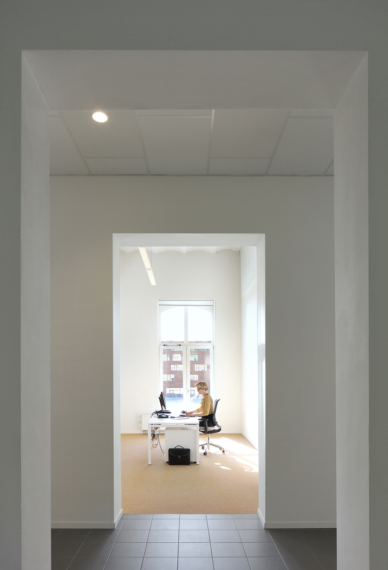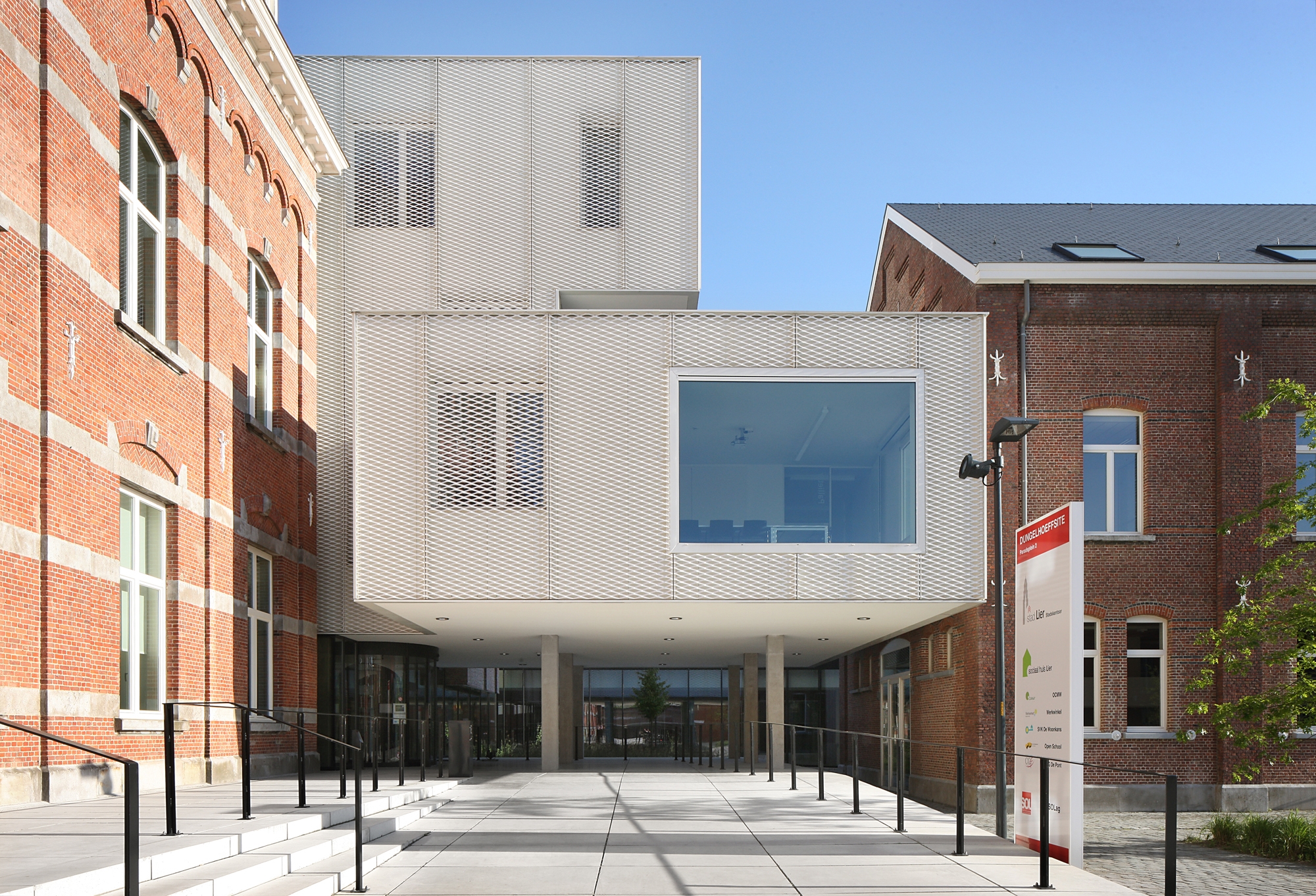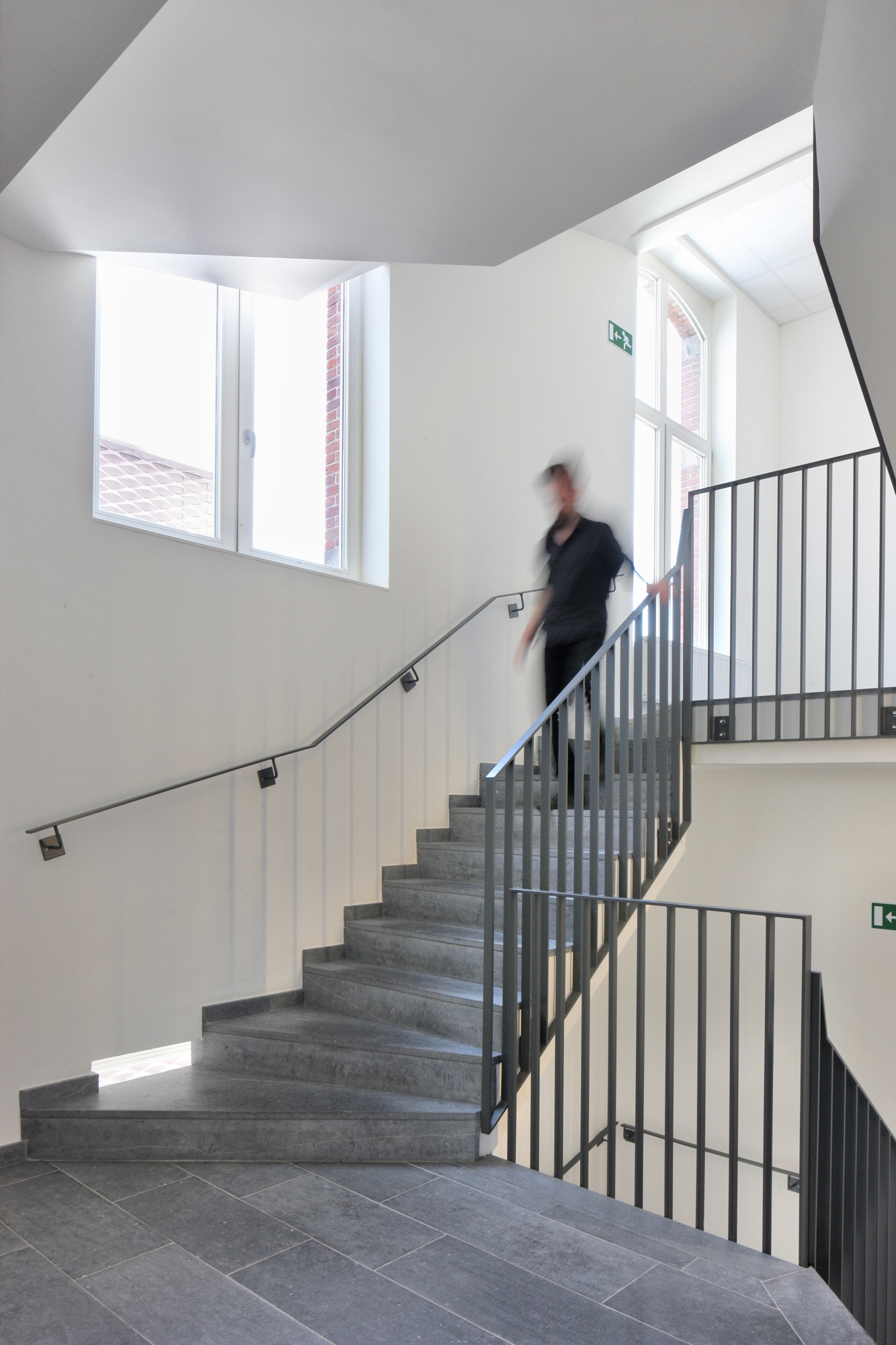 The rooms in the existing building are sustainably transformed into flexible office space, which can evolve with and anticipate on fluctuating staffing numbers or administrative services. Efficient use of the existing space has helped restrict the surface of the new construction to what is strictly necessary. By means of its projection this volume connects with the various subspaces at the site. As the newly constructed volume is positioned right in the middle among the existing buildings, it cannot be viewed in its totality from any single viewpoint. Internally, this generates an unexpected mix of spatial refuges and unusual perspectives, offering an important surplus quality to visitors and staff alike and transforming these professional spaces into a pleasant contemporary living environment.