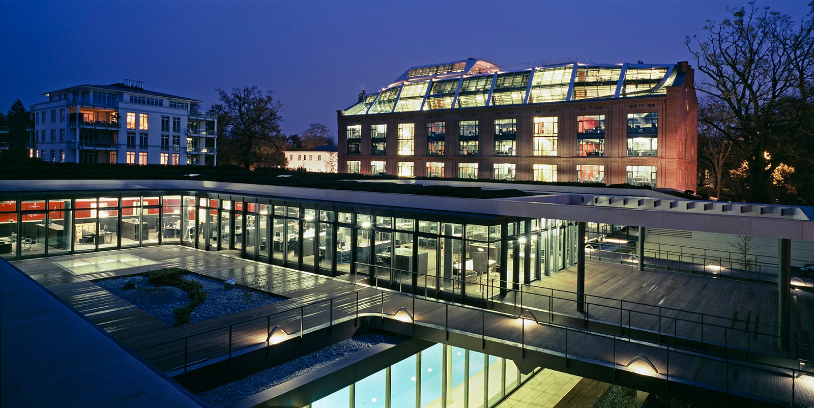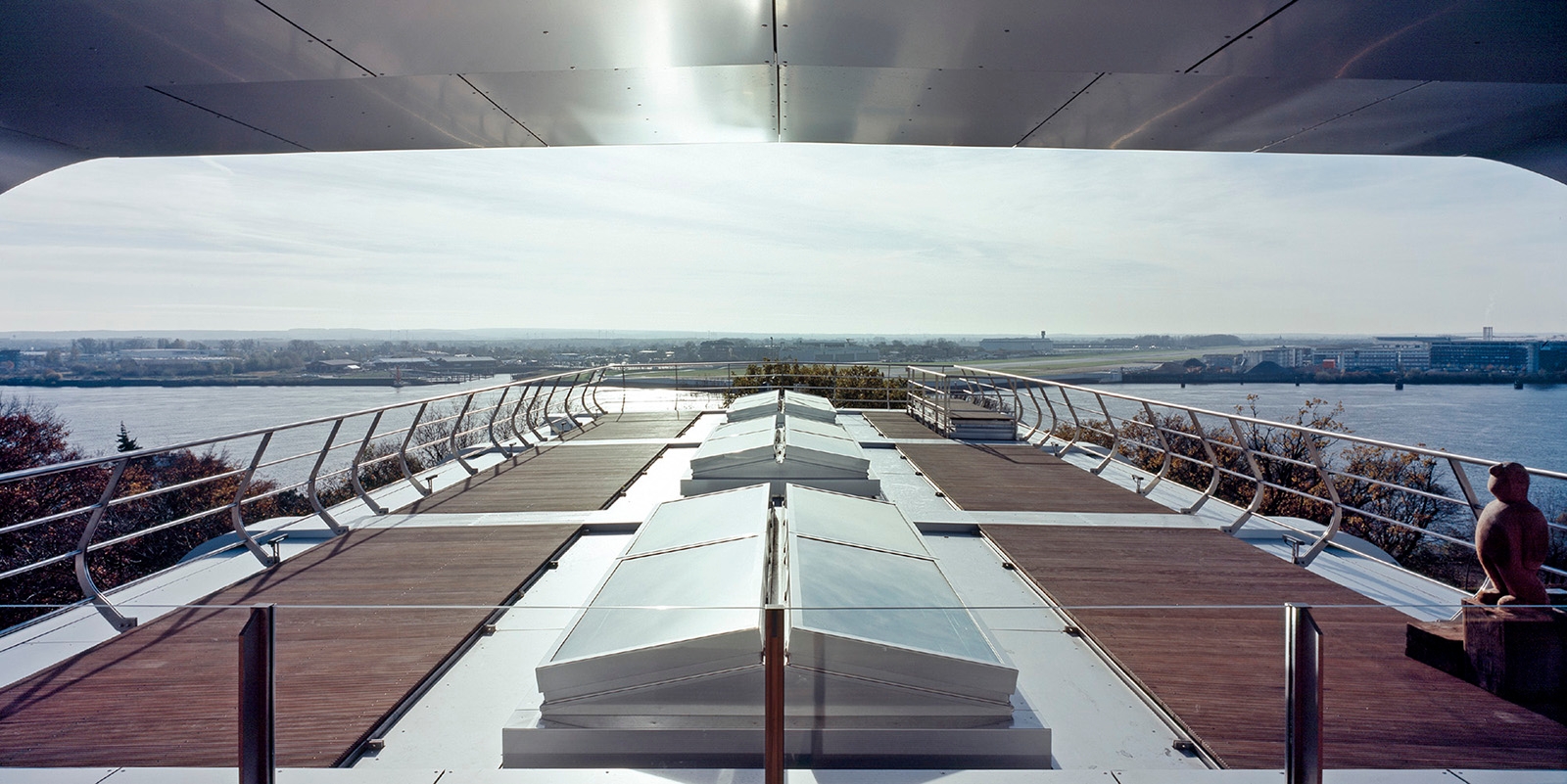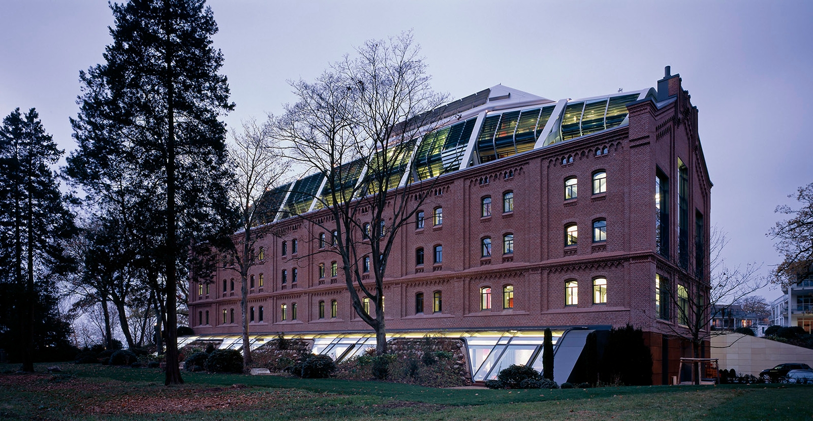 An der Ostfassade des Erdgeschosses wird der ehemalige Hang des Ramée Parks mit der eingeschossigen schrägen Kantine architektonisch wieder aufgebaut bzw. neu interpretiert. Die erhaltenswerten Bäume sind Bestandteil der Gestaltung der Kantine. Der dreigeschossige Neubau entwickelt sich unter der im Bebauungsplan festgesetzten Geländeoberkante westlich der „Neuen Mälzerei“. Konzept ist eine harmonische und funktional auf die Aufgabe ausgerichtete Einbindung eines neuen Baukörpers in die Landschaft. Aus der Verzahnung von unterschiedlichen Geländehöhen entwickelt sich ein „unterirdisches“ Haus. Die entstehende „Welle“ definiert die Kubatur des neuen Bürogebäudes und Sportclubs und ermöglicht eine optimale Belichtung und Ausrichtung zur Elbe.