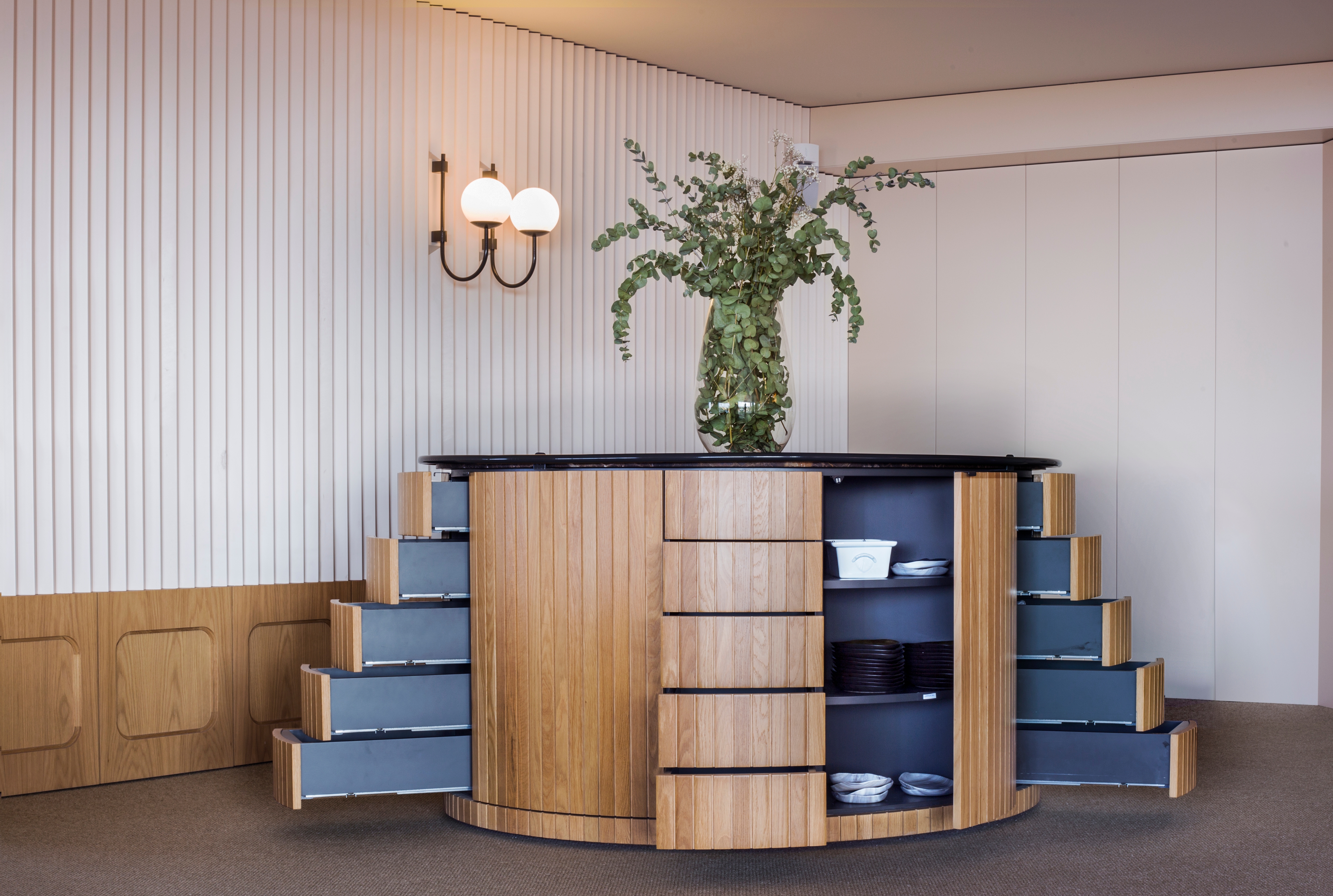 The lighting of the space has been completed by placing multiple lamps on the tables which remind small lanterns. Together with the lighting, the tables, and the long seating booth we also designed four small tables known as guéridon that served as support to the staff. All of them with a circular top made of brown emperador marble and oak details. This ‘trolley service’ is used to hold all cooking items or simply used for support.