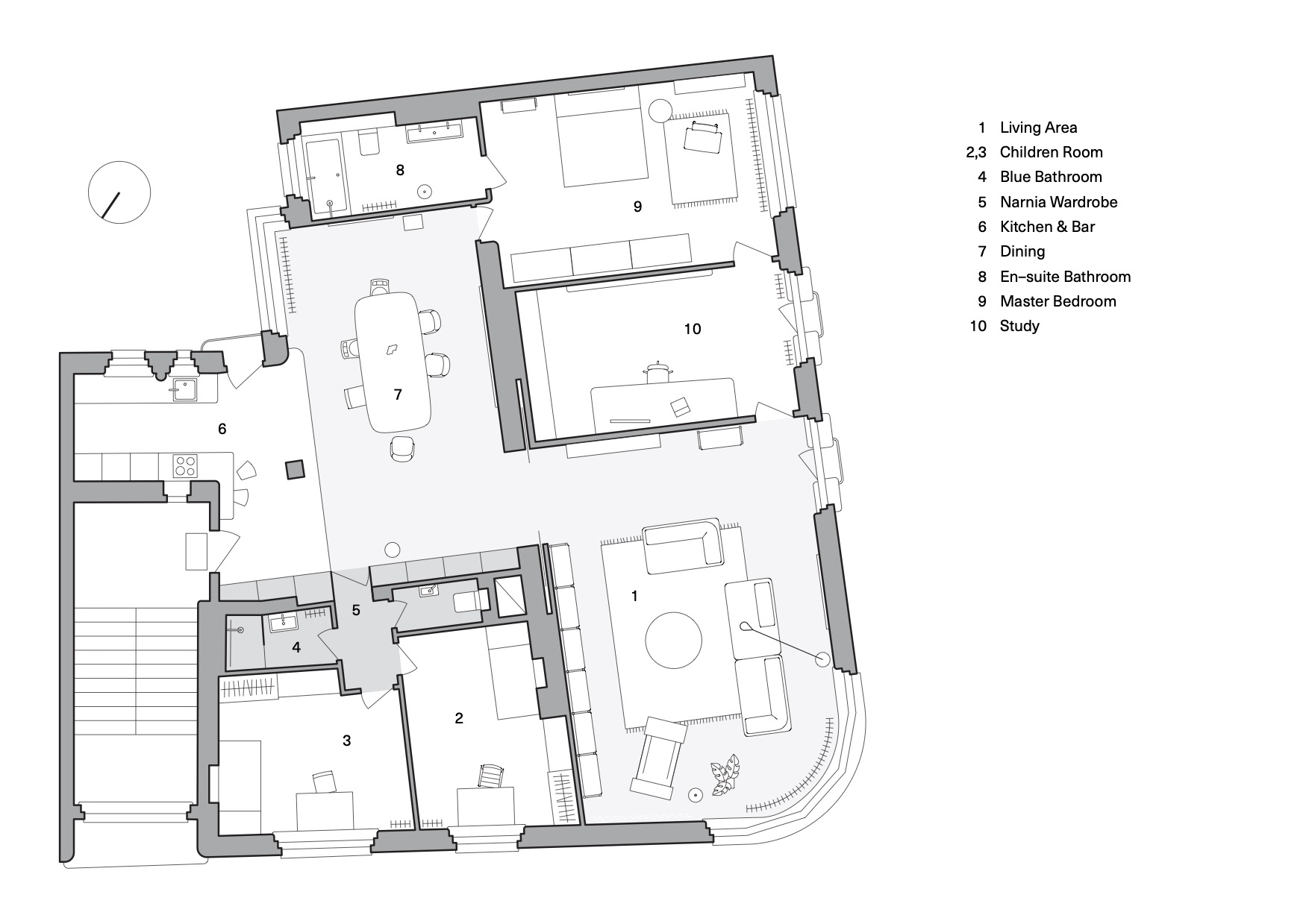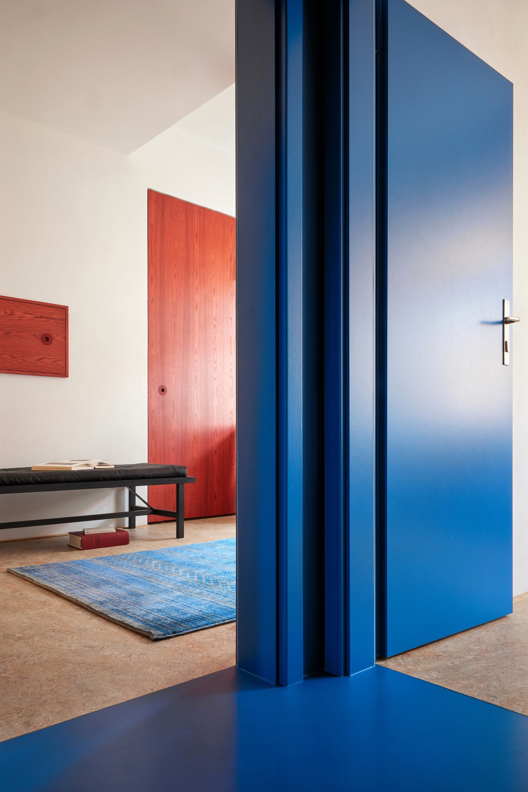 The reconstruction design clearly favours quality over quantity. In order to achieve spatial airiness, the previously separated smaller rooms were merged into larger open spaces – maximizing the common ones where the family spends most of its time together. The children's rooms, on the other hand, are conceived as small, purposeful cells, entered through a large blue Narnia-inspired storage cupboard. The history of the apartment is recalled by a number of original features, such as doorknobs, parquet floors, sliding doors, and the acknowledged original painting in the parents' bedroom. The bedroom has an en-suite bathroom and is also accessible from the study with a small balcony. "The blue wardrobe, and especially the entrance to its bowels, is meant to lead people out of reality into another world, a magical space, to be a filter between the apartment and the children's rooms. It is meant to convey an experience and enhance the imagination. The whole apartment then allows to experience different light situations, thanks to the fact that the light has access to the apartment from all cardinal points and in different ways - through a rounded strip window facing the street, through a window folded over the corner of the courtyard, through an ordinary flat window and also through a series of several windows - these are the characteristics of the corner house and the architecture of the 1930s, we have only tried to reinforce this fact and not to literally lose it," the authors stress.