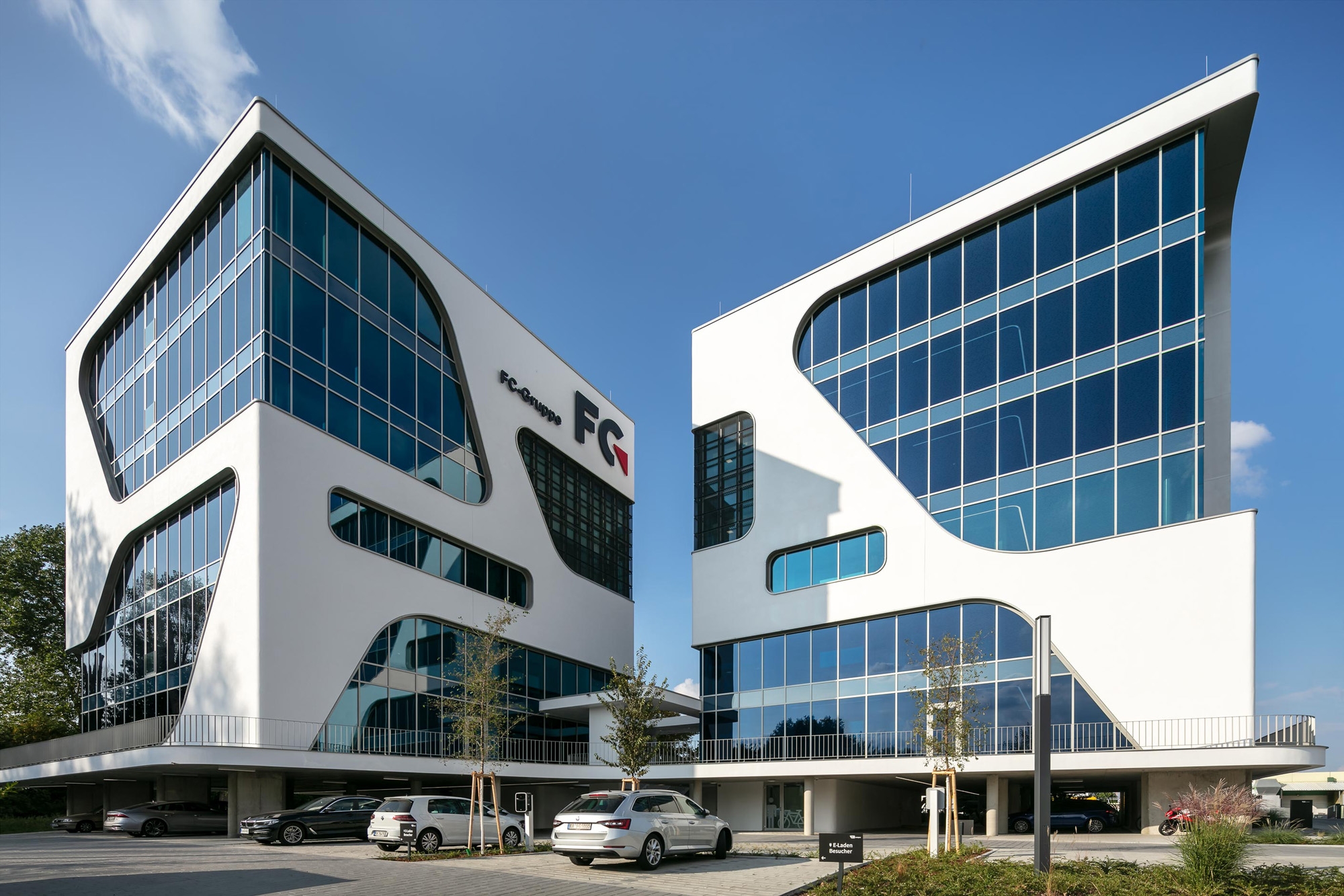 Die FC-Gruppe hat mit Ihrem Campus eine ideale Arbeitsumgebung geschaffen um ihre zwanzigjährige Erfolgsgeschichte fortzuschreiben. Mit zwei versetzte Kuben wurde der Stadteingang an der Autobahnausfahrt Karlsruhe-Nord mit einer ausdrucksstarken Architektur neu definiert und aufgewertet. Die organisch geformten Glasaussparungen prägen das skulpturale Gesamtbild.