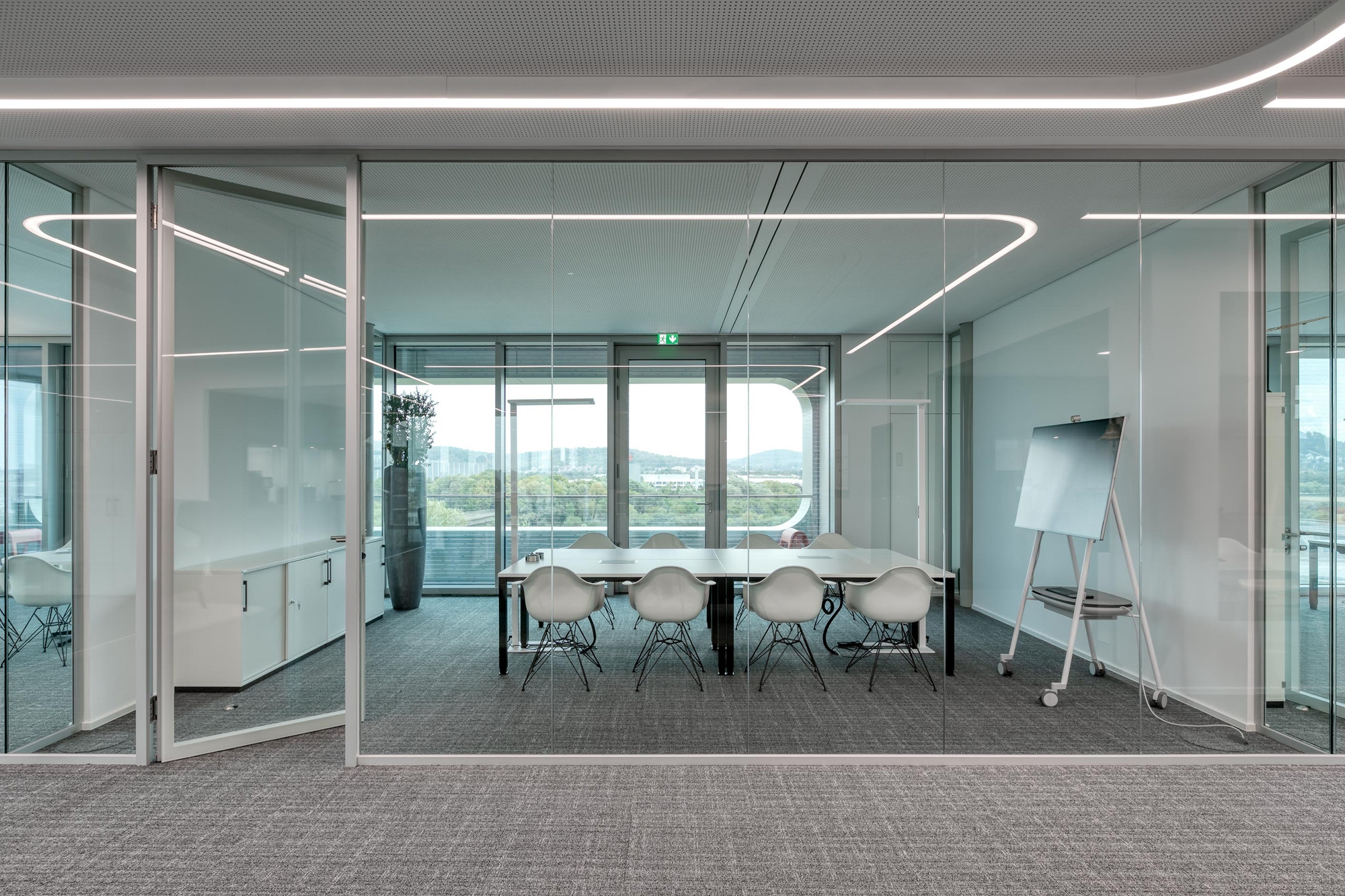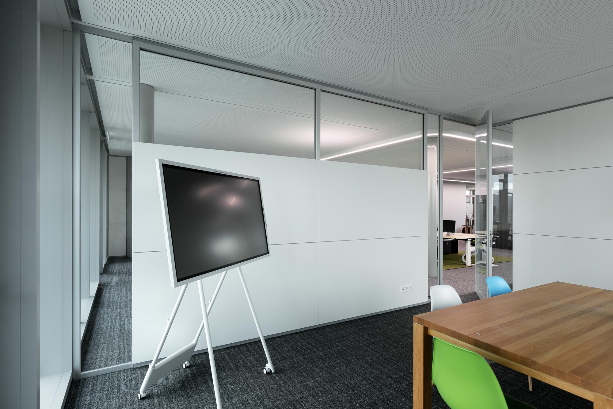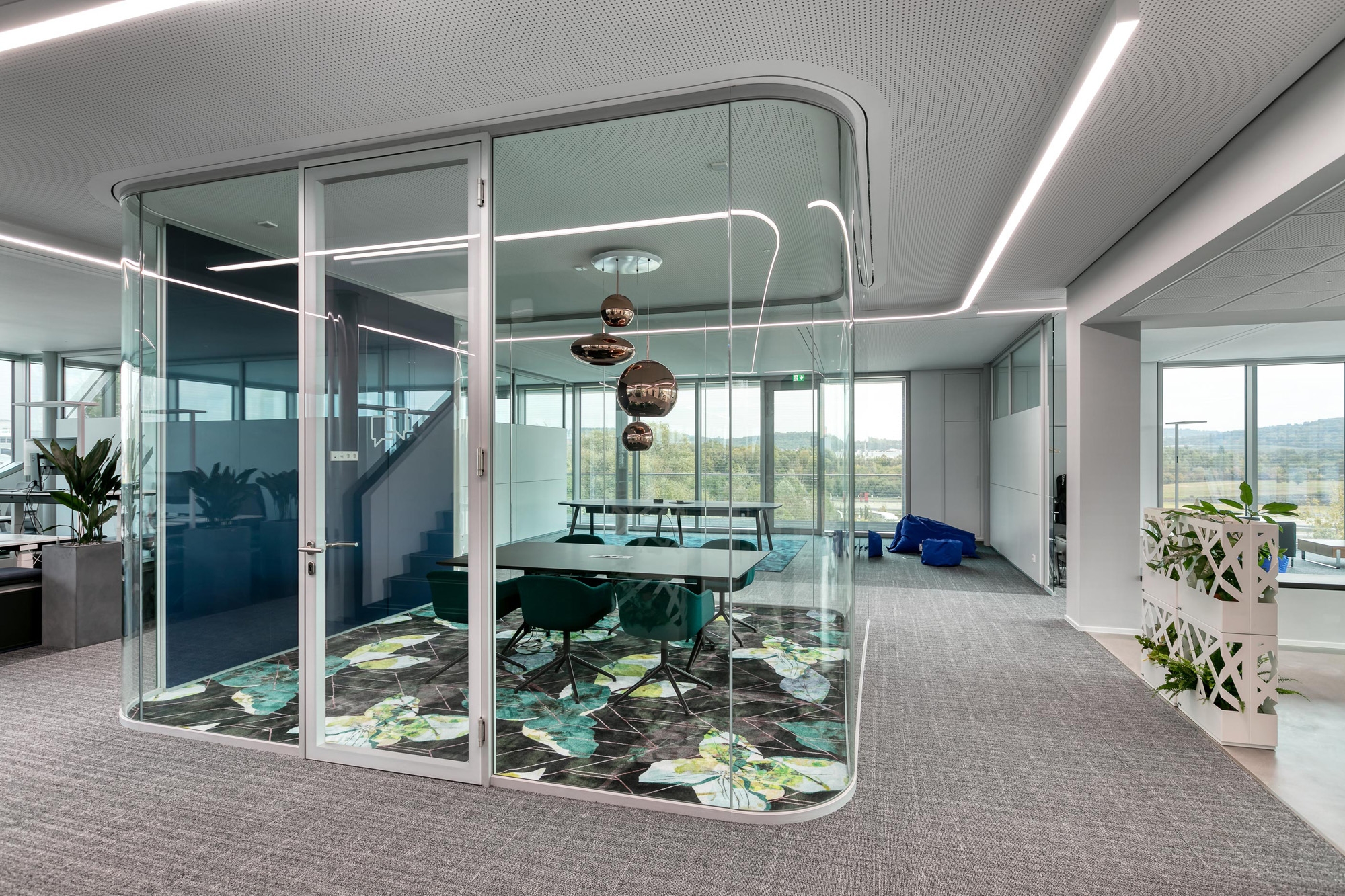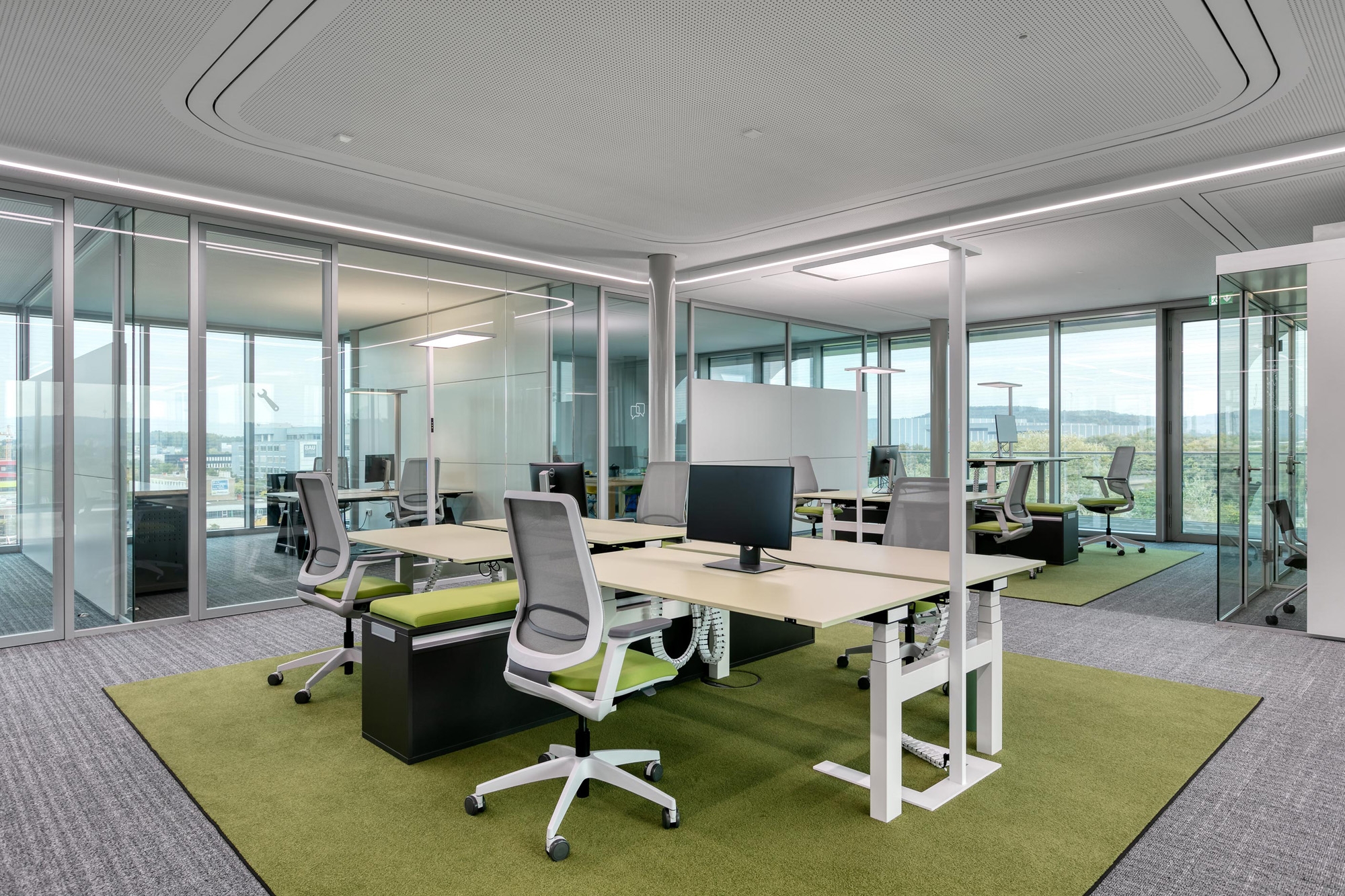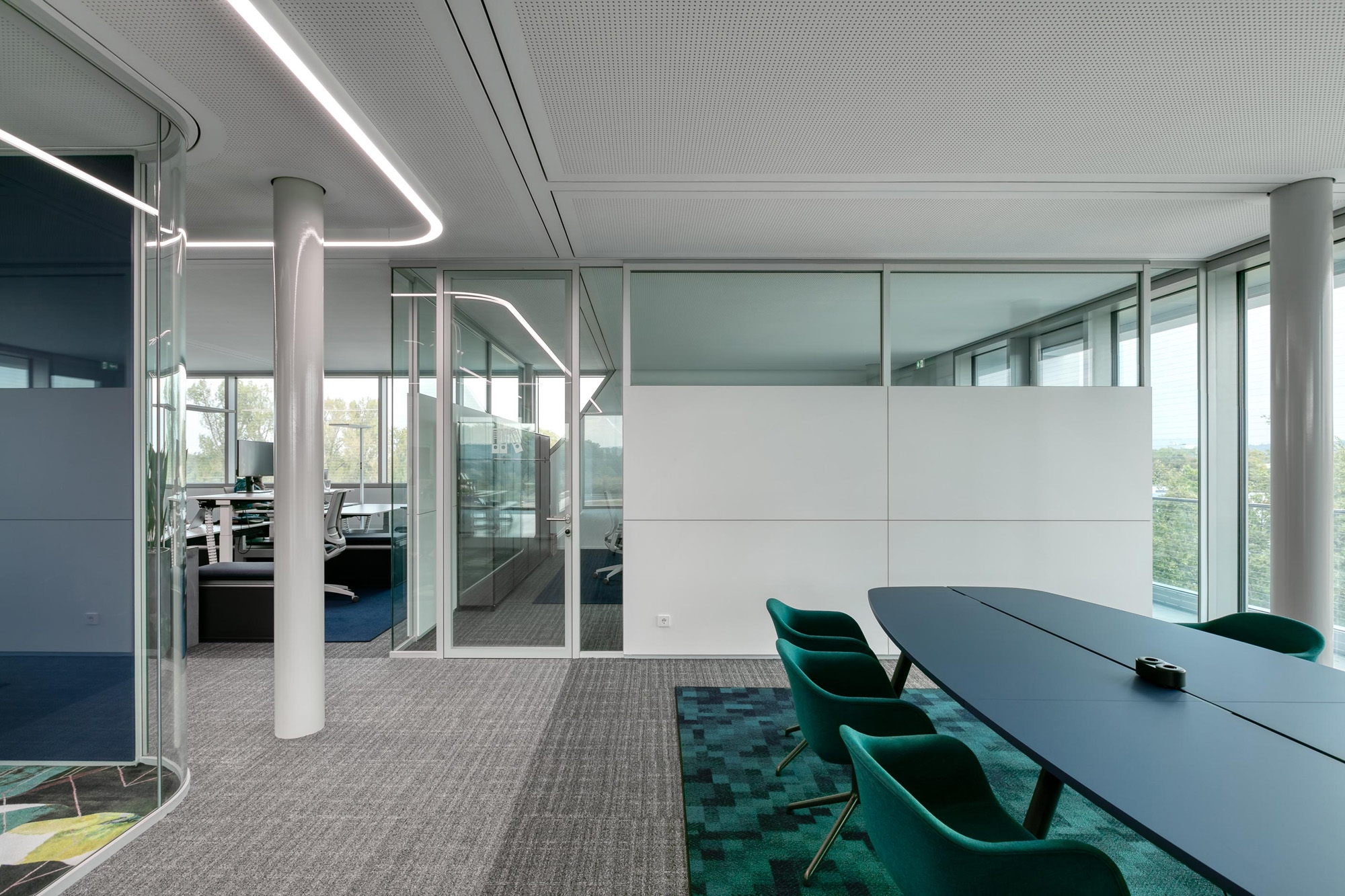 Die Transparenz und Leichtigkeit wird im Innern mit feco-Systemtrennwänden fortgesetzt. Der Karlsruher Systemtrennwandhersteller mit seinem Firmensitz in unmittelbarer Nachbarschaft hat mit der Nurglaskonstruktion fecoplan ein agiles Arbeitsumfeld geschaffen.
