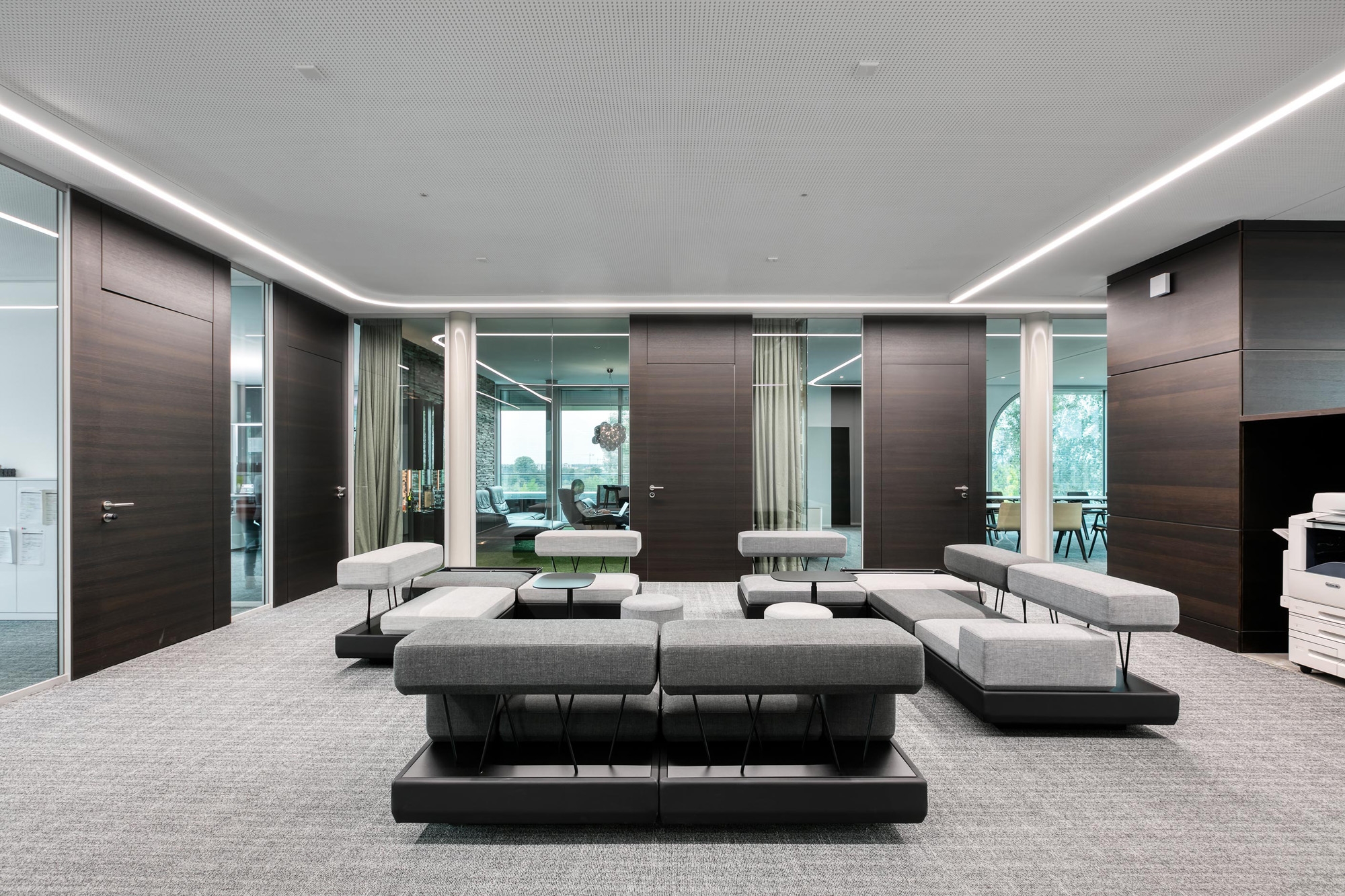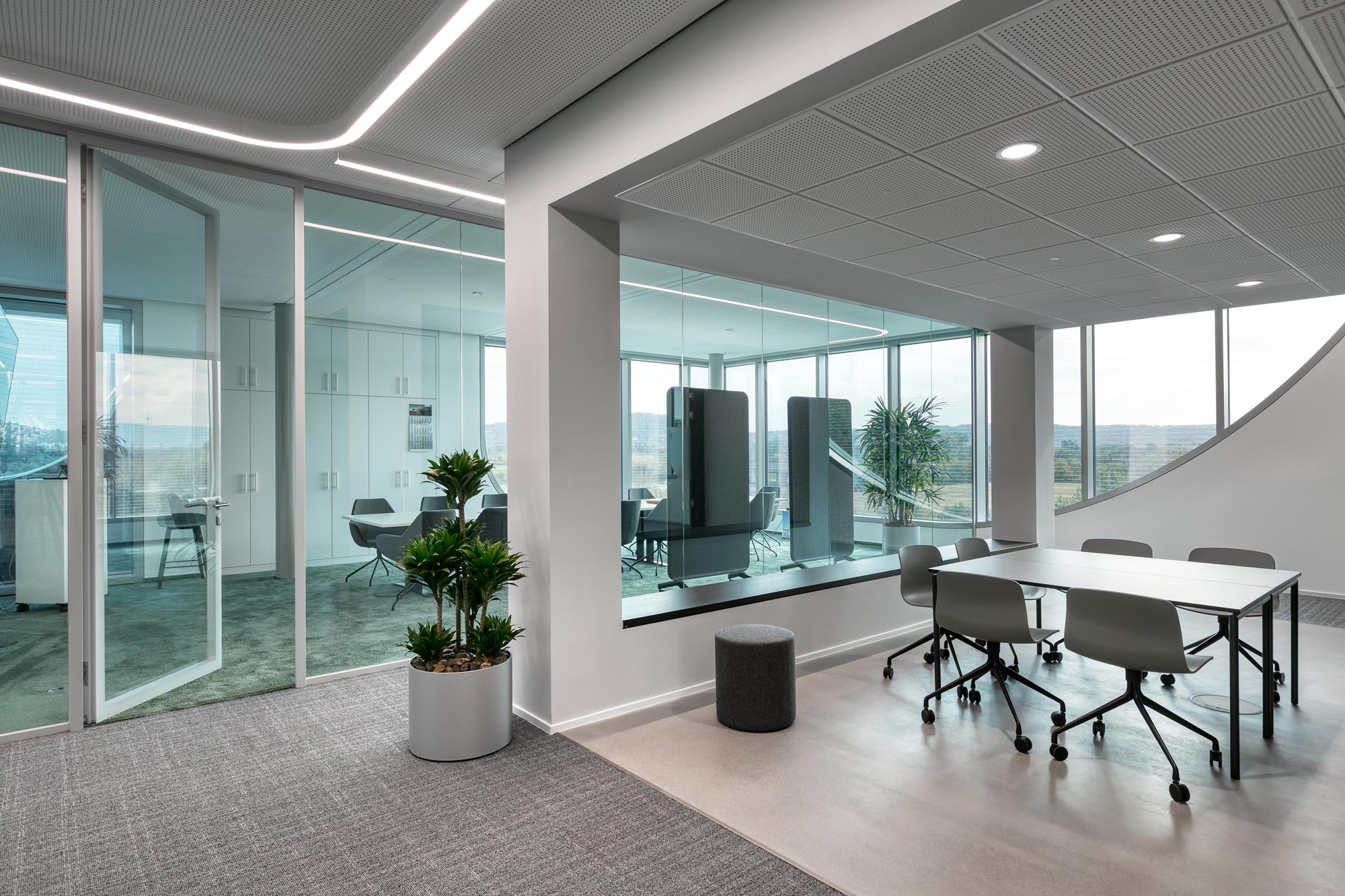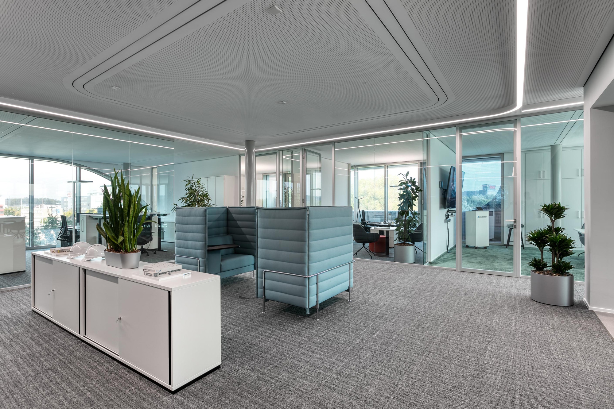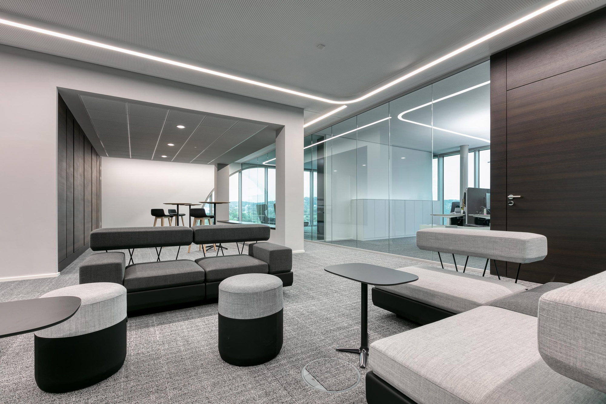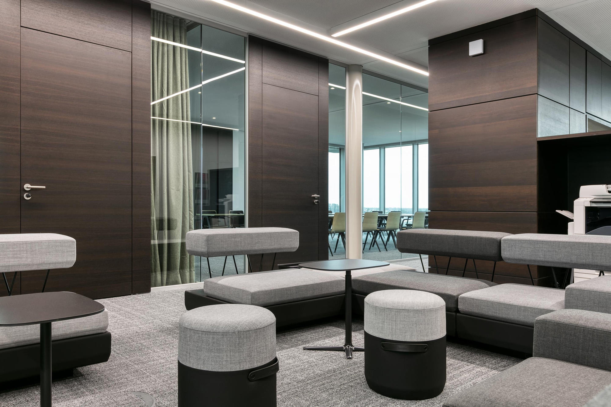 Als leistungsfähiger Objekteinrichtungs-Partner war feco-feederle auch in die Raum- und Möblierungs-Konzeption frühzeitig eingebunden. Die Möblierung mit Produkten des Büromöbelherstellers Brunner aus Rheinau wurde über feco-feederle abgewickelt. Die Teeküchen bieten mit Eiche furnierten Stehtischen und Hockern aus der Serie Brunner Hoc kommunikative Inspirationsflächen. Im Konferenzgeschoß lädt die Mittelzone mit einer Brunner Plot Sitzlandschaft zu informellen Gesprächen ein.