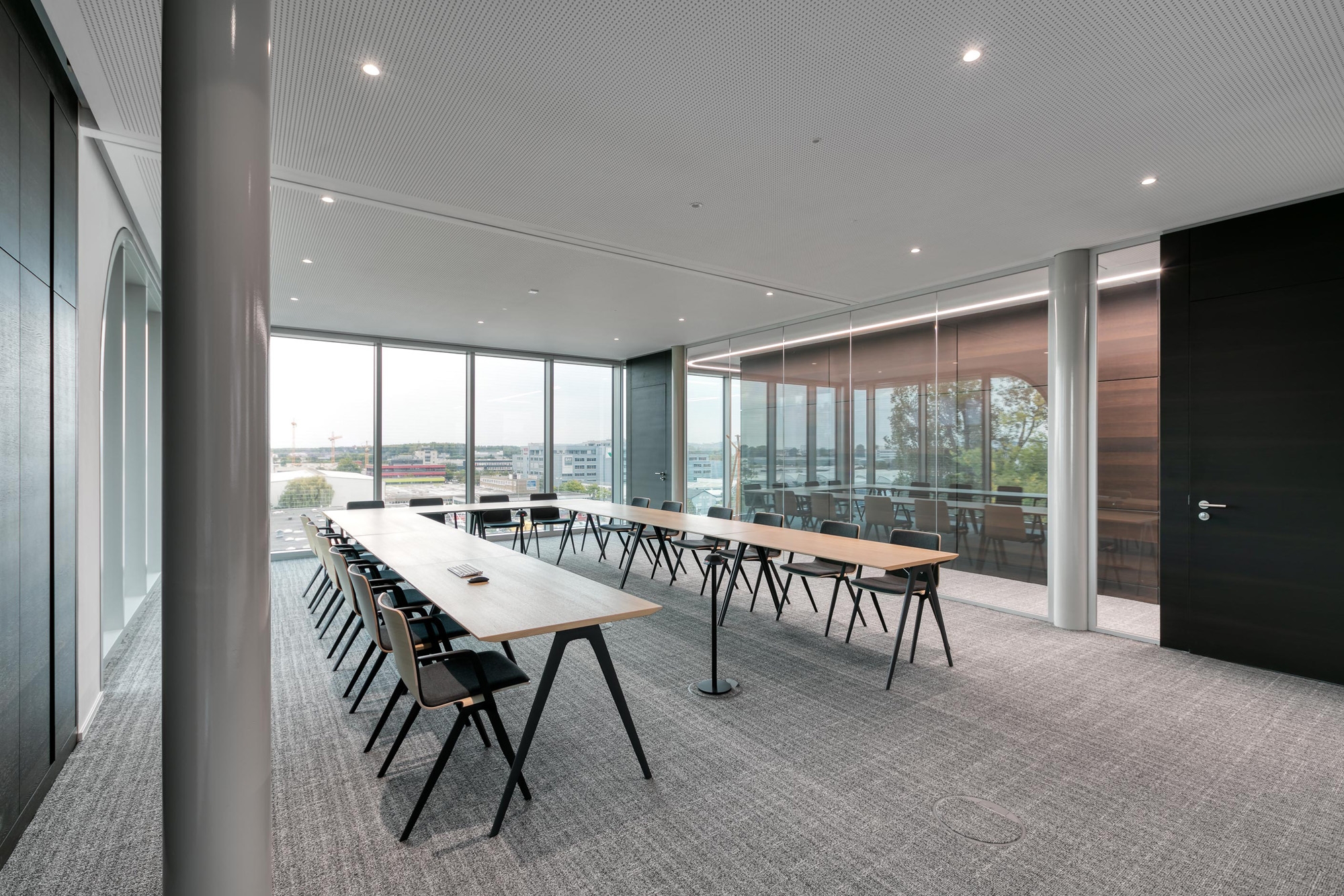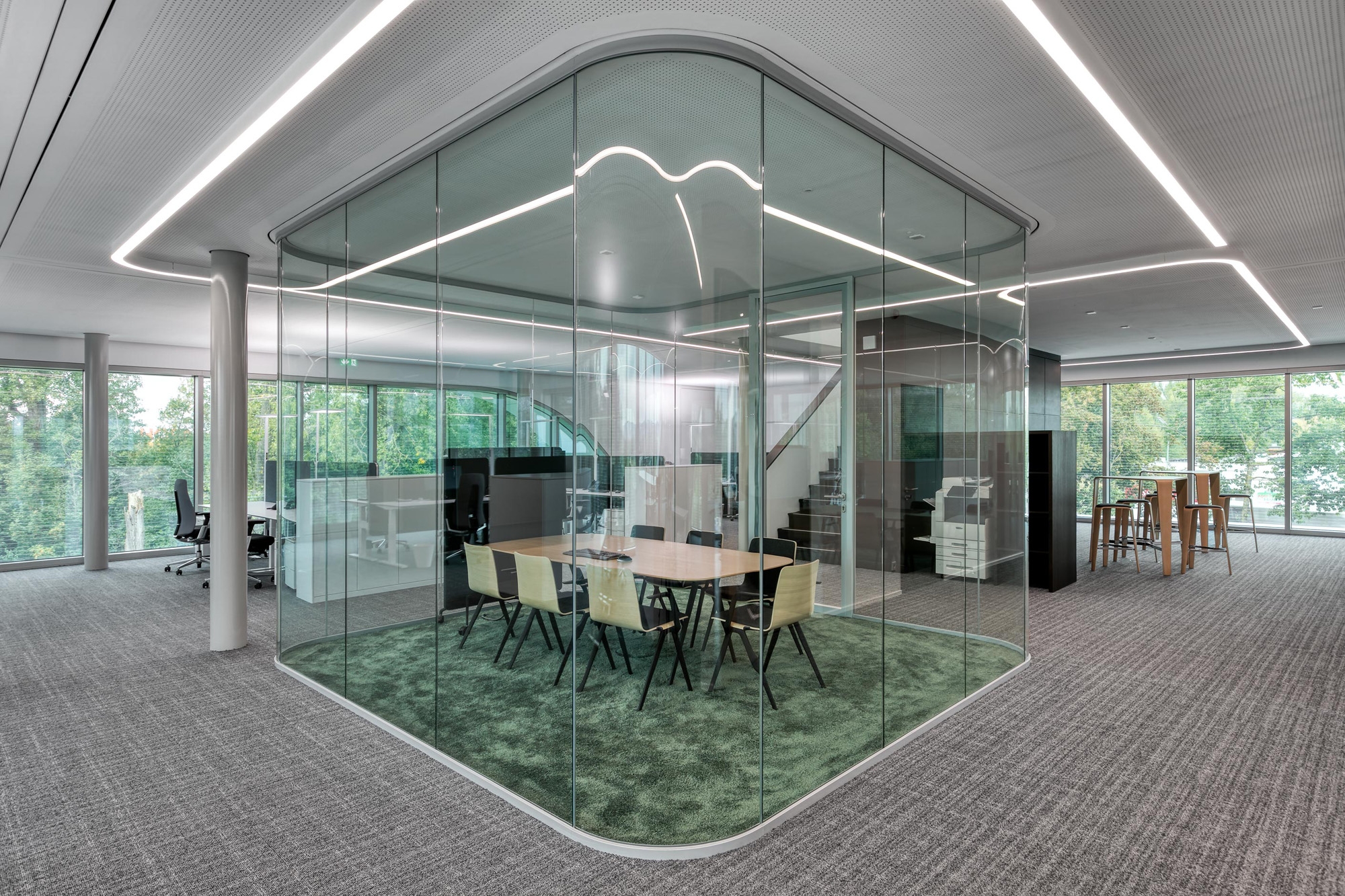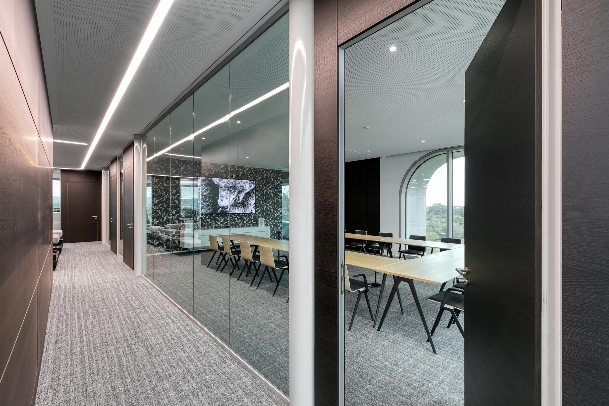 Die beidseitig flächenbündigen Holz-Türelemente fecotür H105 mit Rw,P 42 dB sind mit Räuchereichefurnier mit horizontalem Verlauf in bildhafter Abwicklung aus der eigenen Produktion belegt. Im 1. OG bietet ein Besprechungsraum mit gebogenen Gläsern Diskretion ohne die für die Aussenwahrnehmung wichtige Transparenz zu stören.