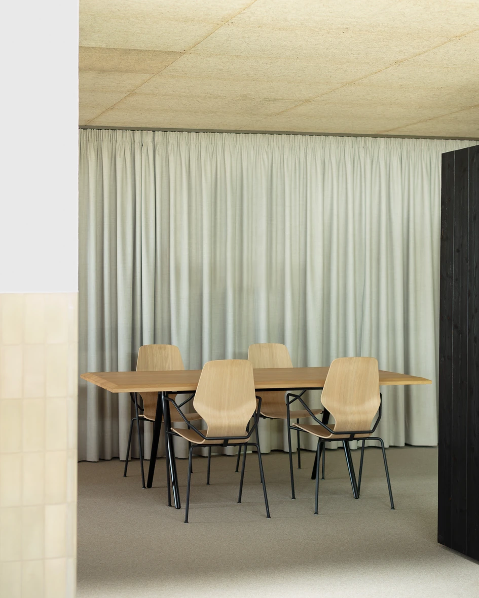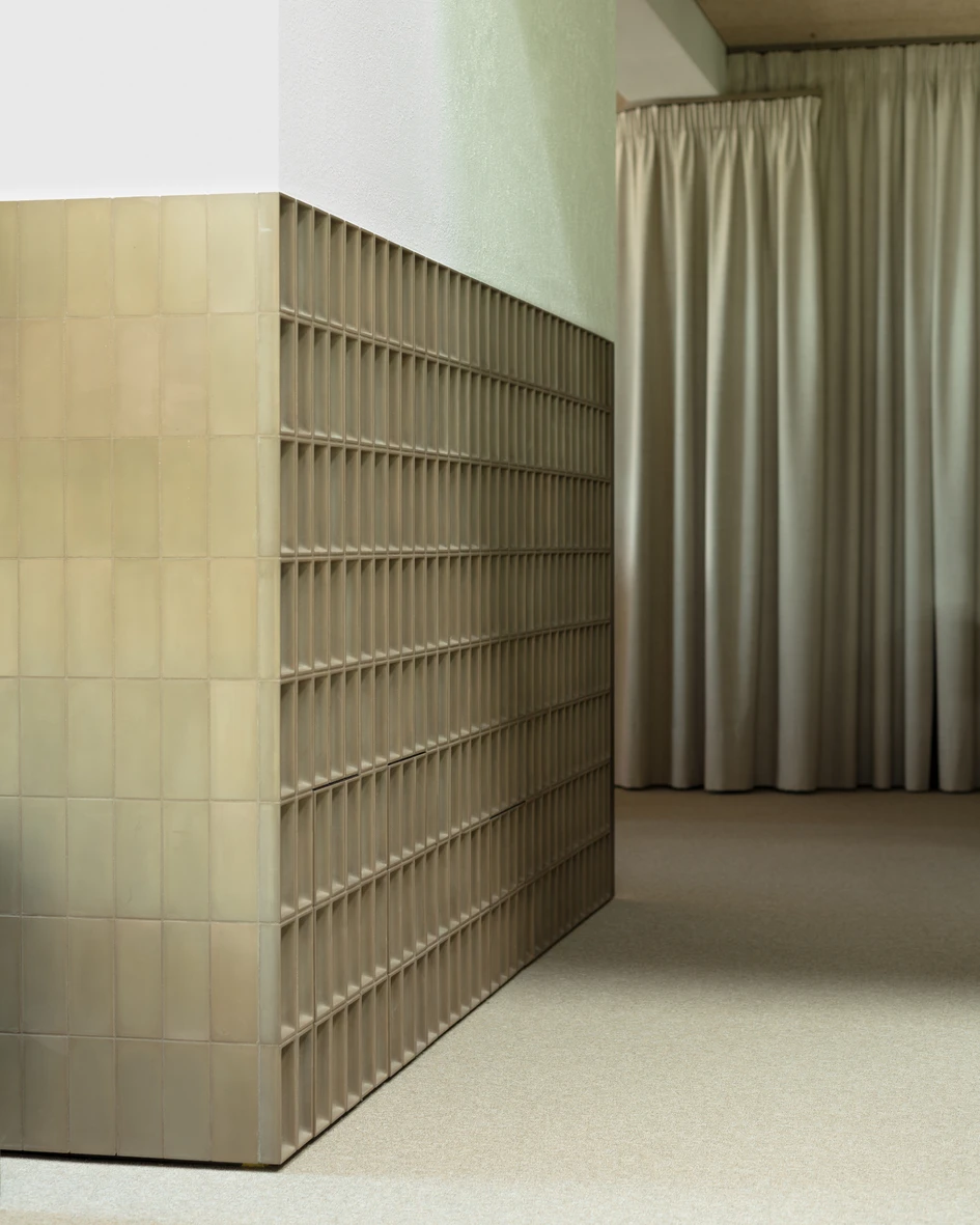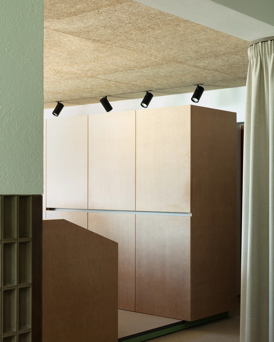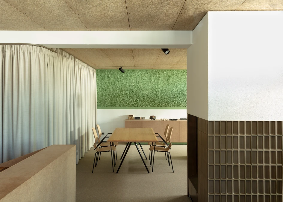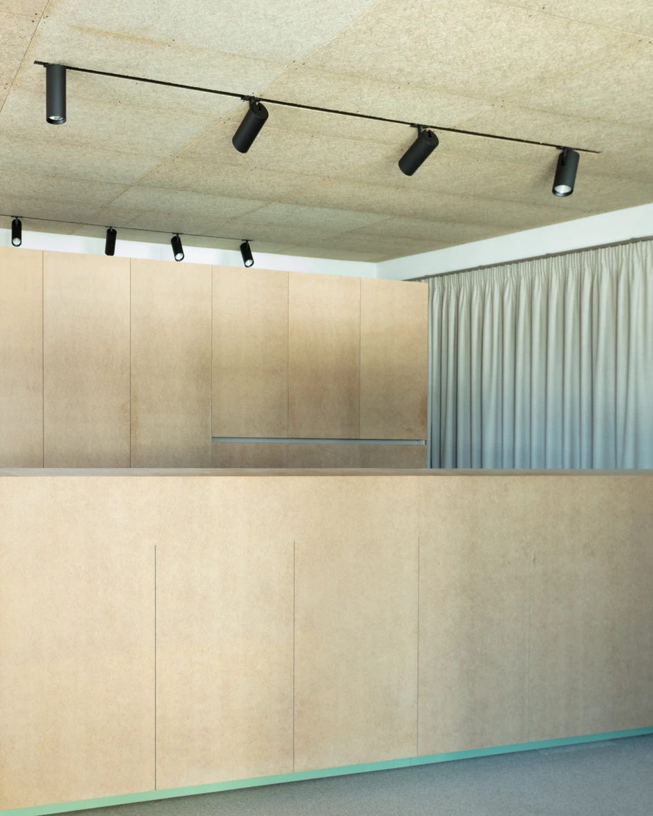 An ashen-colored carpeting, oiled MDF furniture, Heraklith ceiling and wall panels, a coarse green plaster and an interior roof structure painted in black elicit forever archaic motifs associated with "re. Suspended below the vaulted roof, two metal rings – painted black – illuminate the showroom, eliciting the cozy atmosphere of an open "replace. The brass used for the logo, the exhaustion hood and the bar nook creates subtly glistening highlights.