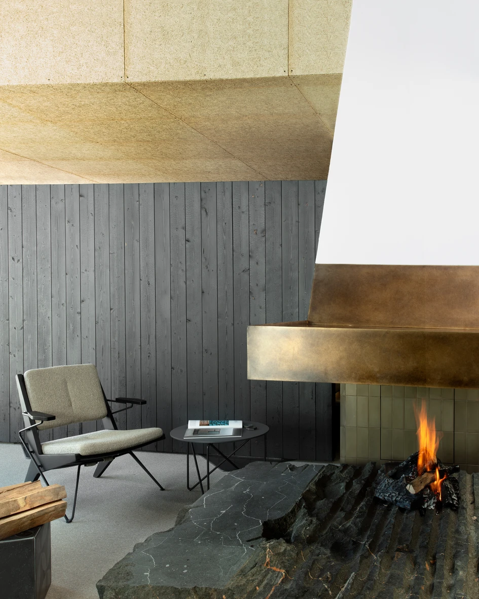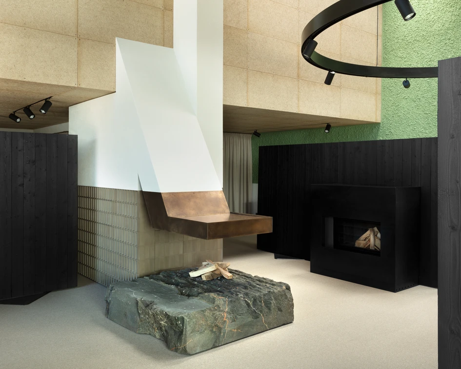An open hearth – gathering site to mankind since the beginning of time - stands at the center of the showroom, becoming its essential element. Four charred wooden stage walls laid-out orthogonally around the "replace form the backdrop for the displays of stoves and tiles. In their midst, sits complacently heavy the hearth’s monolith rock – whispering tales of times long past – almost unprocessed, primal and raw. Rising above, the exhaust hood waits patiently its turn only to surrender to the chimney.