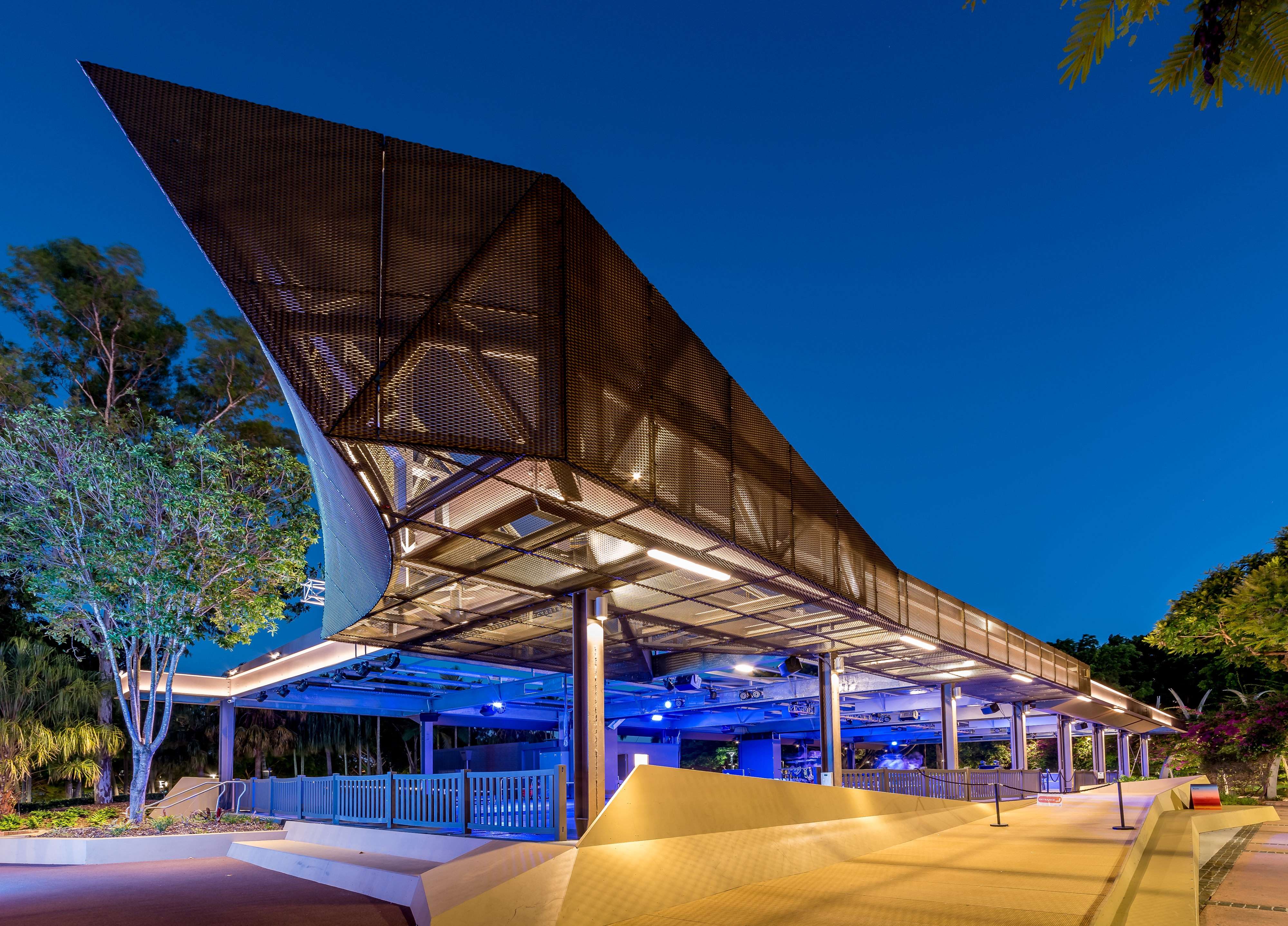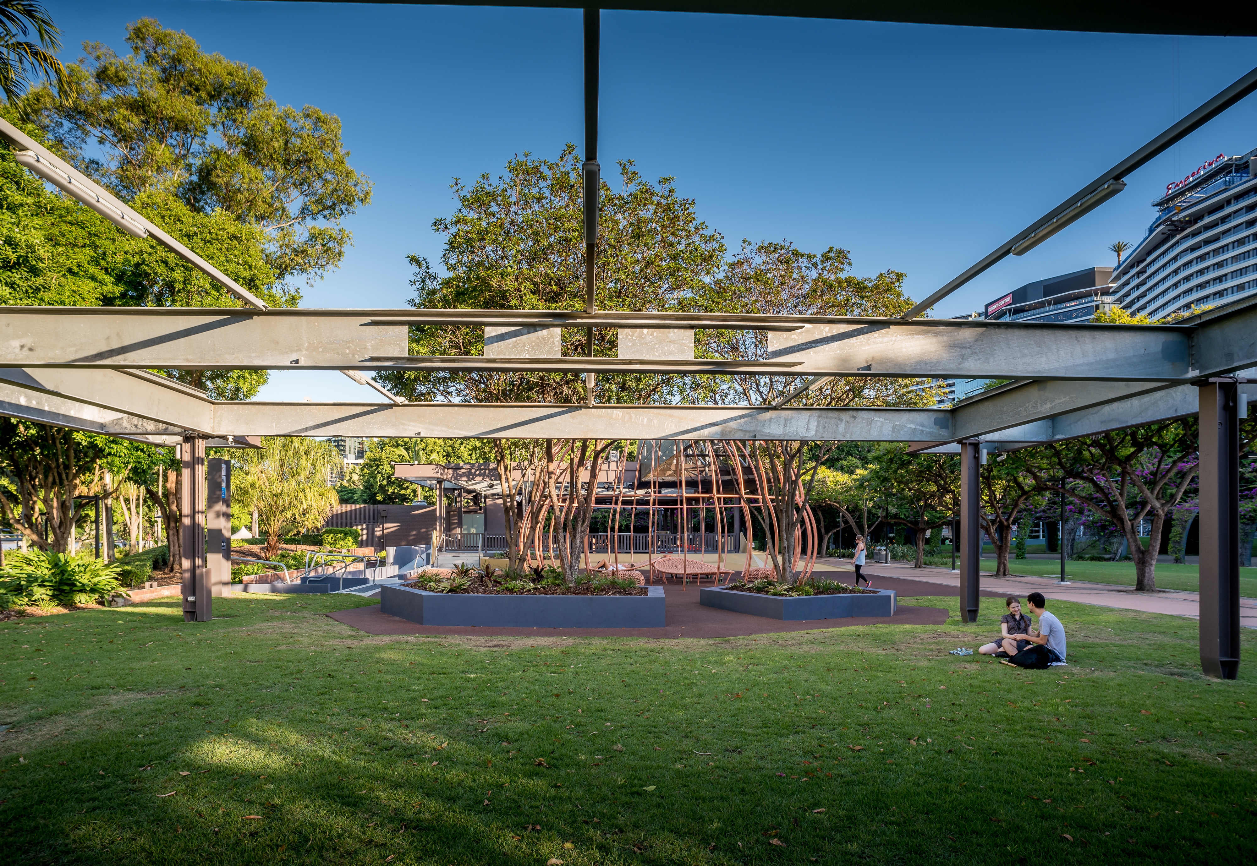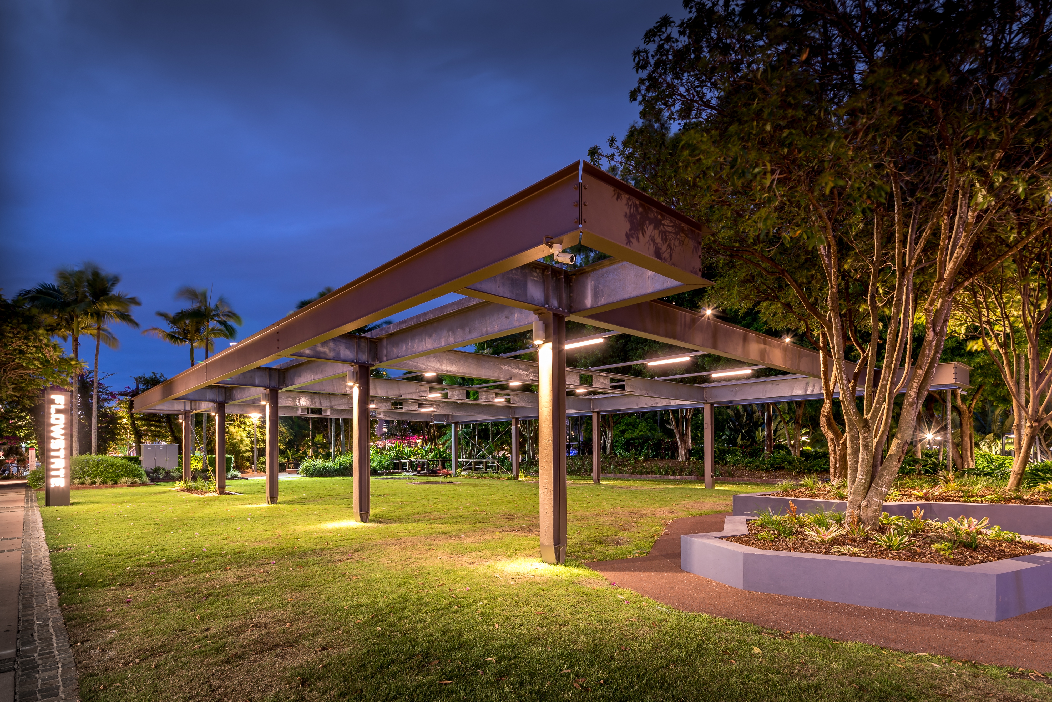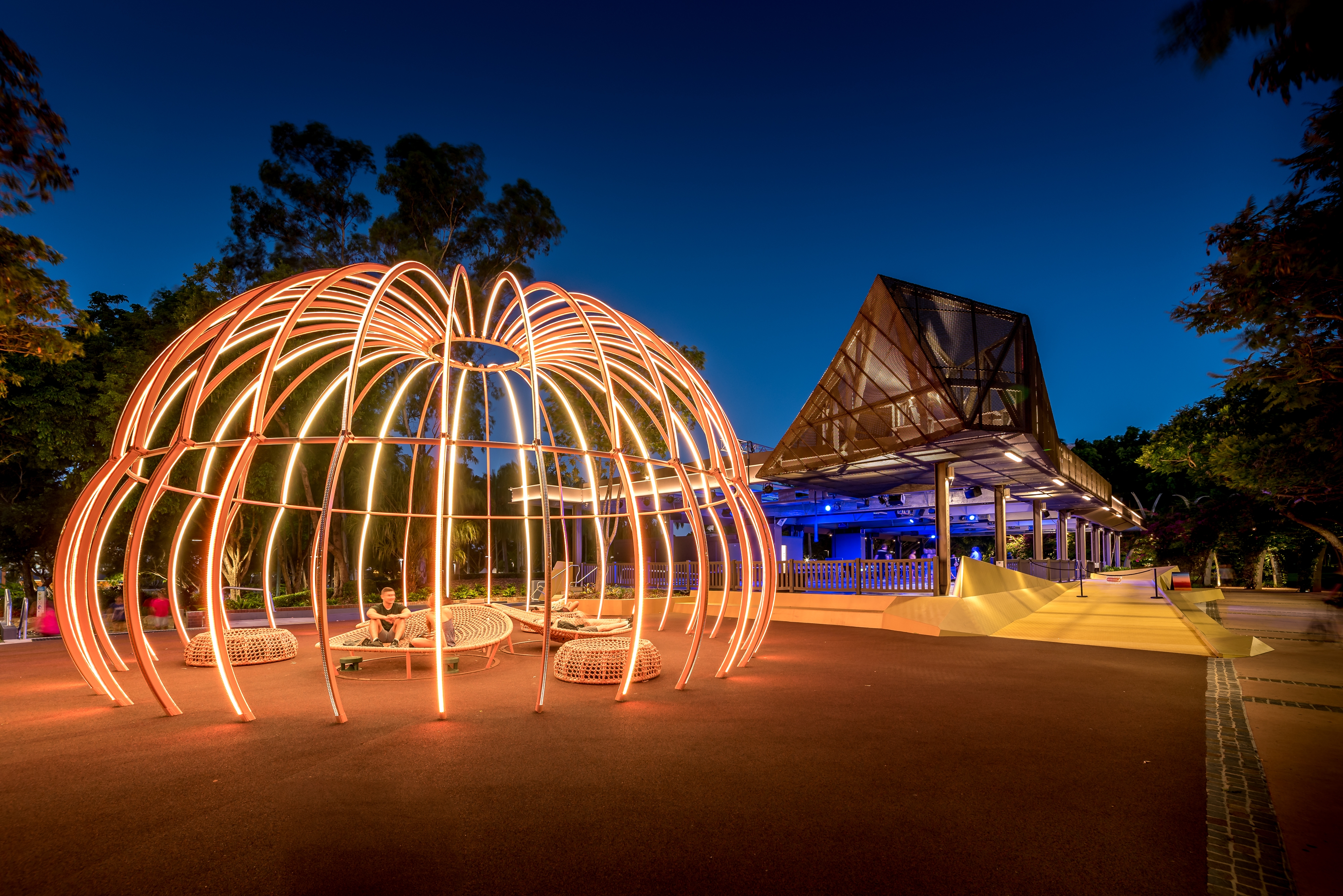 The first significant redevelopment in the South Bank Parklands since the award-winning River Quay in 2011, it provides a tangible demonstration of creative urban recycling in the heart of the precinct. The new area comprises of three distinctive experiences including a grassy relaxation zone, an immersive digital installation, and a vibrant performance pavilion complete with theatre curtains and technical lighting and sound equipment.