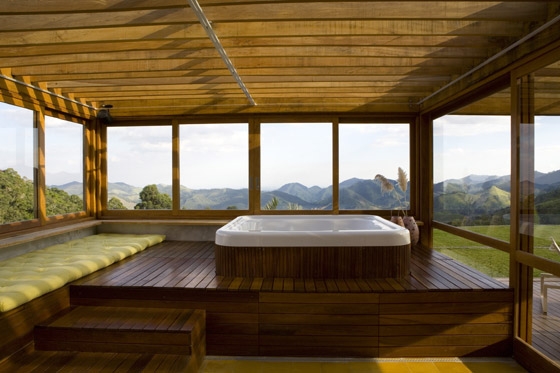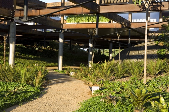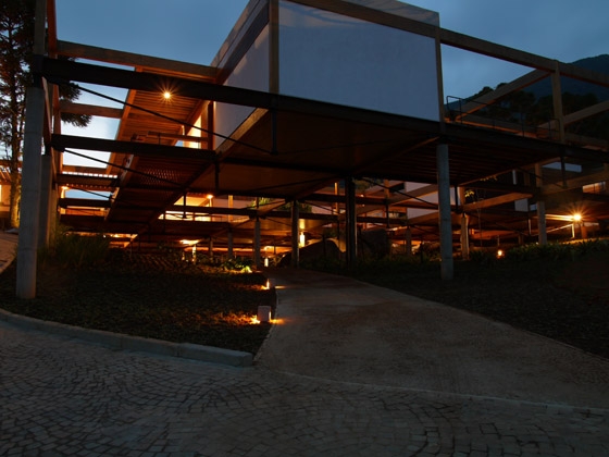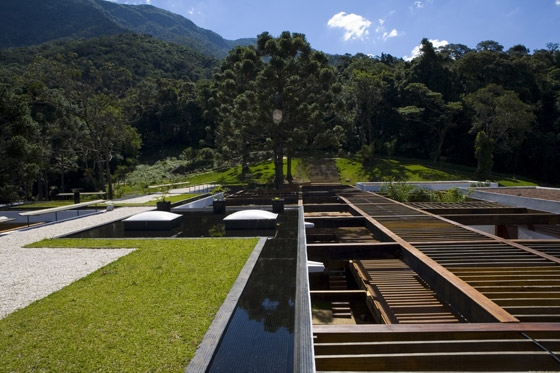 Special attention was paid to the landscape design. Considering the astonishing surroundings, it was quite difficult to plan the intervention. Distant a 2-hour-trip from São Paulo, the house itself is a great actor in this sense, trying not to ‘offend’ nature, neither trying to disappear. Three scales were defined in the 65,000m² area, already devastated about 30 years ago for cattle raising, which was the only open part of a 500,000m² farm. The other 435,000m² have remained jungle, inhabited by wild animals. We understood there should be a transition from the open area to the forest. Native species were selected, specially fruit trees to attract birds and local ‘Muriqui’ monkeys. The second landscape intervention scale creates a ‘park’, where paths, decks with benches and plants stimulate users to walk and glance at the most beautiful views. The third scale is the rooftop garden and the garden in the buildings’ immediate surroundings.