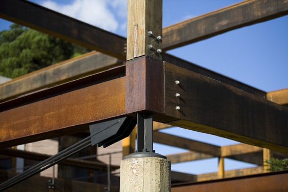 - in the use of materials: cor-ten steel (recyclable and maintenance-free) and local materials such as rocks from the site were used. The rocks were removed from the foundations during soil preparation and were carved in-site. For the interior flooring we chose a traditional unexpensive cement tile, and invited an Artist to design it. Making art part of the building means to revive the classic partnership between architects and artists from Brazilian modern architecture. Other materials were used such as bamboo flooring, paint-free wall finishings, local granites etc.