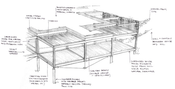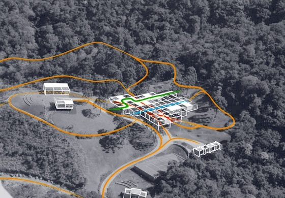 This house is a fusion experience. Actually, there is no house. It’s an inhabitable garden, nature and architecture intrinsically meshed one into another, yet clearly showing the role played by Nature and by construction. Clear, precise, the wooden grid fits into a small valley to promote the spot’s original ‘function’: the house floats over the paths to the hill’s summit, the jungle and the river. Suspending the house above this spot is therefore a means to keep the site’s original routes and to create new ones. It makes possible to walk underneath the grid to find the river, and on the long deck or the green roof that cross the valley and connect jungle and hill.