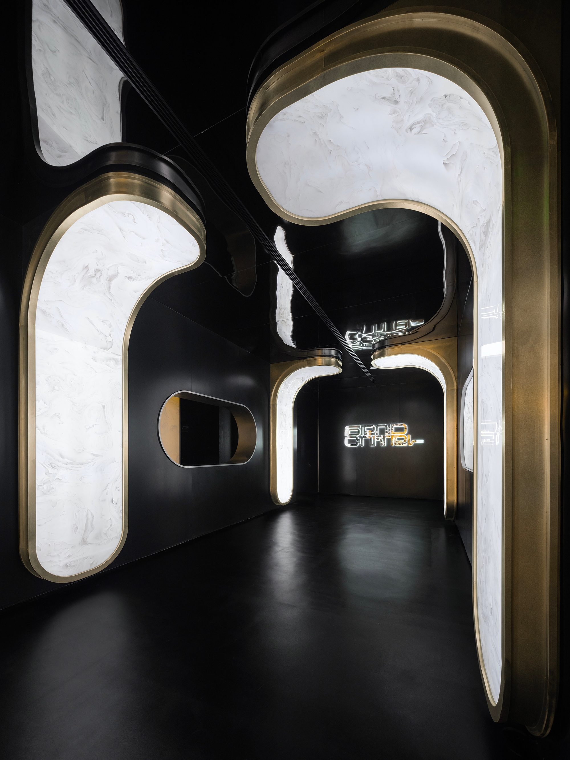 The big hall features the hip-pop music style with a strong sense of artistry and technology, hence bringing an avant-garde, futuristic spatial experience. In contrast, the small hall is dominated by the house & techno music style, full of immersive lighting and shadows, which produces a film-like, retro atmosphere. Both mirrored spatial scenes take into account the needs of different consumer groups.