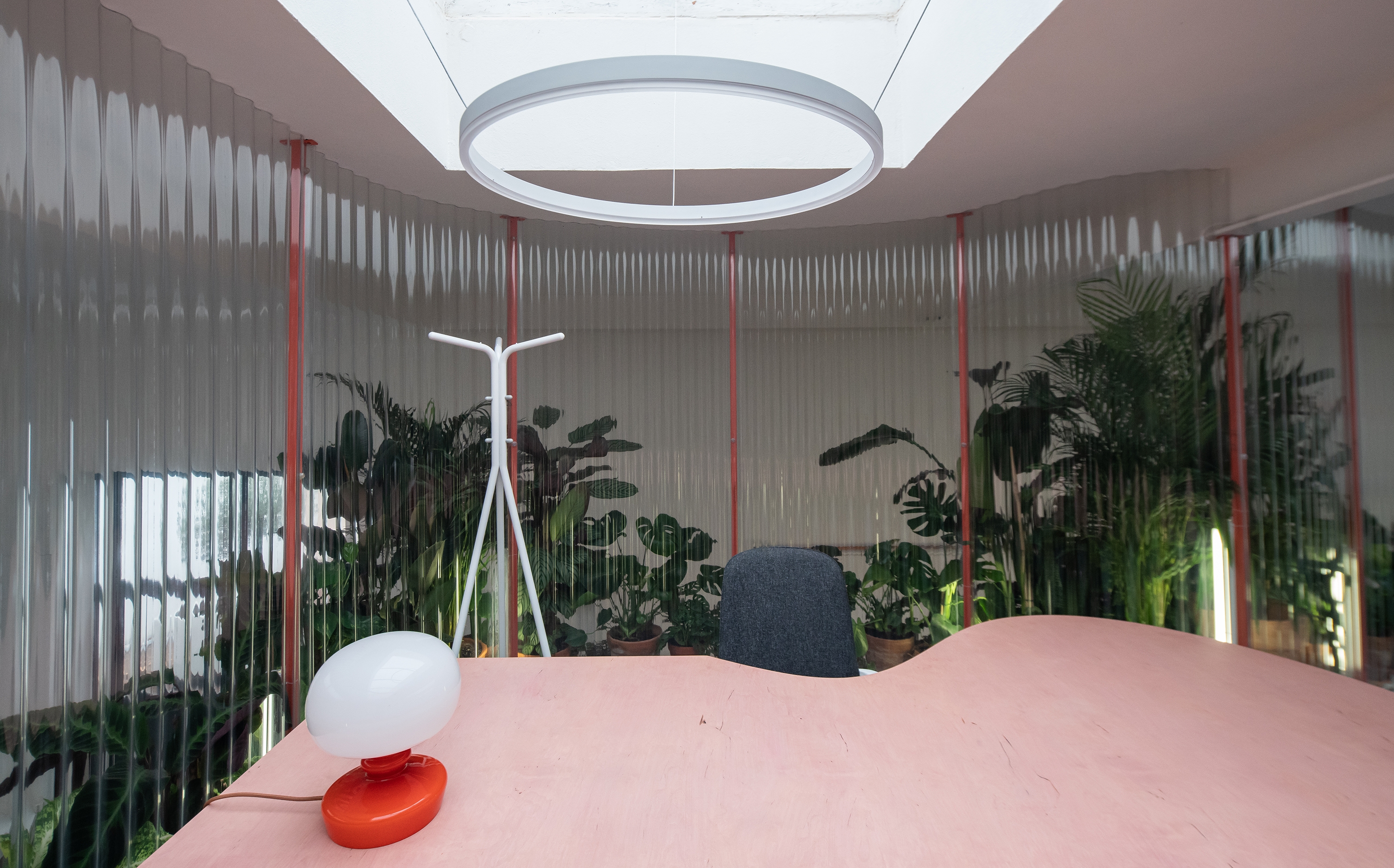 Taking advantage of the overhead natural light, a translucent duplex object allows light through to the various functions of the hub, all integrated and connected within the unit.